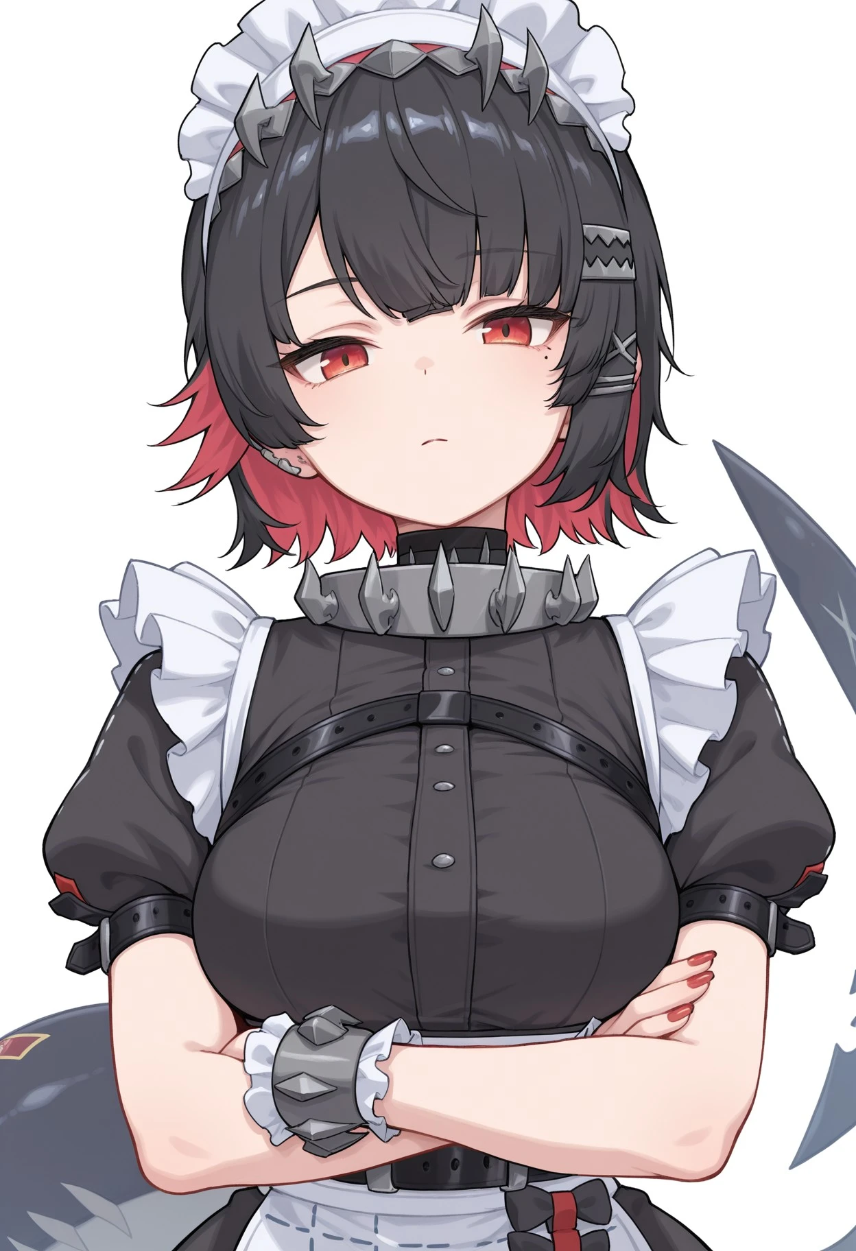 black hair, red eyes, colored inner hair, short hair, mole under eye, red eyes, hairclip, tail, red nails