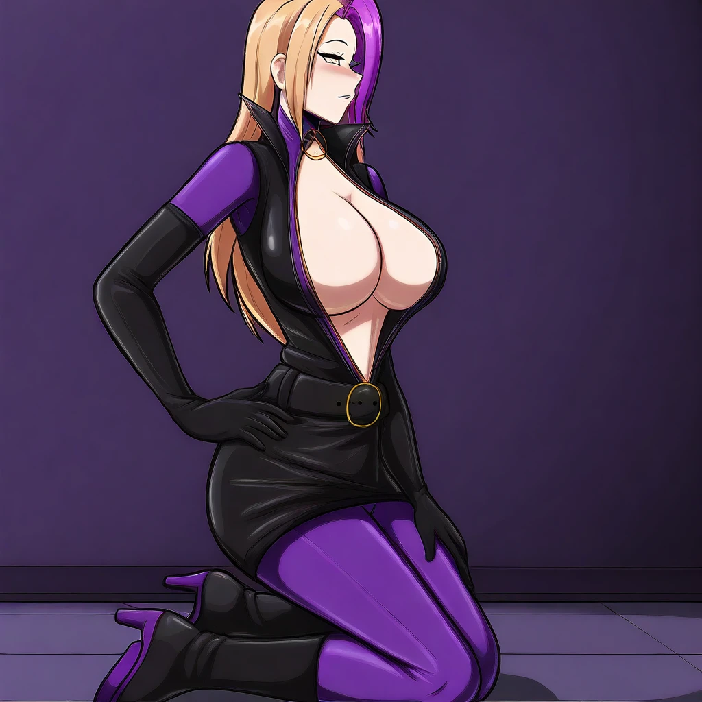 black dress, purple catsuit, centre-opening, black belt, purple latex pantyhose, kneehigh boots, black elbow gloves,
