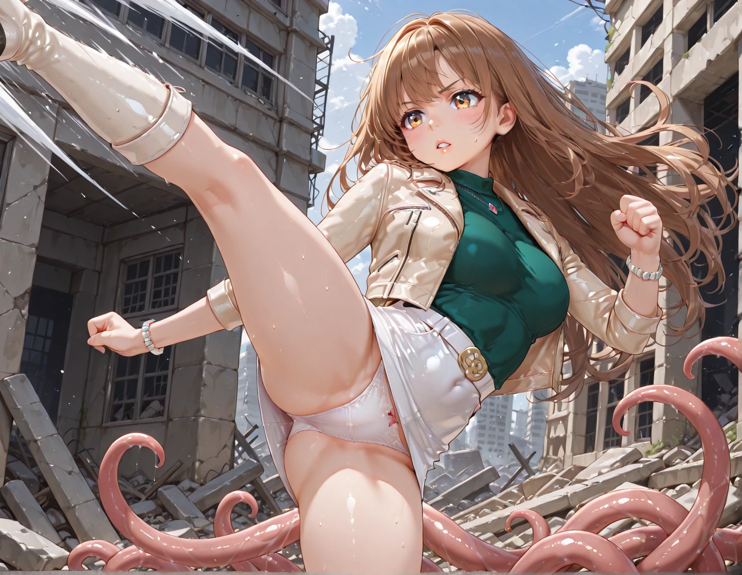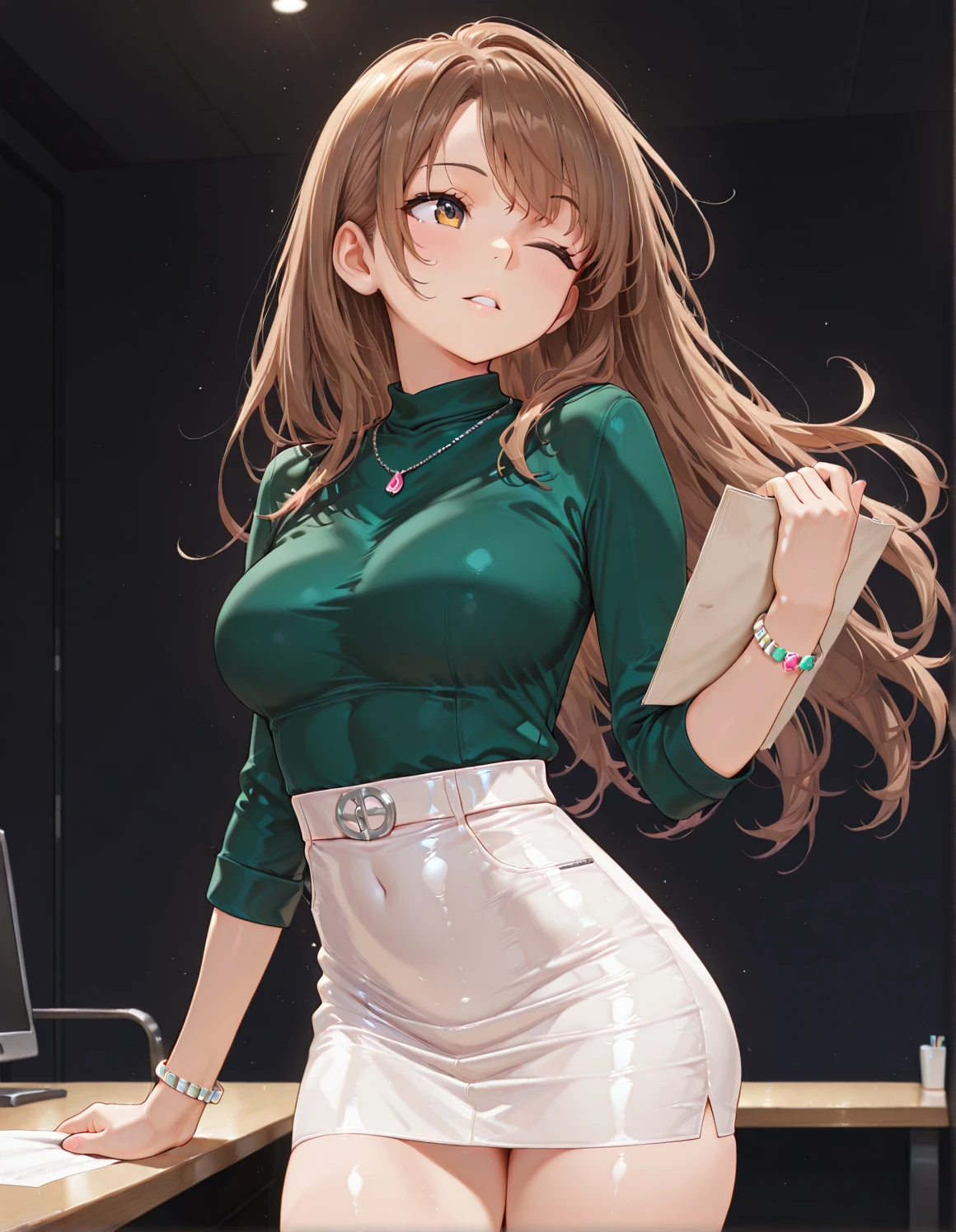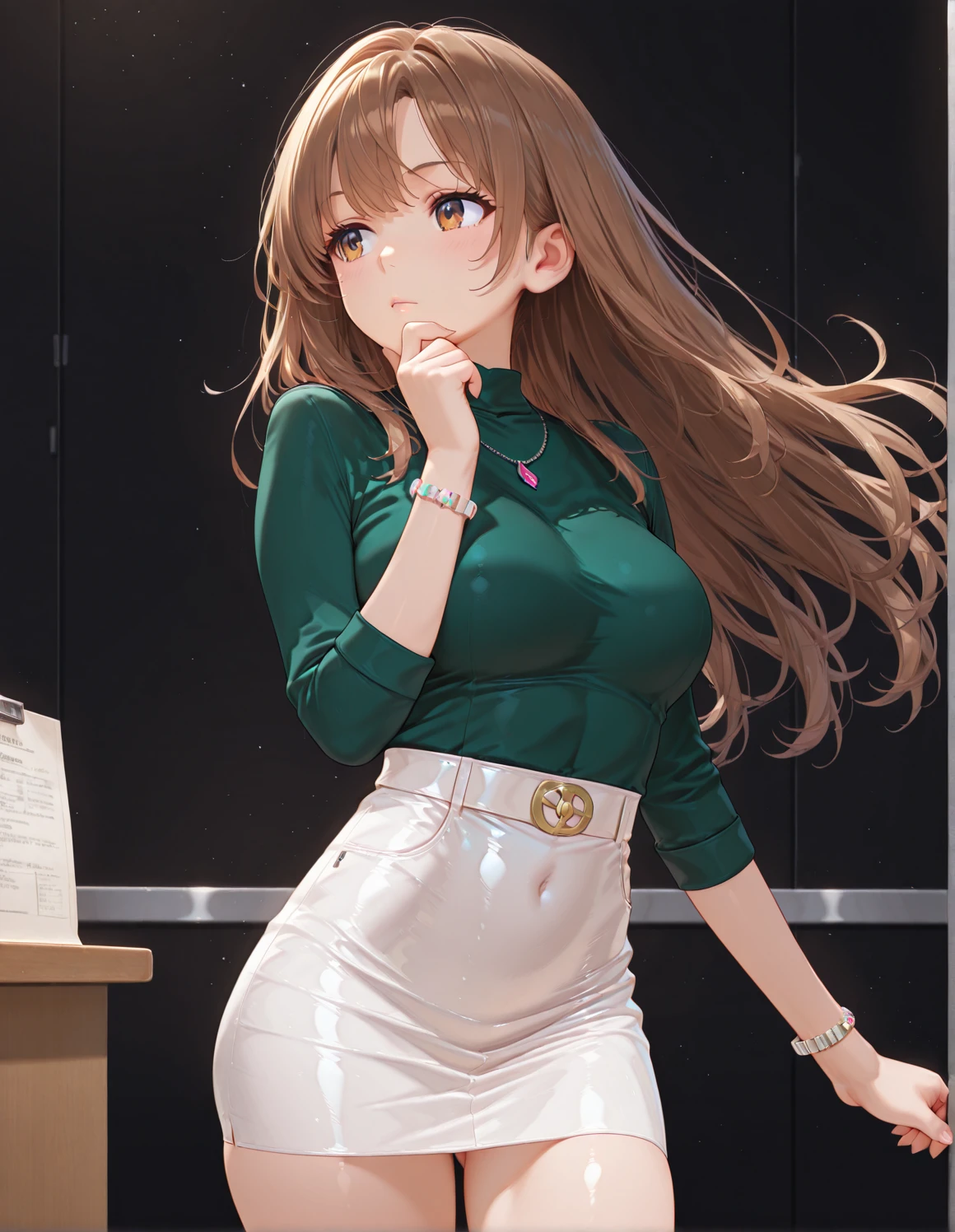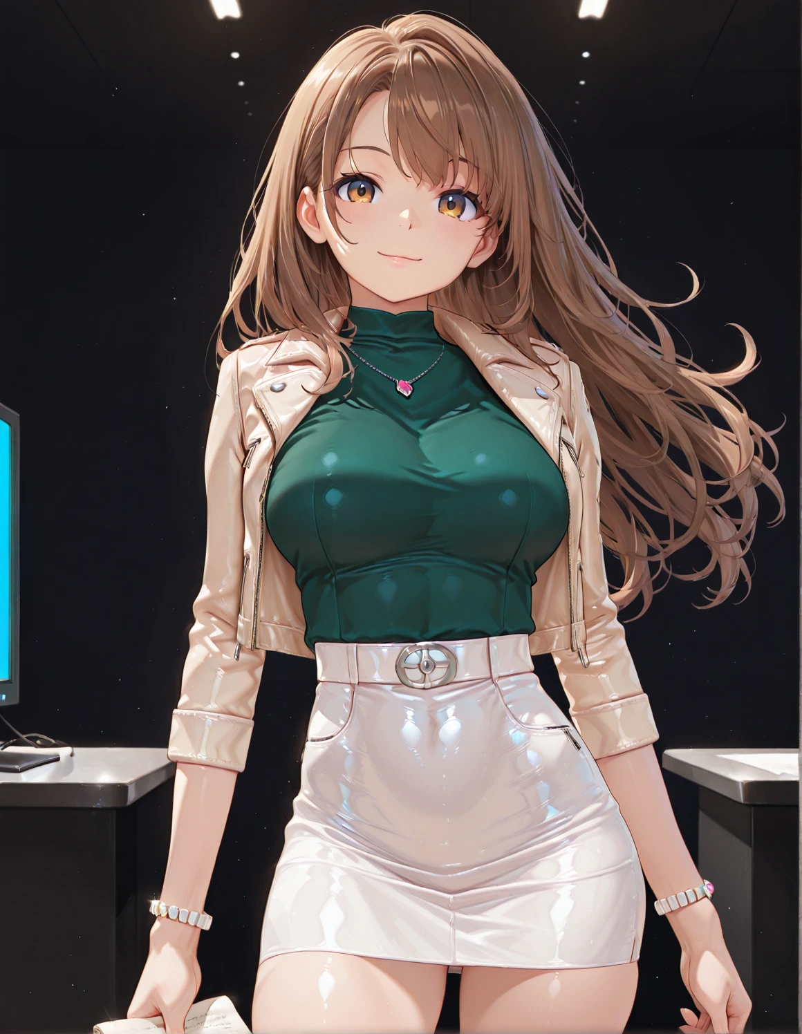 Asuka_nanami, brown hair, brown eyes, white leather jacket, green shirt, white pencil mini skirt, necklace, bracelet