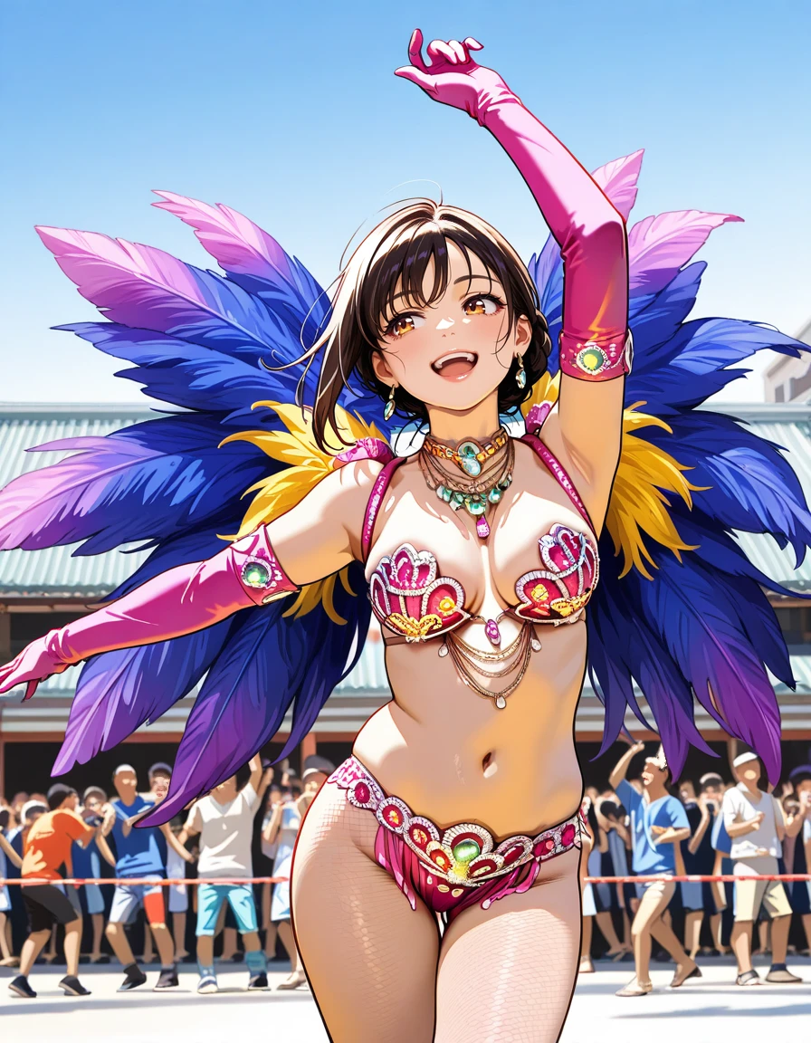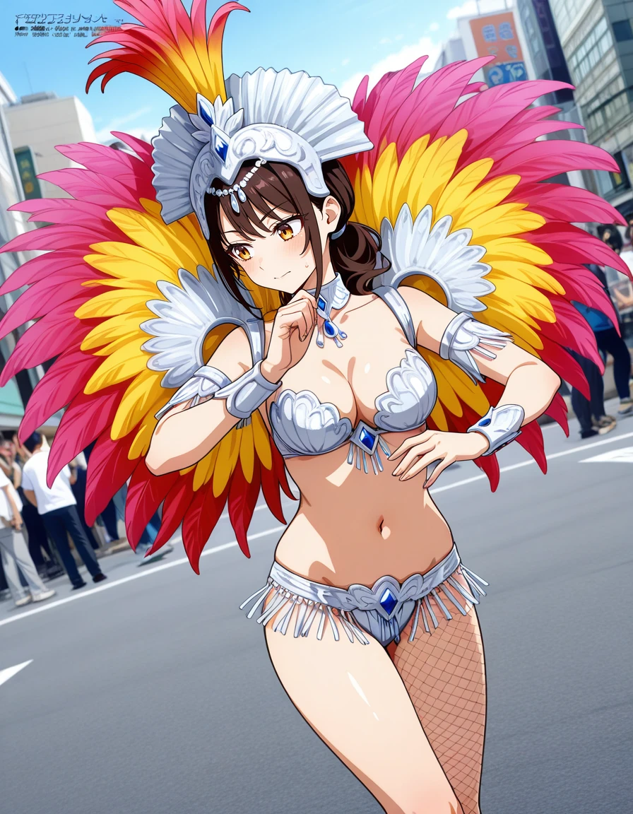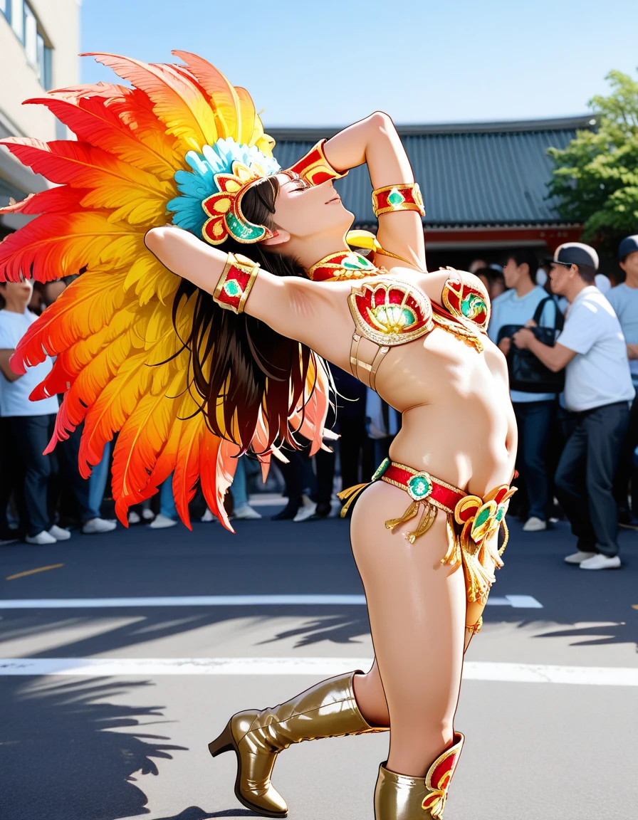 samba costume, headdress, fishnets, jewelry, earrings, high heels, boots, wings, feathers, hair ornament, hair flower, crown, gloves, elbow gloves, bracelet, necklace, armlet, navel piercing, hat, sandals, thighhighs, gem,