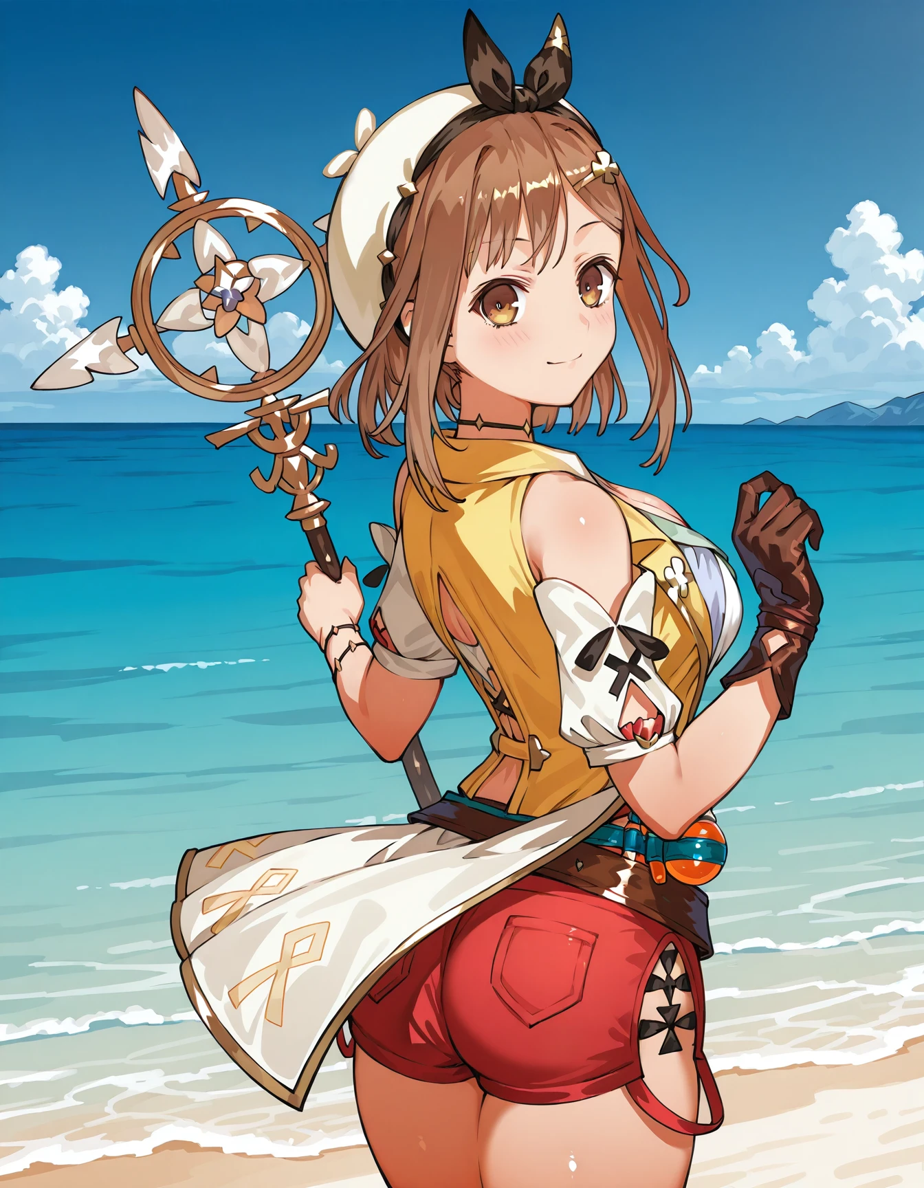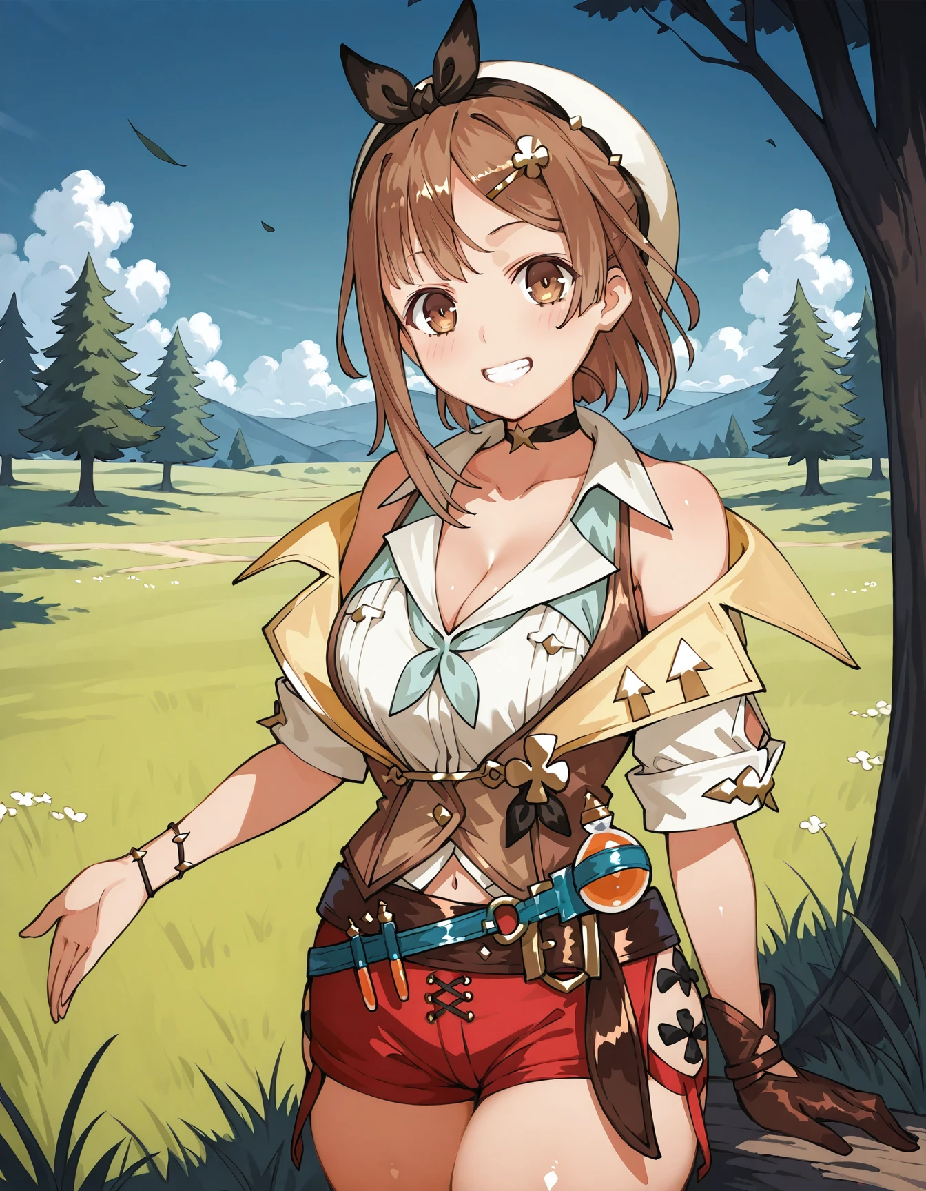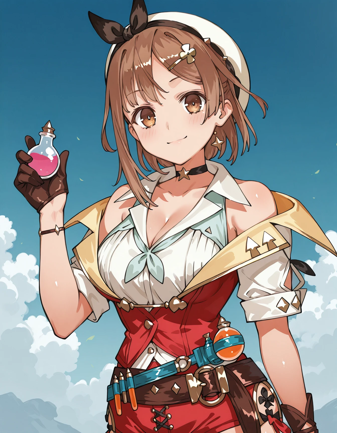reisalin stout, beret, cleavage, short sleeves, vest, bare shoulders, single glove, belt, short shorts, red shorts