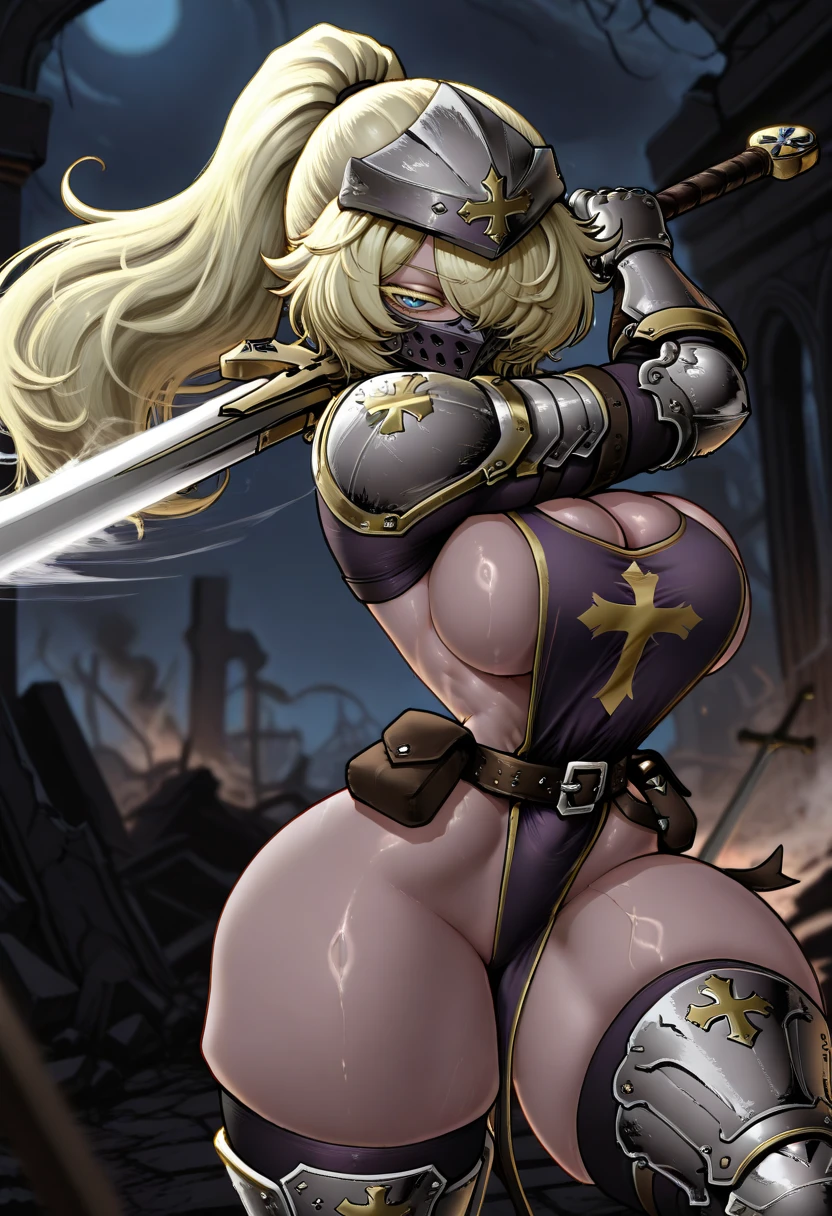 armored boots, purple tabard, crusader cross, toned, knight, pouch, yellow trim, helmet,mask,