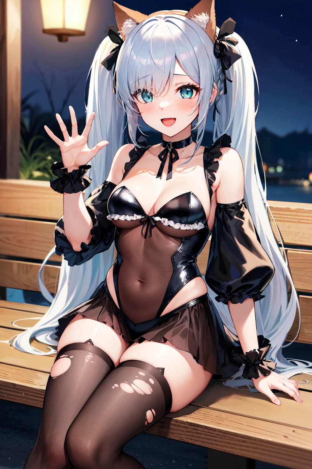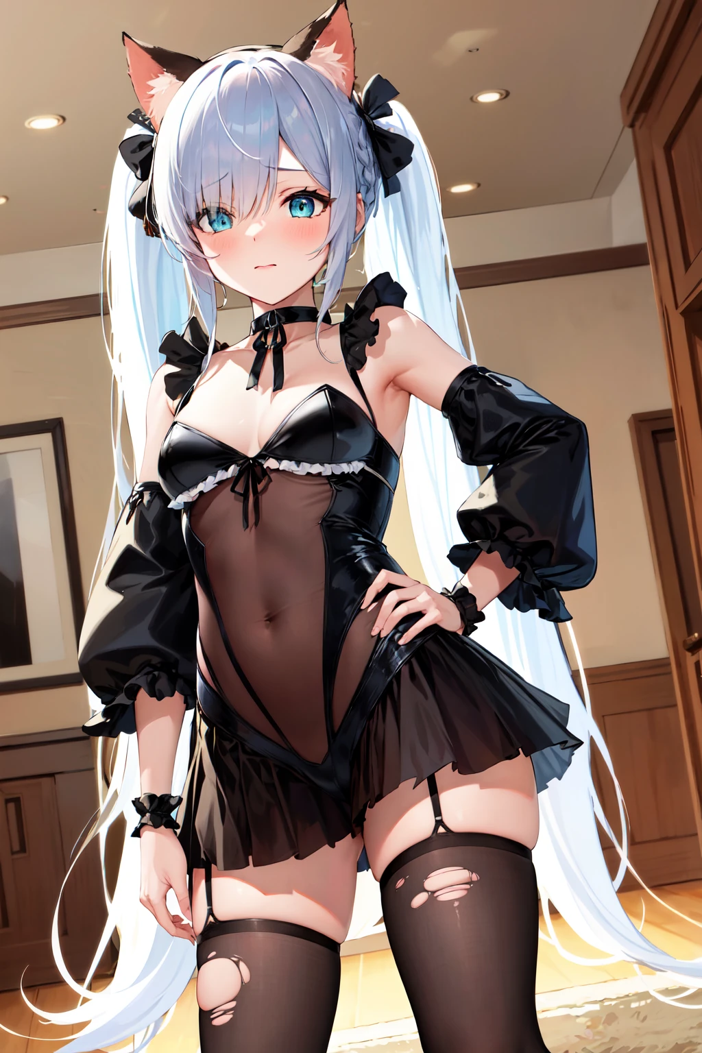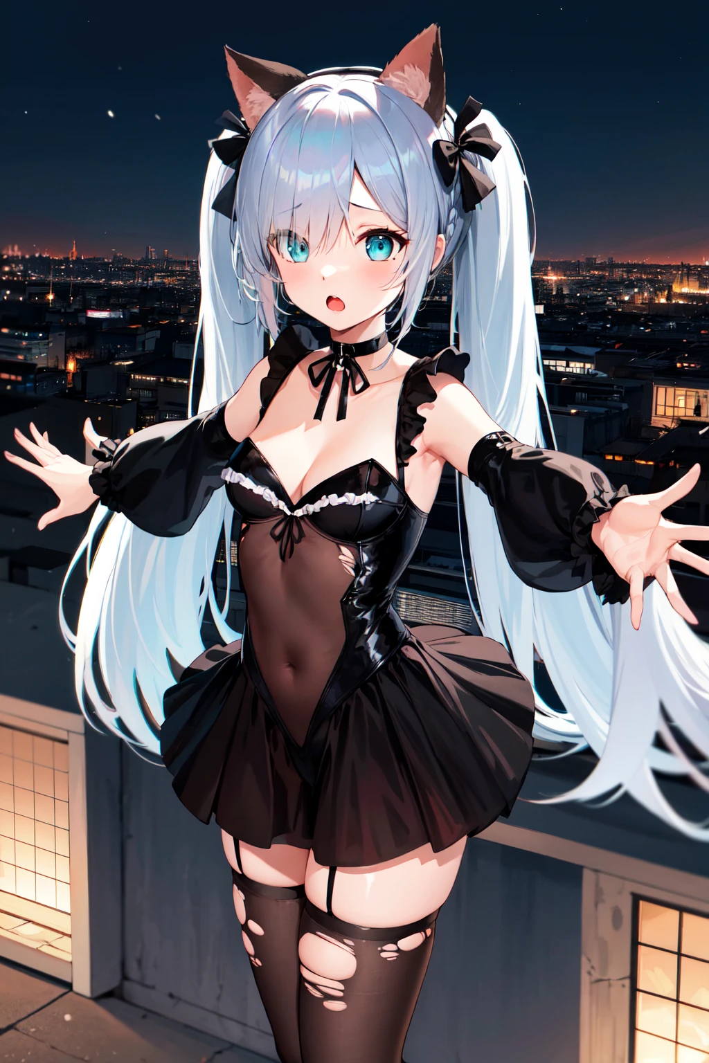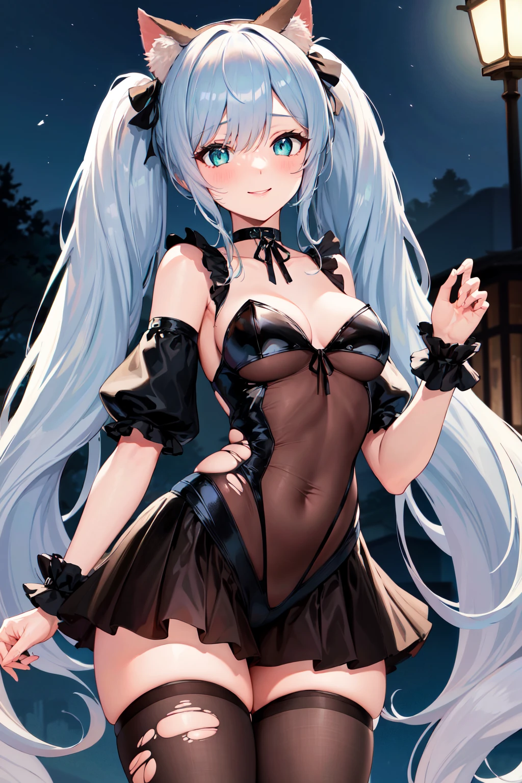 outfiit2 (not perfect)1girl, solo, long hair, white hair, twintails, fake animal ears, blue eyes, choker, neck ribbon, cleavage, black dress, see-through, detached sleeves, wrist cuffs, torn thighhighs, black thighhighs