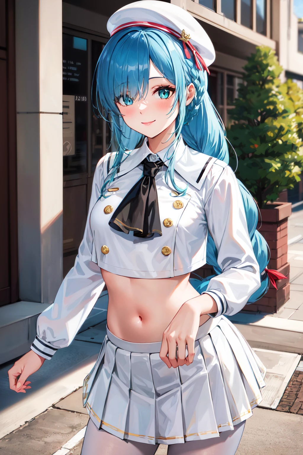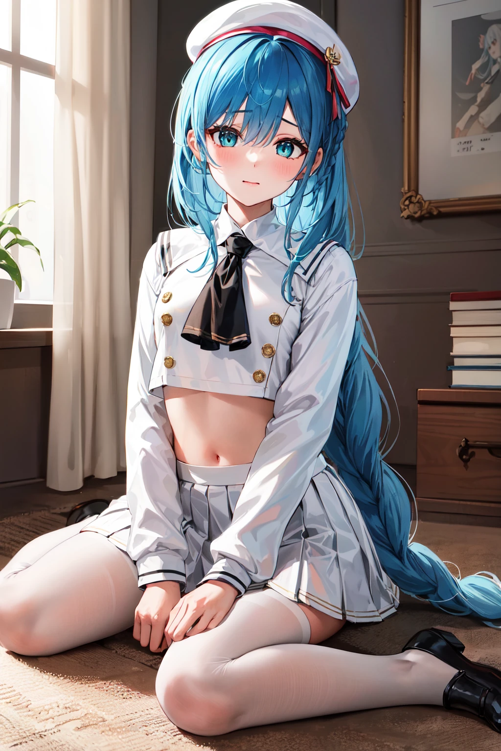 outfit3 (not perfect)1girl, solo, very long hair, blue hair, braided ponytail, beret, white headwear, blue eyes, black neckerchief, crop top, white shirt, long sleeves, midriff, pleated skirt, white skirt, white pantyhose