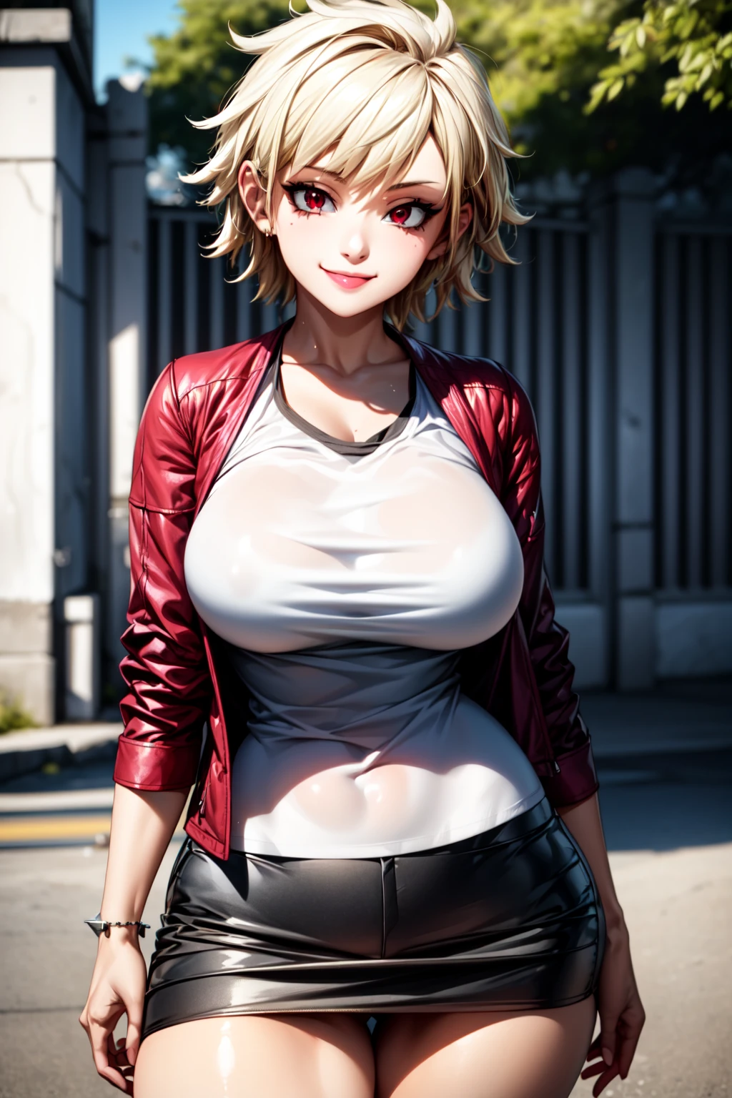 BakugouMitsuki_NDV, 1girl, red eyes, blonde hair, large breasts, short hair, mature female, spiked hair