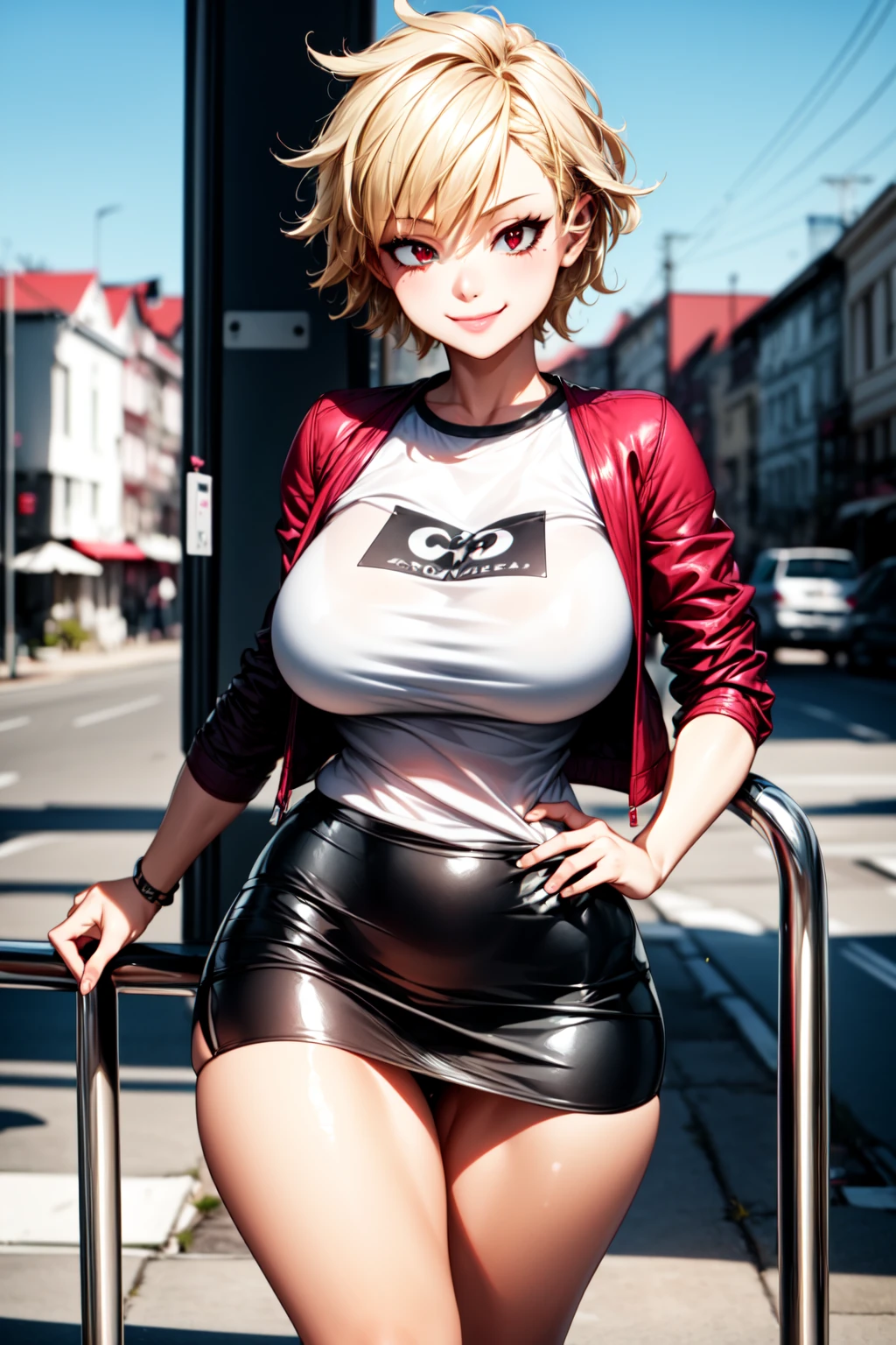 BakugouMitsuki_NDV, 1girl, red eyes, blonde hair, large breasts, short hair, mature female, spiked hairBest weight: 0.6-0.8