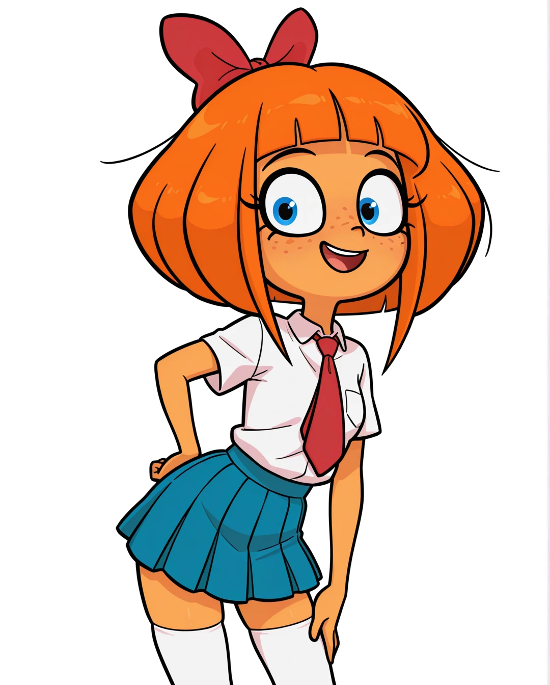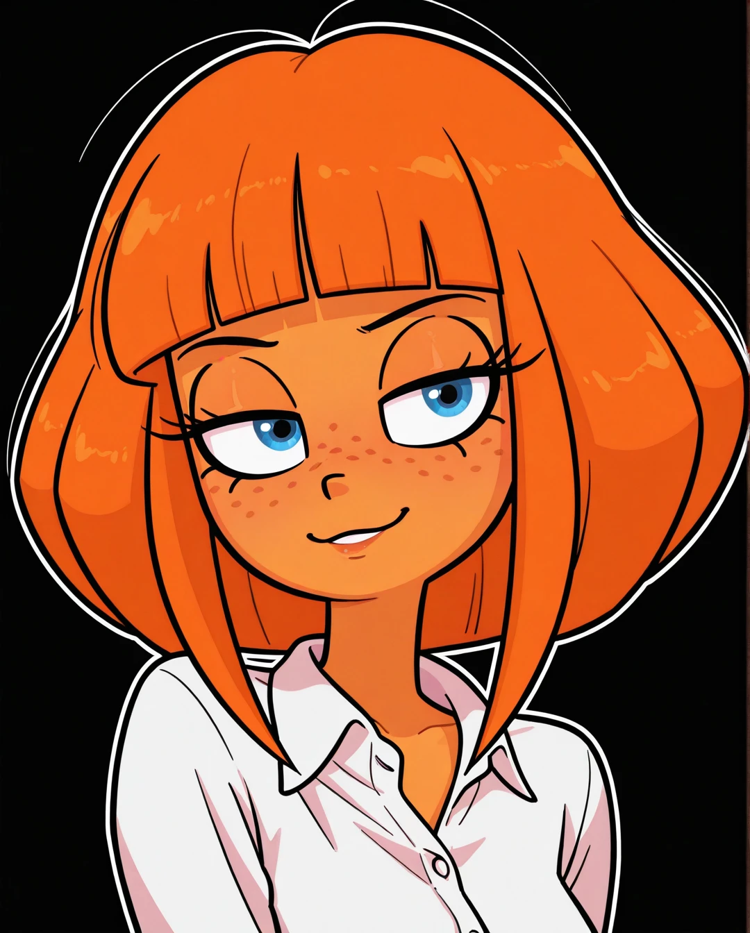 mymy_schoppenboer, orange hair, medium hair, sidelocks, blunt bangs, blue eyes, freckles,