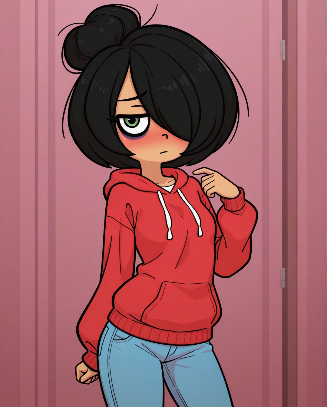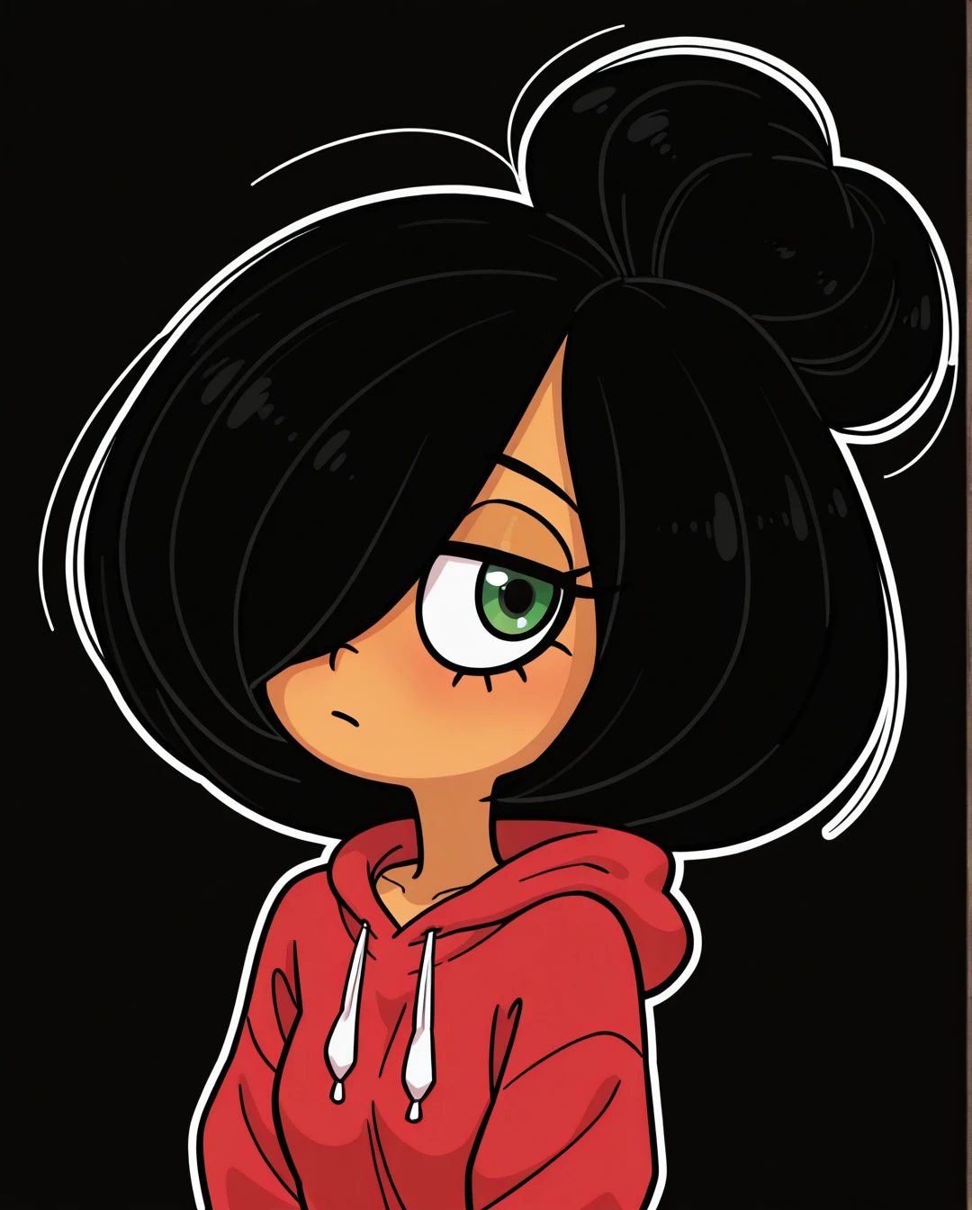 maya_schoppenboer, green eyes, black hair, single hair bun, hair over one eye,