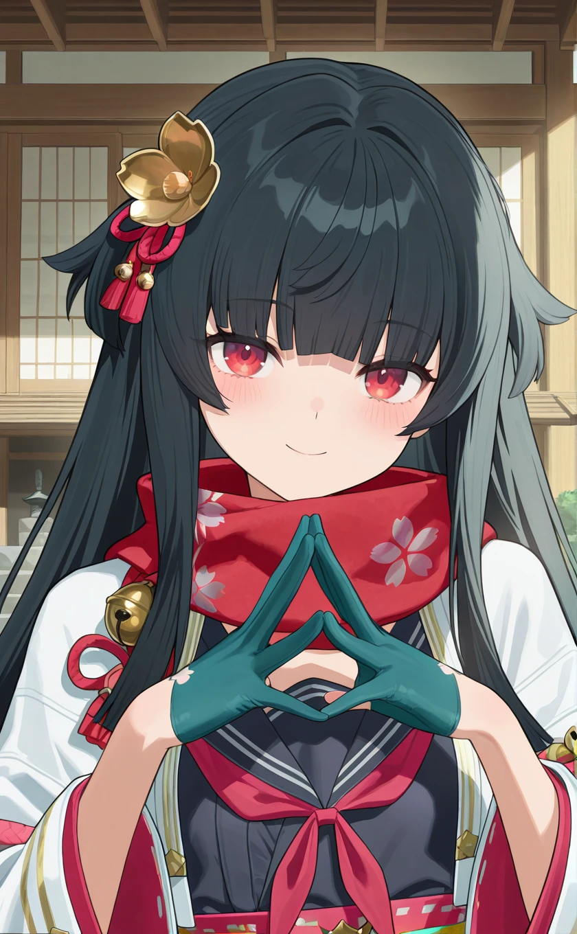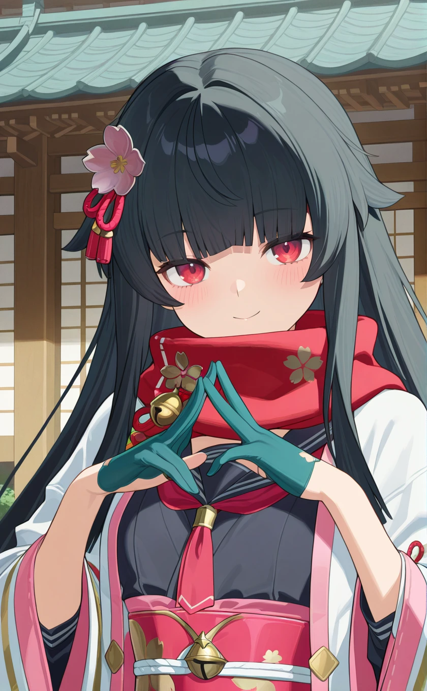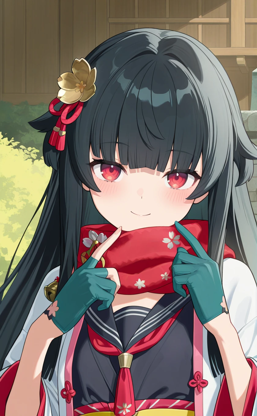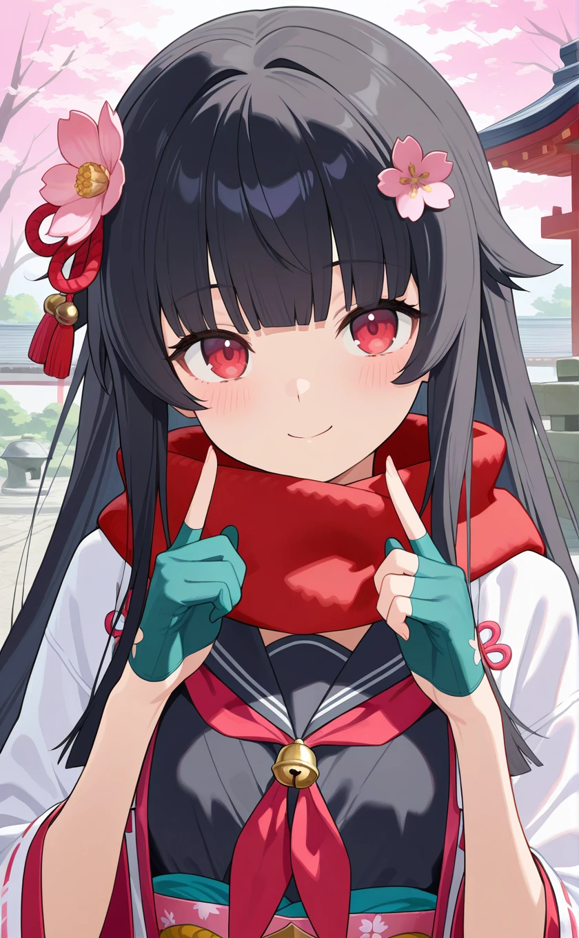 red scarf,school uniform,white jacket,open jacket,cherry blossom print,sailor collar,black shirt,red neckerchief,long sleeves,wide sleeves,half gloves,partially fingerless gloves,aqua gloves,pink obi,bell,aqua skirt,pleated skirt,black pantyhose,thigh strap,loafers,black footwear