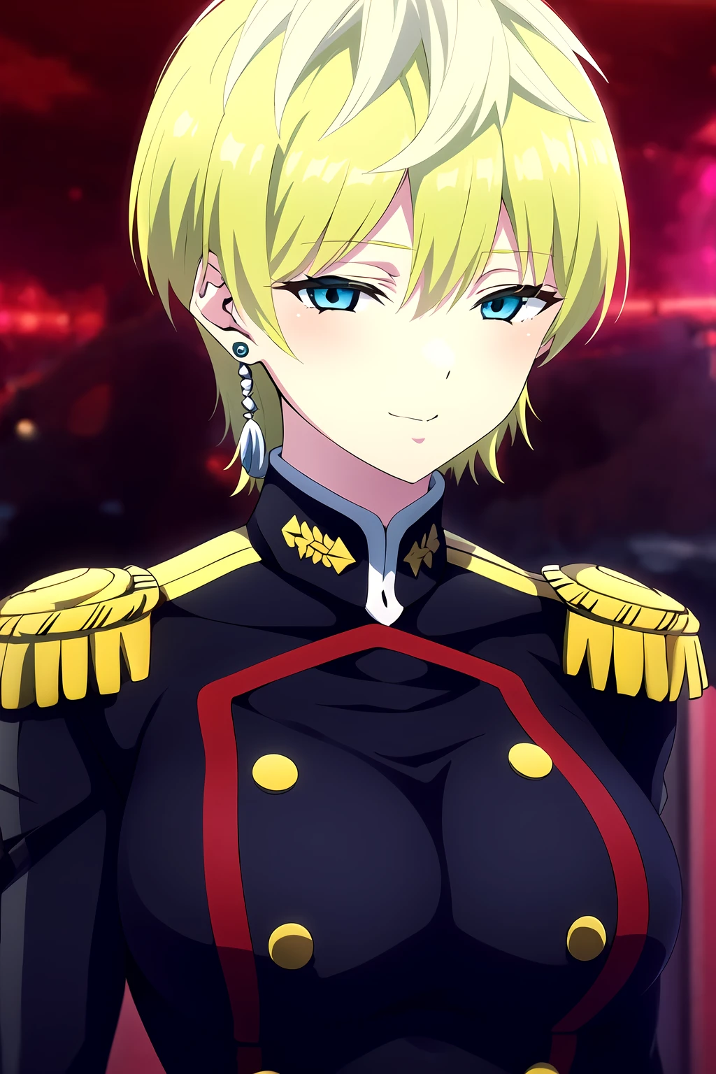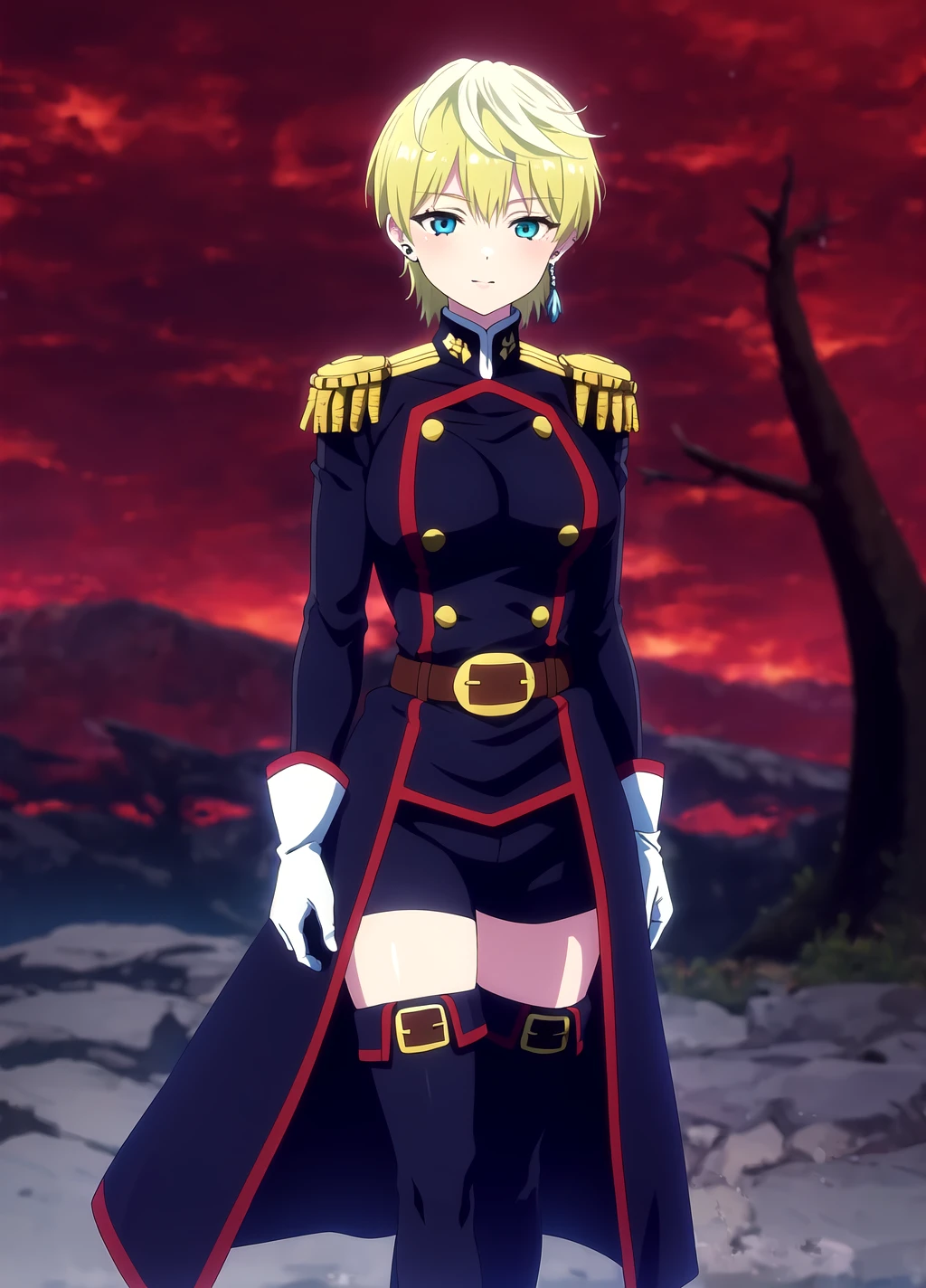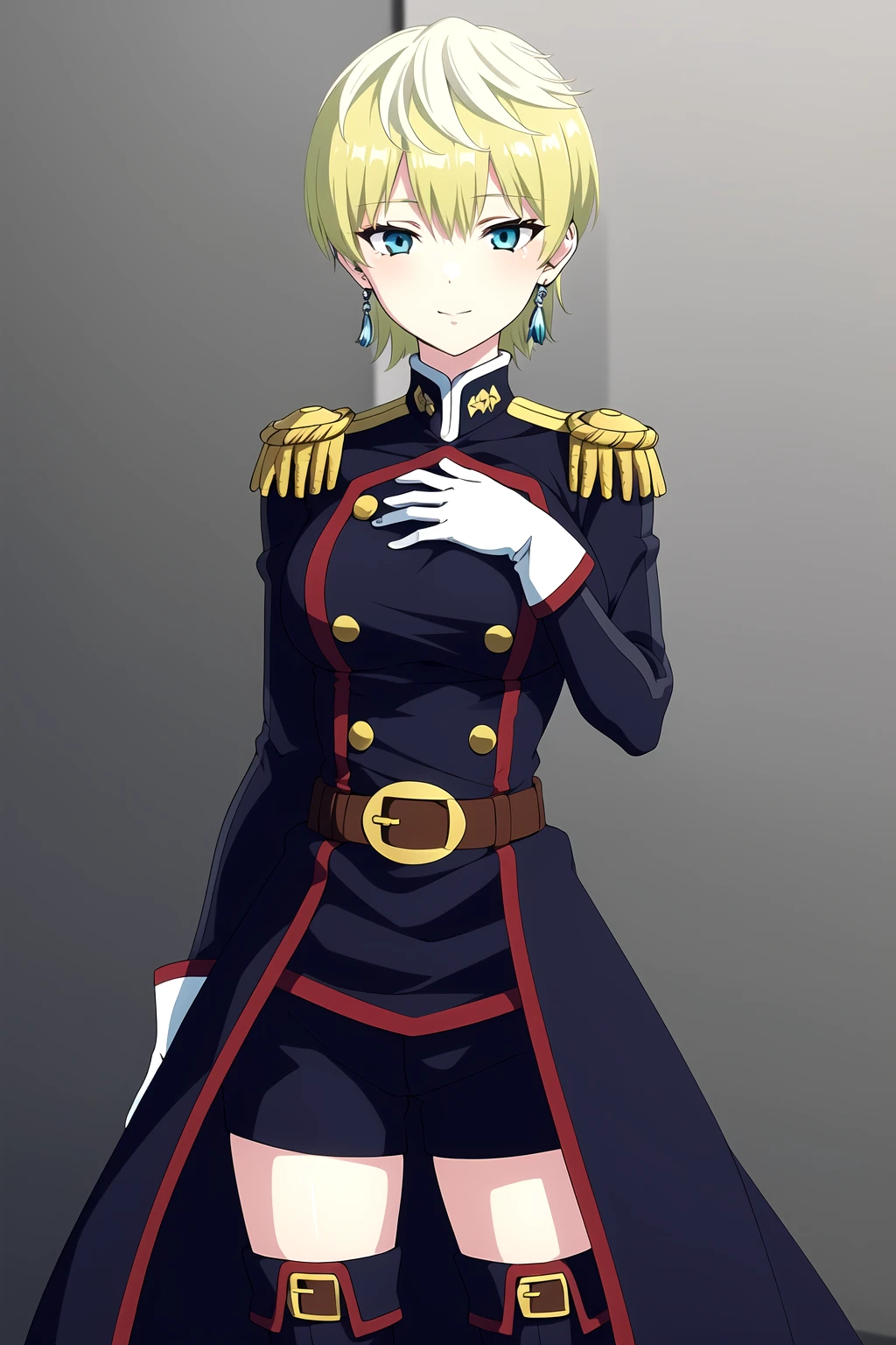 Trigger words: Tenka Izumo, 1girl, solo, green hair, earrings, blonde hair, blue eyes, breasts, green hair, short hair, gloves, shorts, epaulettes, belt, black shorts, white gloves, uniform, short shorts, thigh boots,