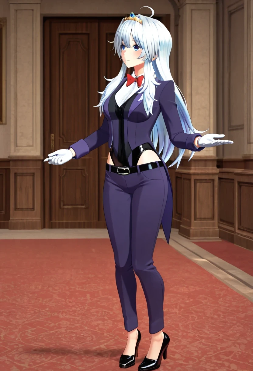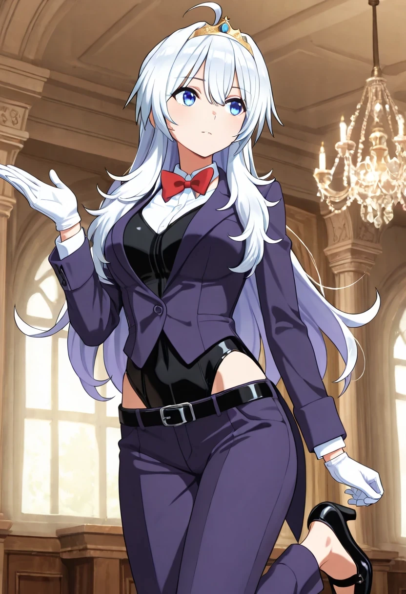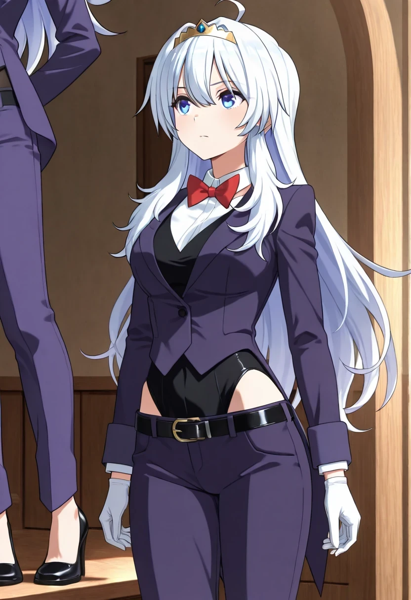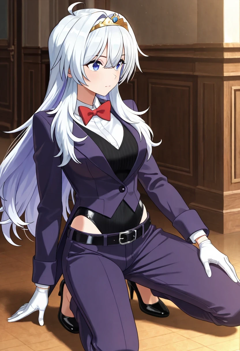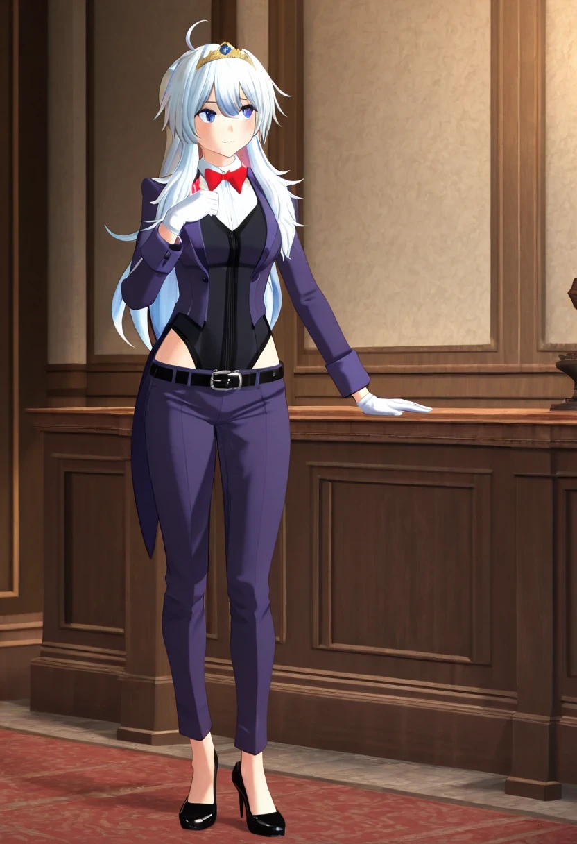 shirt, bow, jacket, school_uniform, white_shirt, bowtie, red_bow, tiara, red_bowtie, long_sleeves, gloves, belt, white_gloves, leotard, black_leotard, black_belt, leotard_under_clothes, pants, purple_jacket, shoes, high_heels, formal, suit, black_footwear, hairband, collared_shirt, blazer, alternate_costume, purple_pants, suit,