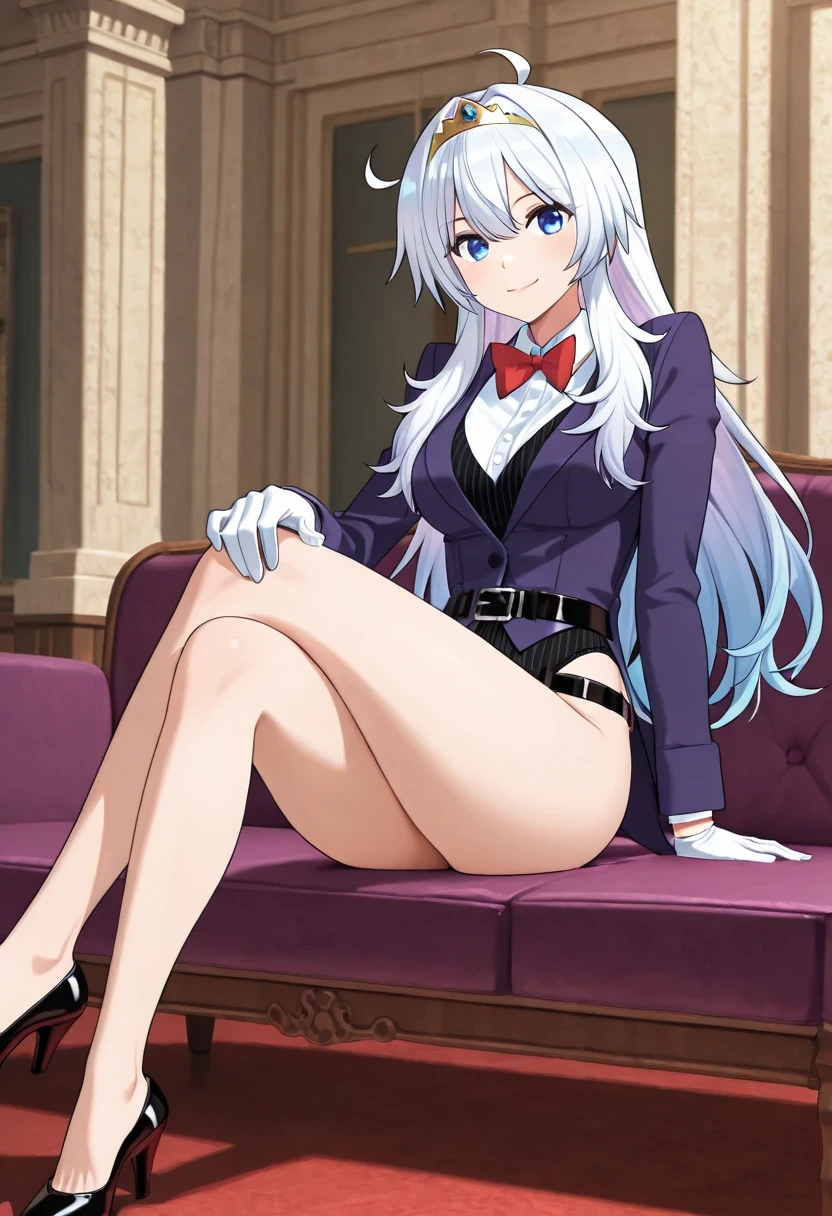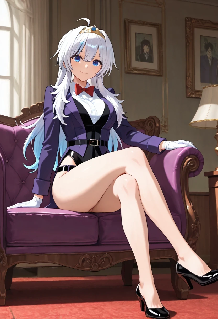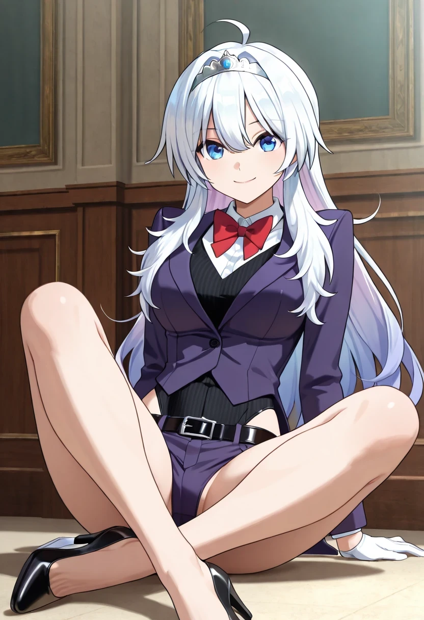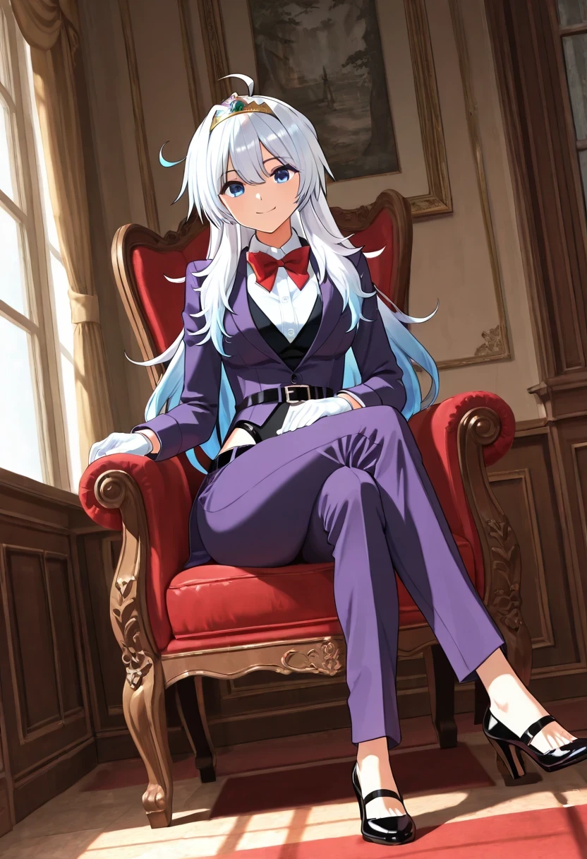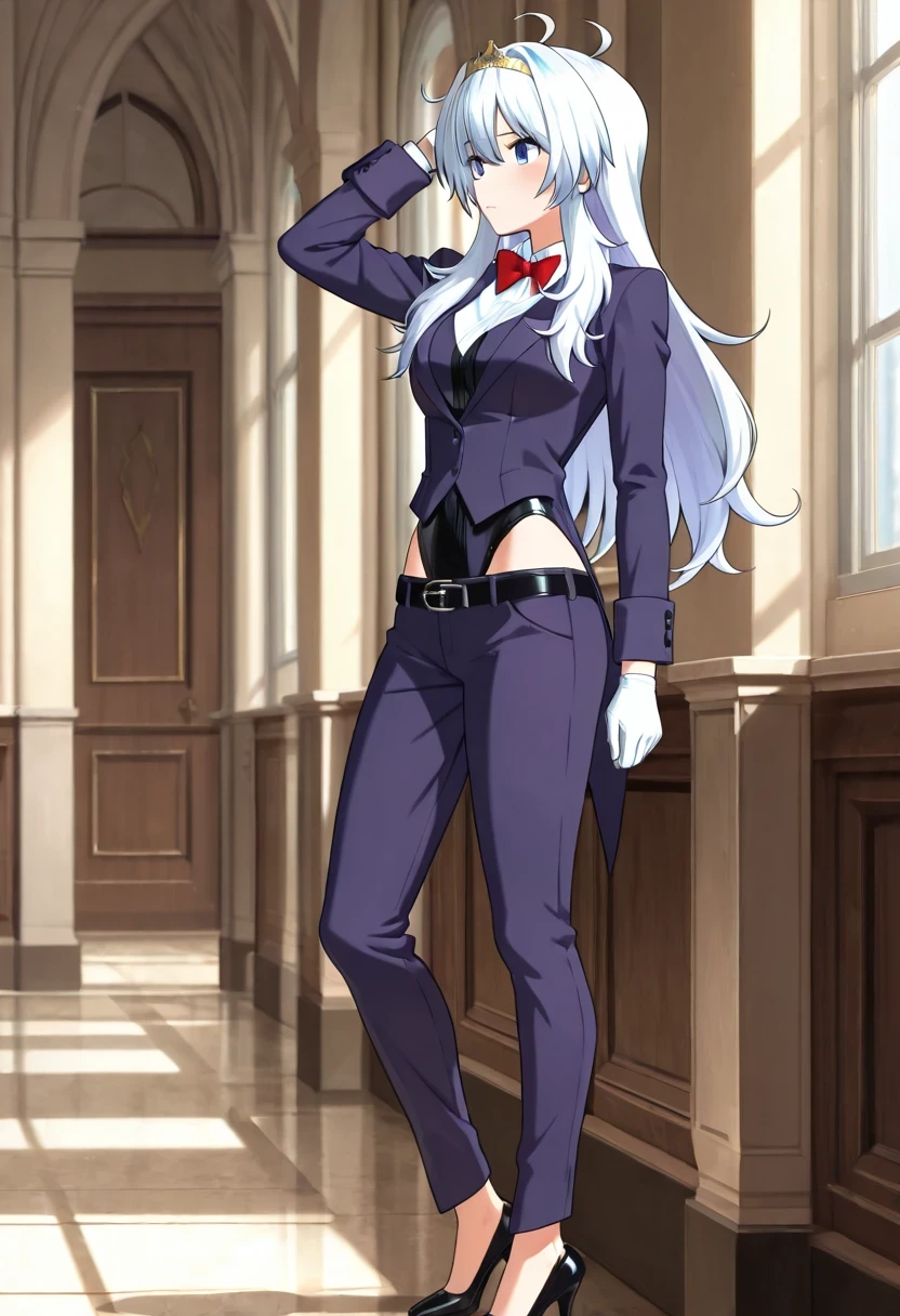 shirt, bow, jacket, school_uniform, white_shirt, bowtie, red_bow, tiara, red_bowtie, long_sleeves, gloves, belt, white_gloves, leotard, black_leotard, black_belt, leotard_under_clothes, pants, purple_jacket, shoes, high_heels, formal, suit, black_footwear, hairband, collared_shirt, blazer, alternate_costume, purple_pants, suit,