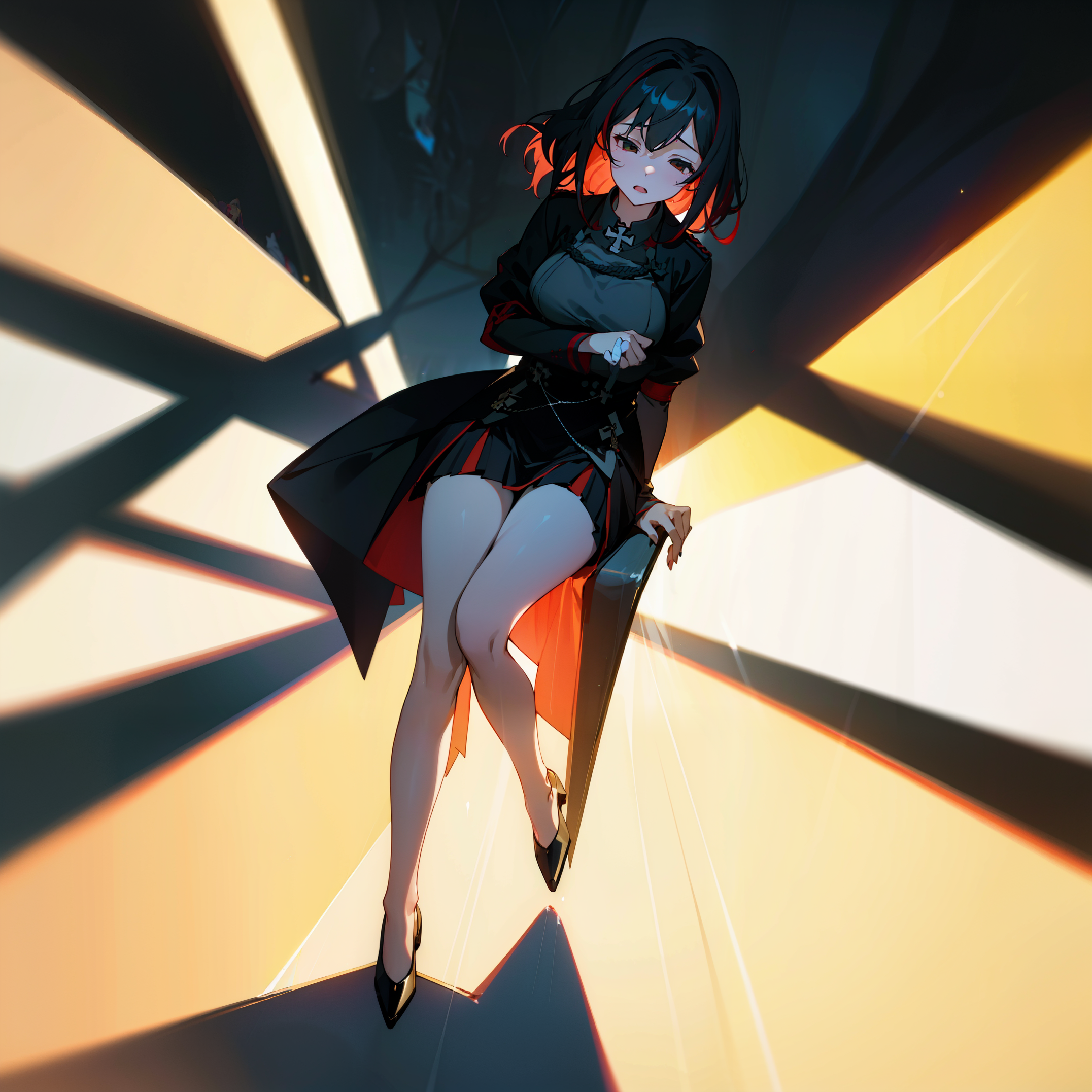 brown eyes, red eyes, short hair, streaked hair, shaded face, multicolored hair, blonde hair, red hair, headgear, hair between eyes, streaked hair,;