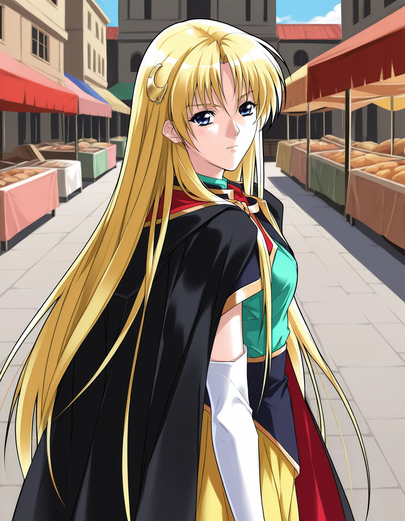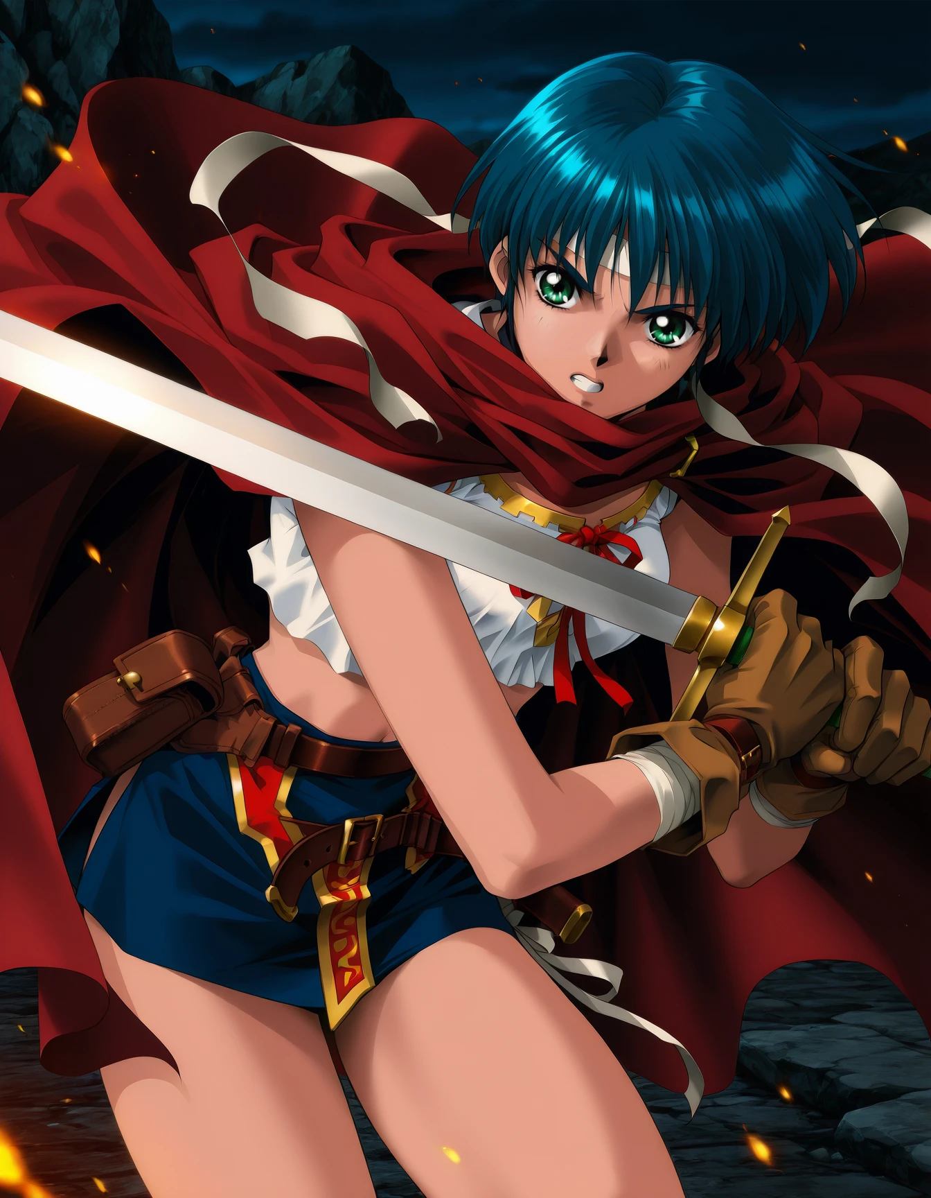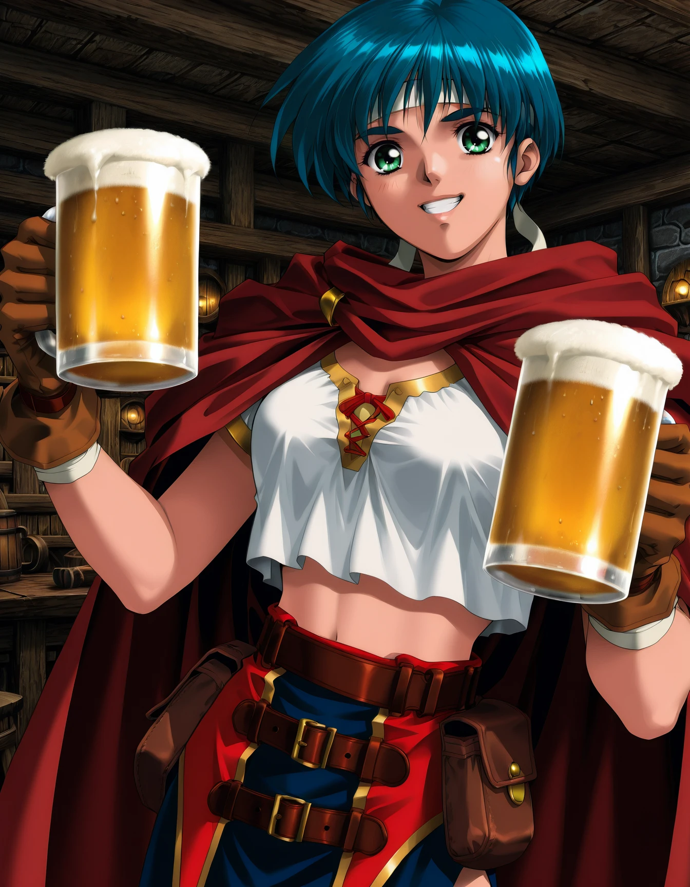 ep0sh0p, (blue hair:0.6), headband, crop top, white shirt, red cape, blue skirt, microskirt, belt, belt pouch, gloves