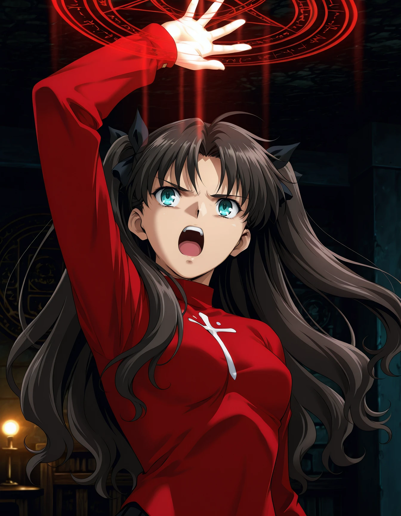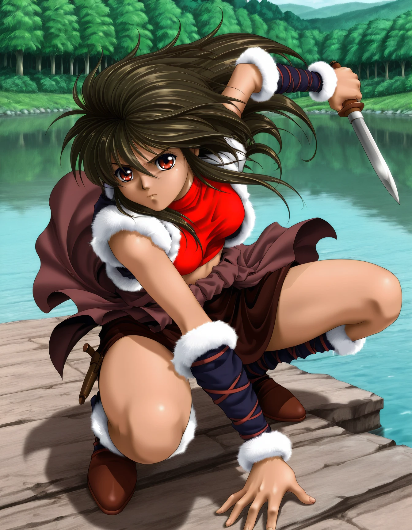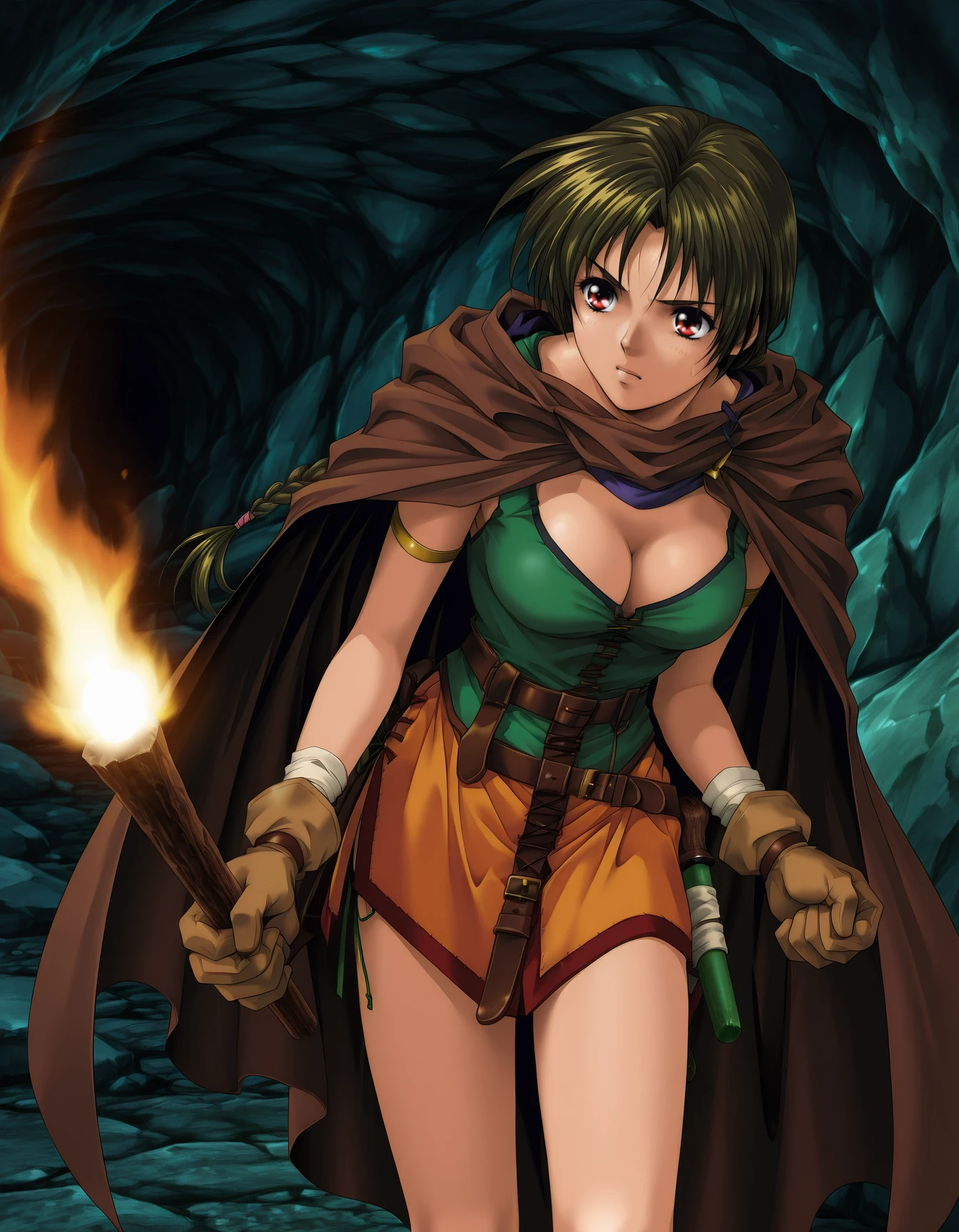 d4rksw0rd, (single braid:0.6), (red eyes:0.6), brown cape, tank top, (green tank top:0.8), cleavage, orange skirt