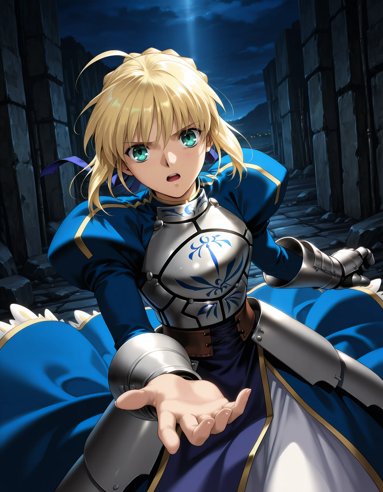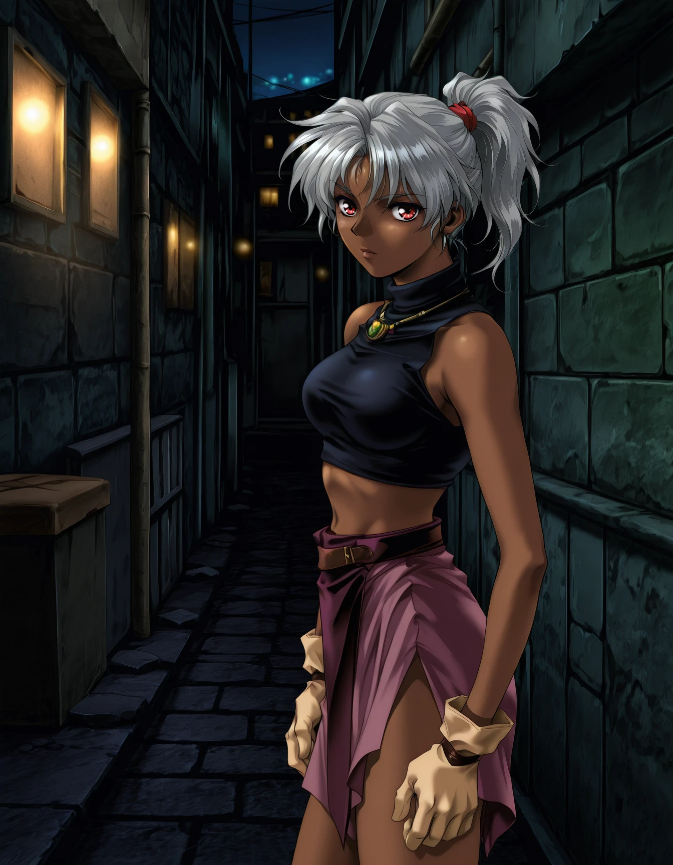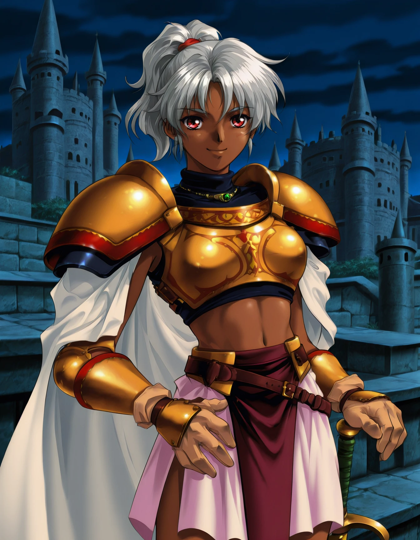 r1t7l1gh7, dark-skinned female, (grey hair:0.6), (ponytail:0.6), (hair tie:0.6), (red eyes:0.6), necklace, pauldrons, (breastplate:0.6), (gold armor:0.8), black turtleneck, midriff, gloves, skirt, (light purple skirt:0.6), (pelvic curtain:0.6)