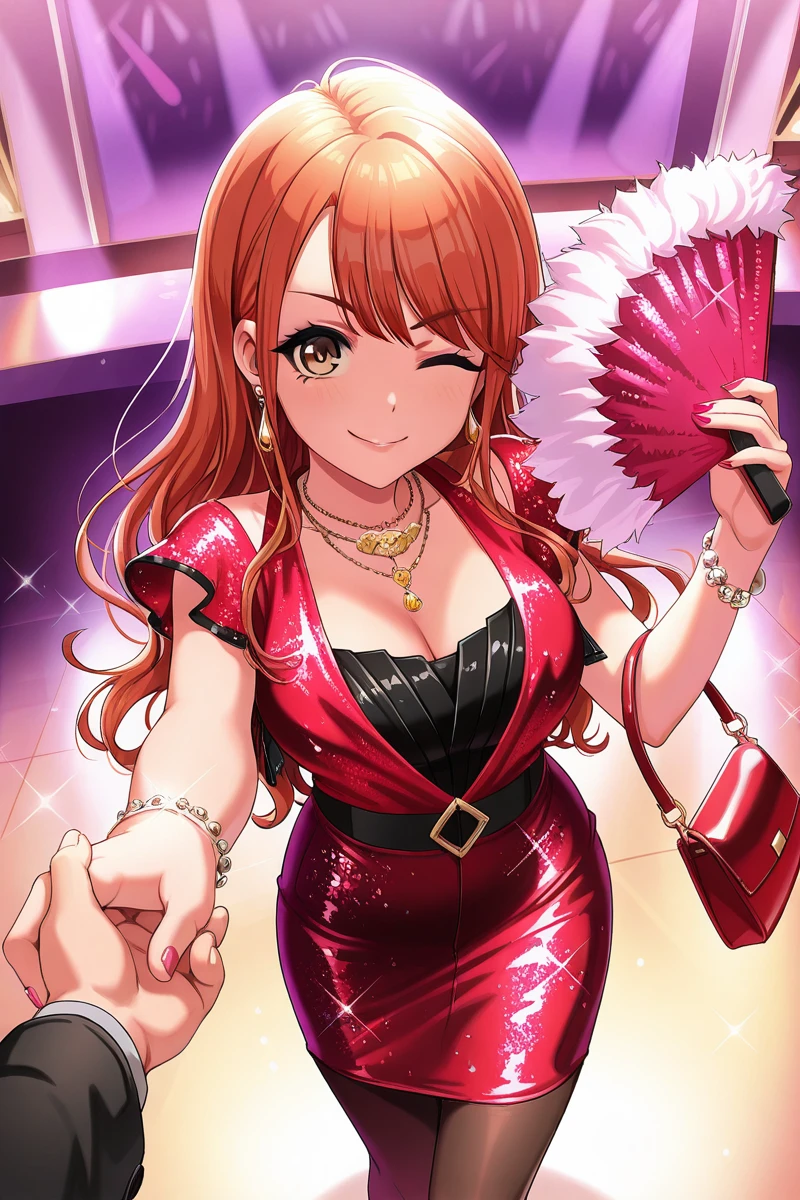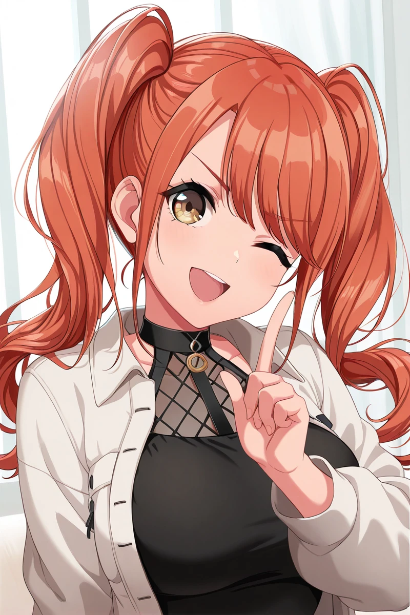 rika, 1girl, solo, one eye closed, breasts, smile, long hair, open mouth, upper body, twintails, ;d, index finger raised, jacket, open clothes, looking at viewer, casual outfitBikini Rika: