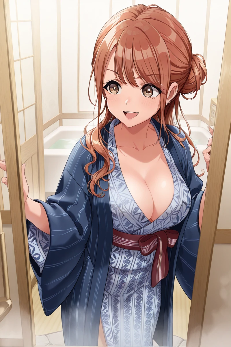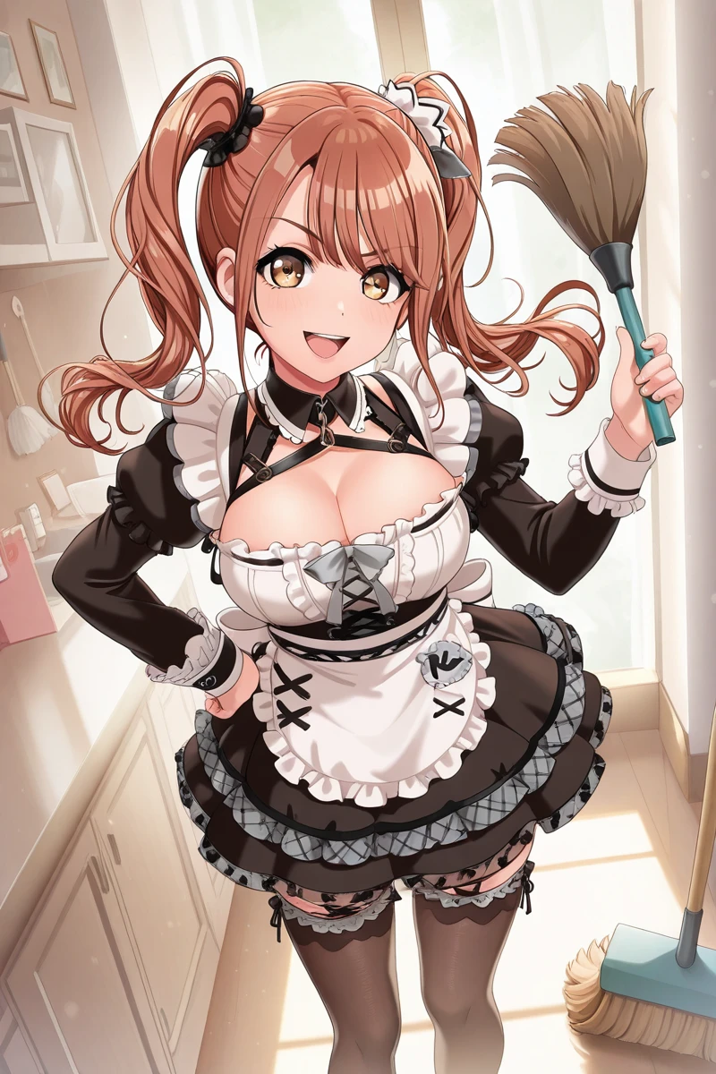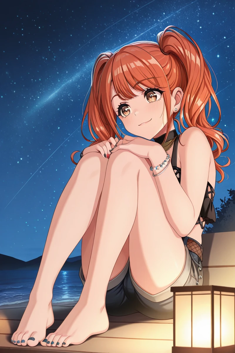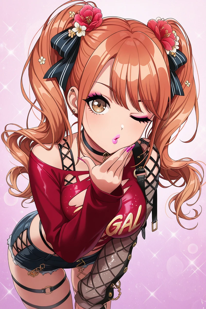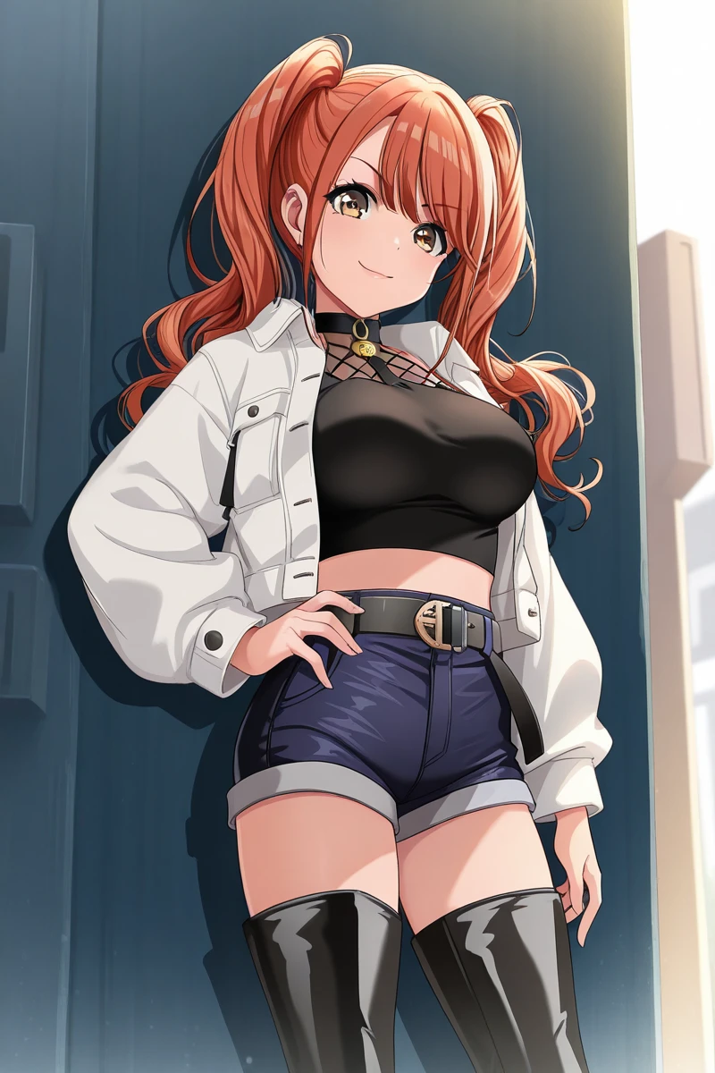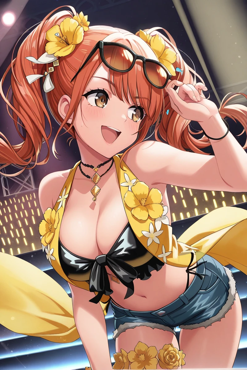 rika, 1girl, eyewear on head, sunglasses, solo, shorts, flower, jewelry, smile, open mouth, yellow flower, hair ornament, hair flower, twintails, denim shorts, breasts, stage outfit, on stageCasual Rika: