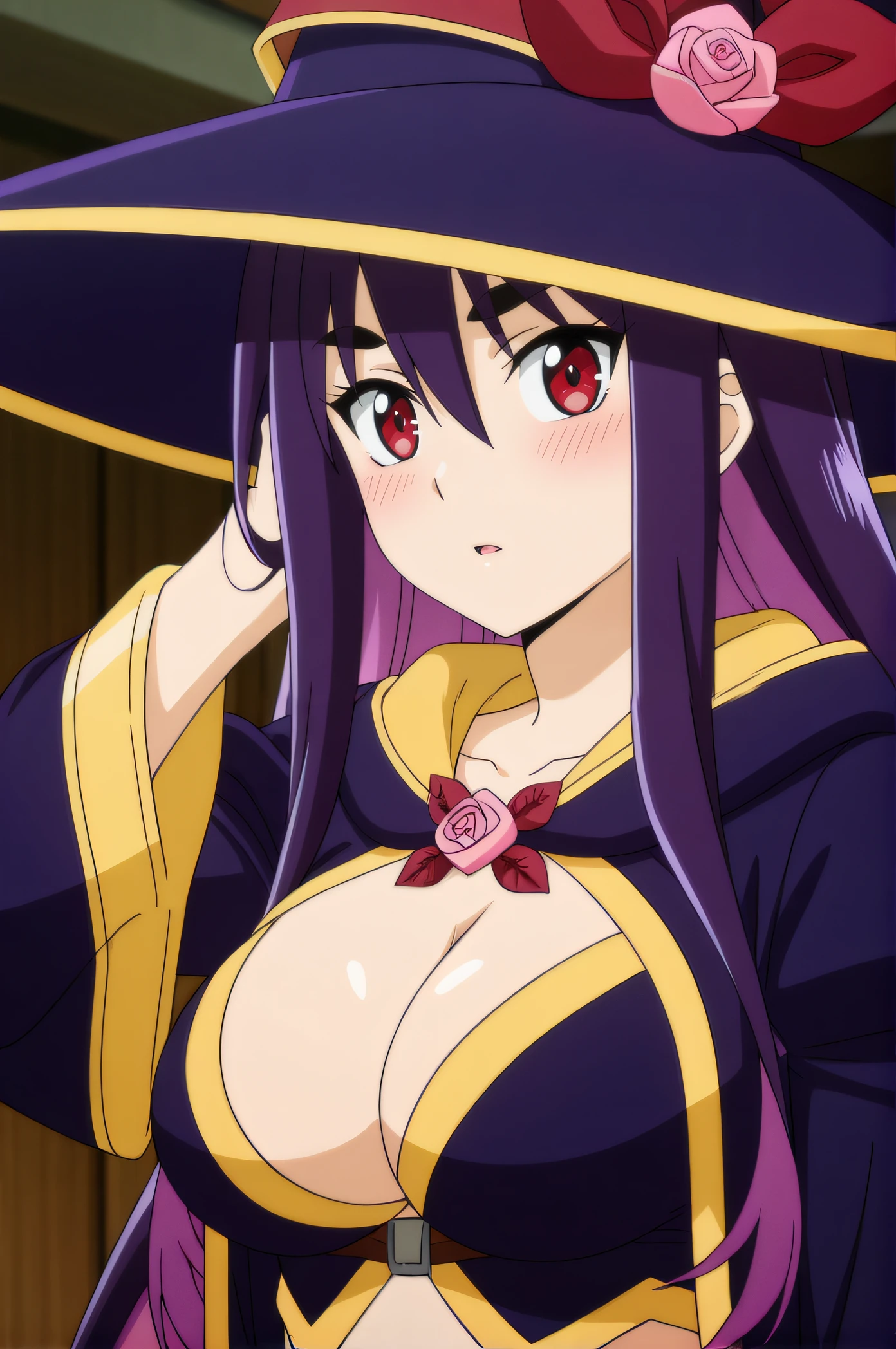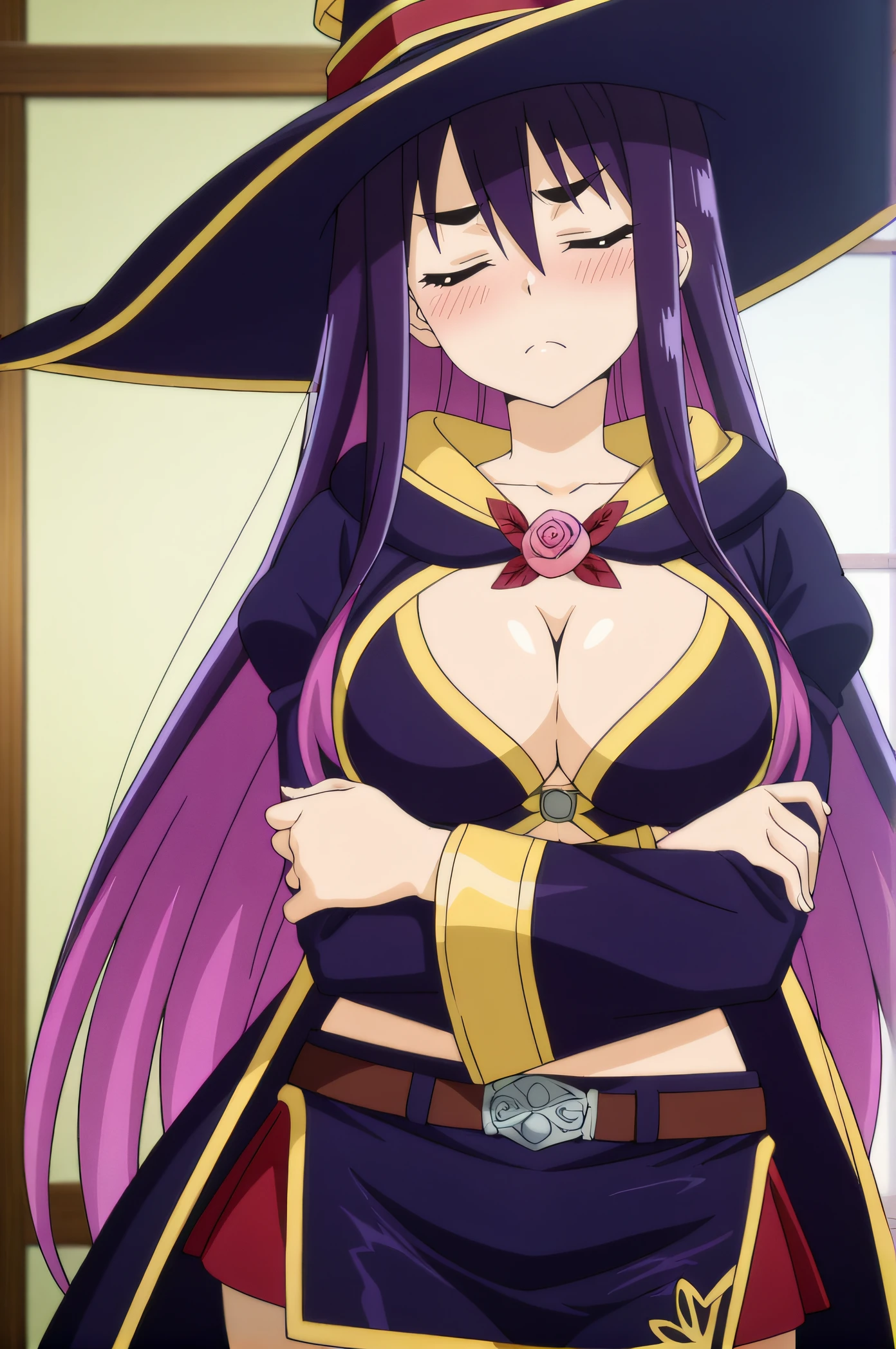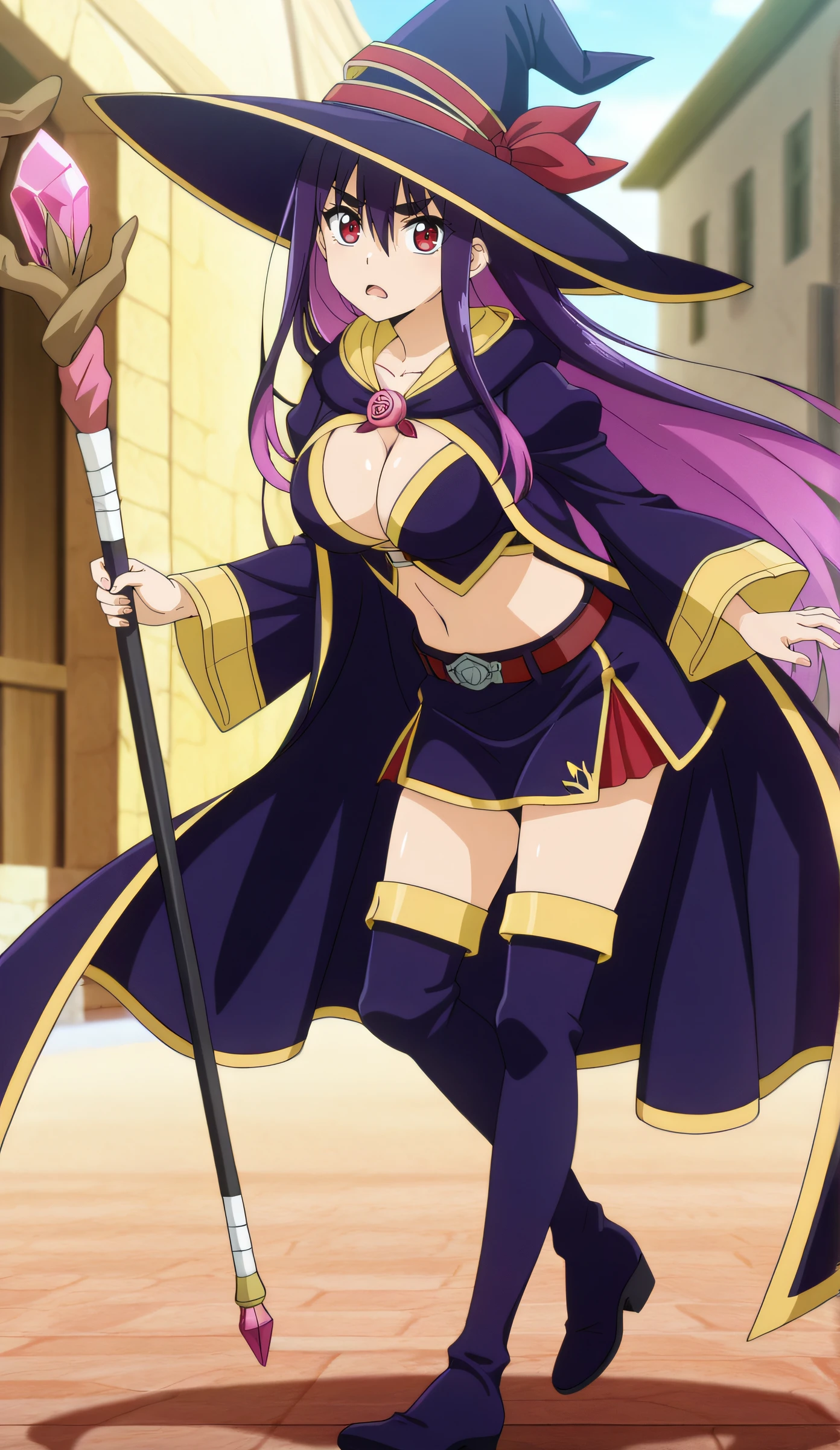 witch hat, cleavage, collarbone, cloak, pink rose, wide sleeves, midriff, miniskirt, belt, purple thigh boots
