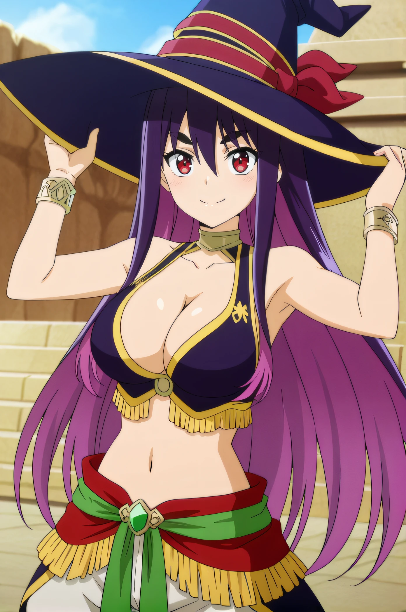 witch hat, bare shoulders, cleavage, collarbone, bracelets, crop top, midriff, arabian clothes, fringe trim, white pants, puffy pants, purple shoes