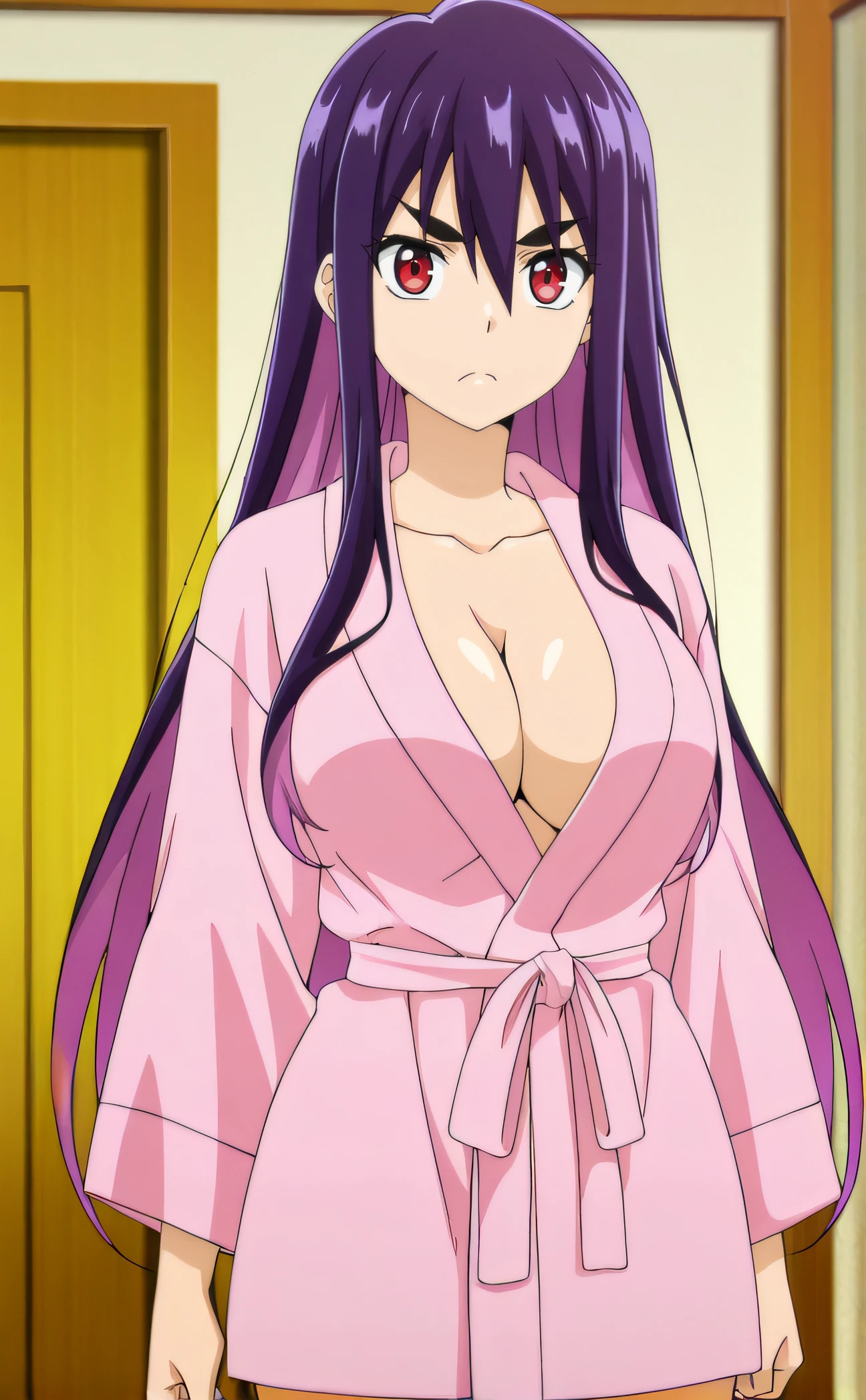 yihdra, purple hair, long hair, multicolored hair, colored inner hair, red eyes, thick eyebrows, large breasts