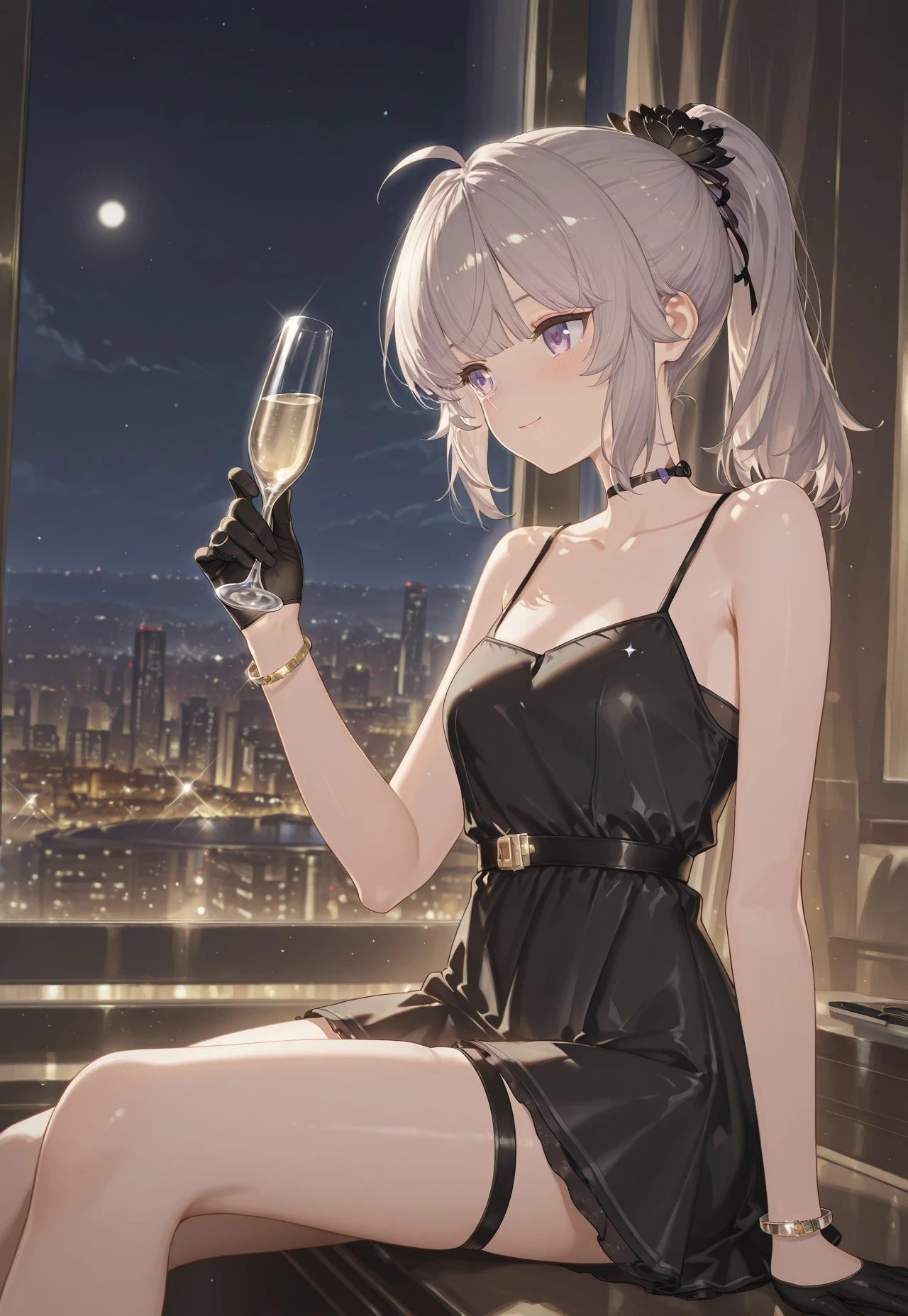 CheyanneDress, black dress, bangs, grey hair, long hair, ahoge, black gloves, purple eyes, black choker, ponytail, jewelry, hair ornament, belt, sidelocks, bracelet, thigh strap,