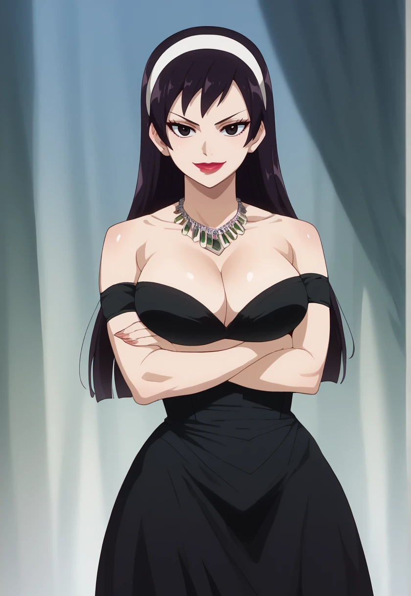 long hair, black hair, black eyes, large breasts, makeup, lipstickAttire