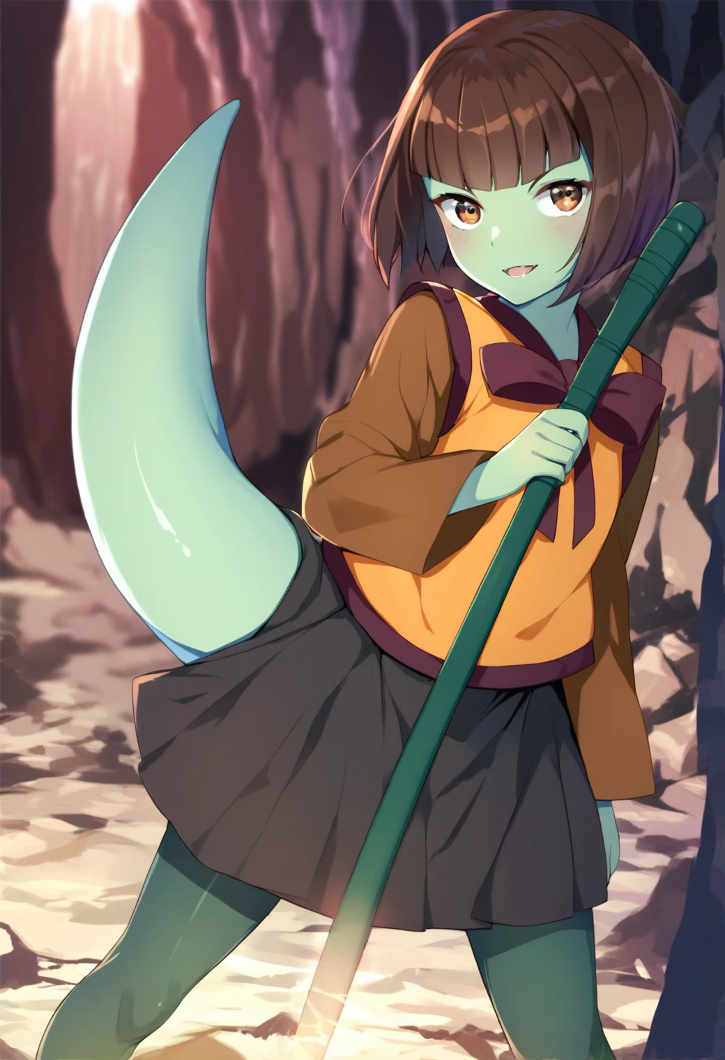 Base Character Prompt: 1girl, anakzahard, green skin, short hair, bob cut, brown hair, brown eyes, lizard tail