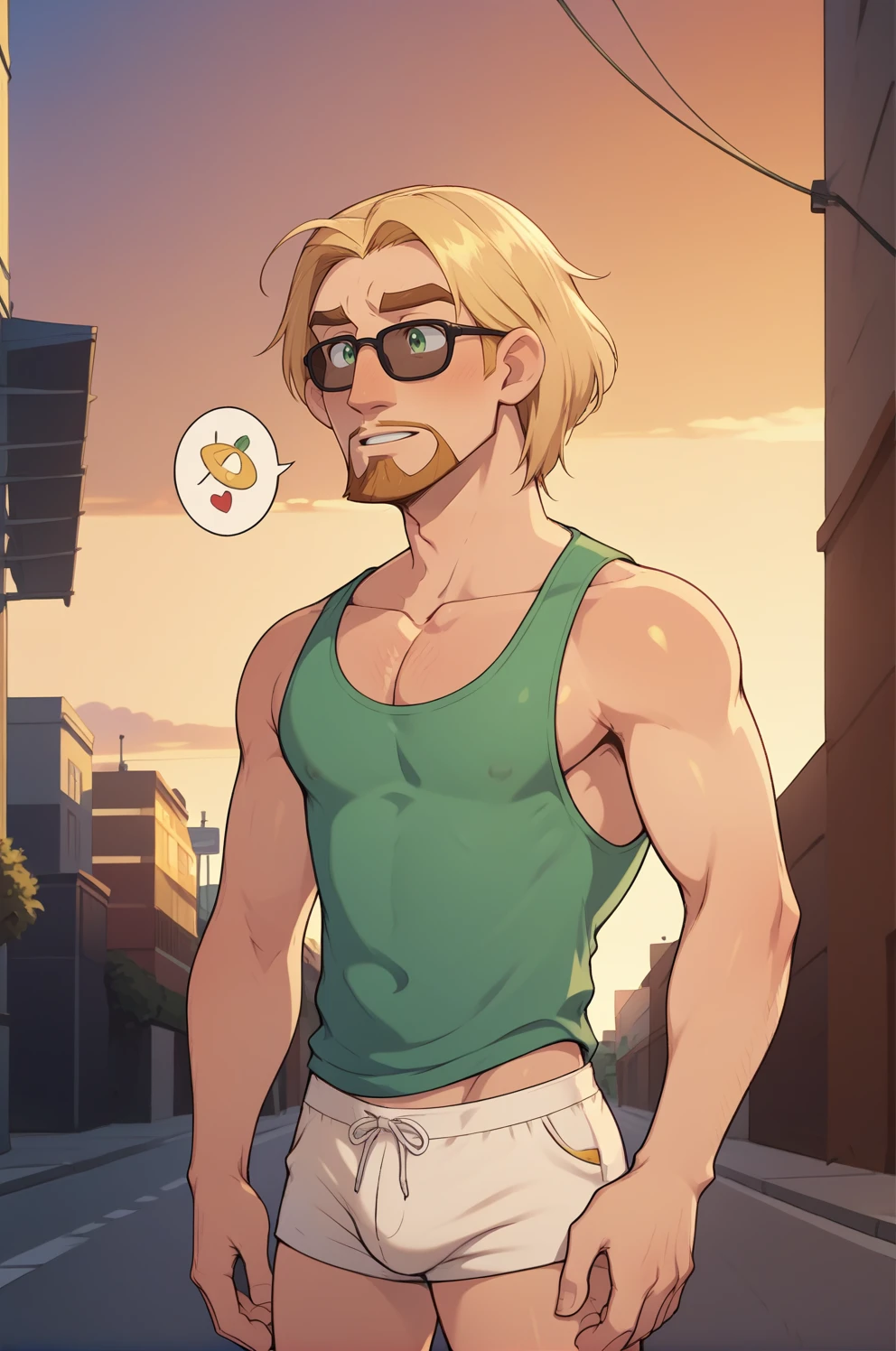 migueled, beard, blonde hair, green eyes, red shirt, belt, brown pants