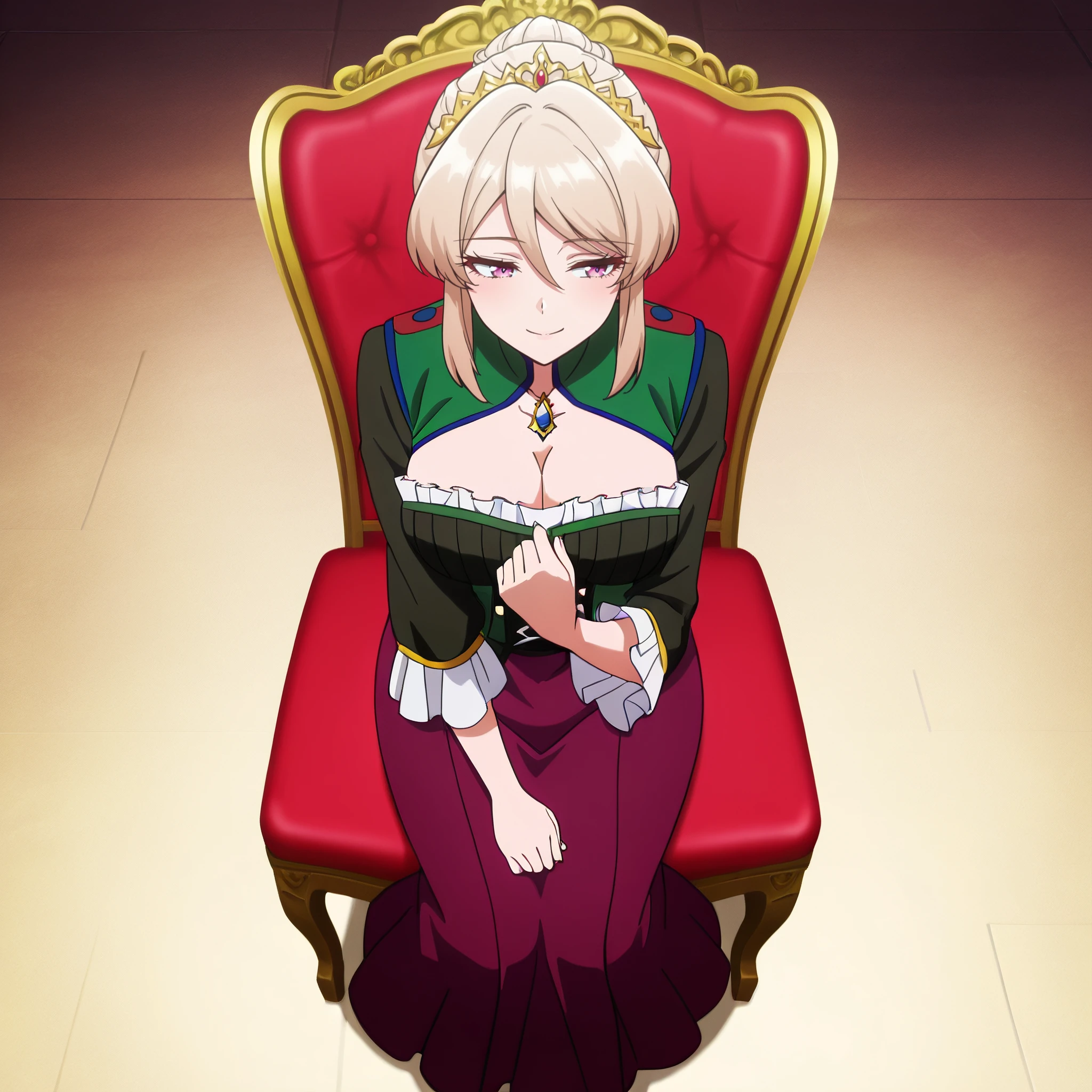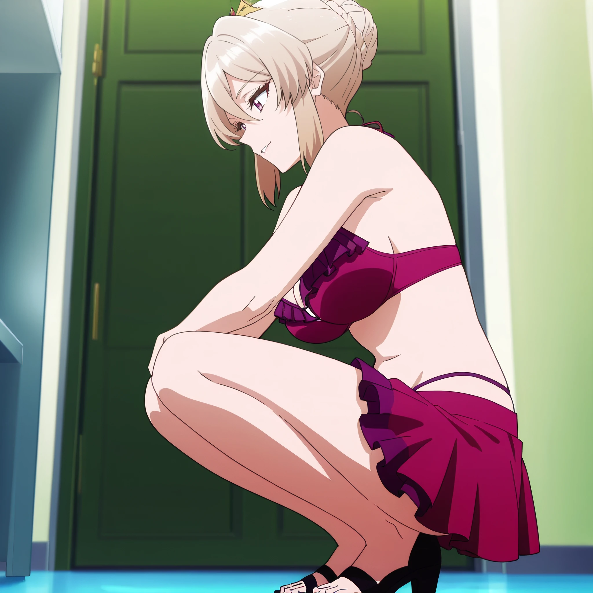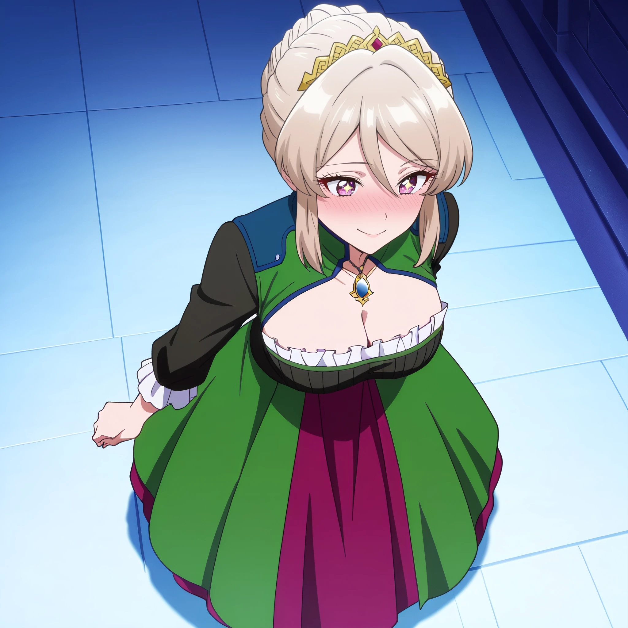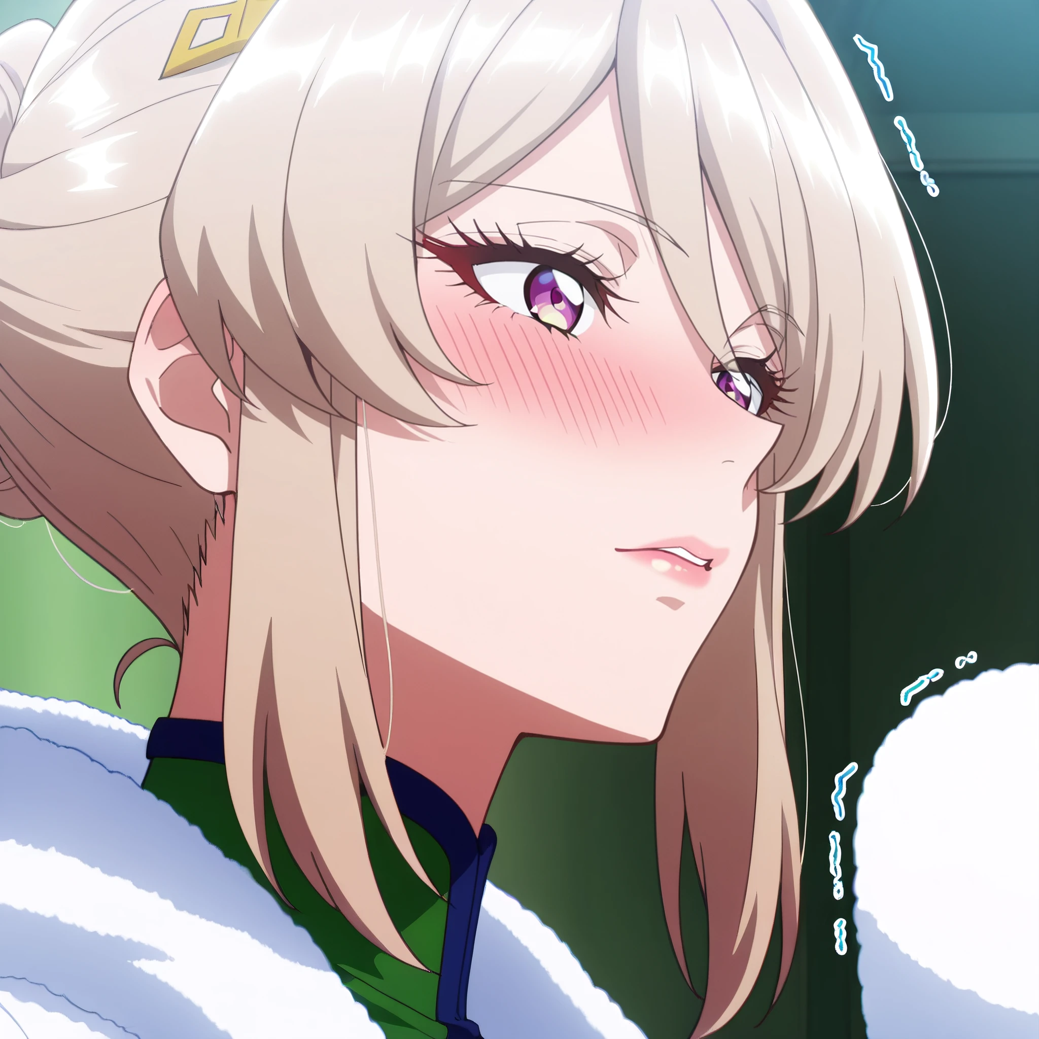 A4OAmaranthus, blonde hair, short hair, bangs, purple eyes, hair between eyes, hair bun, sidelocks,