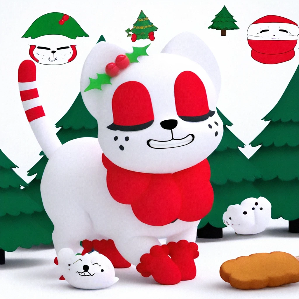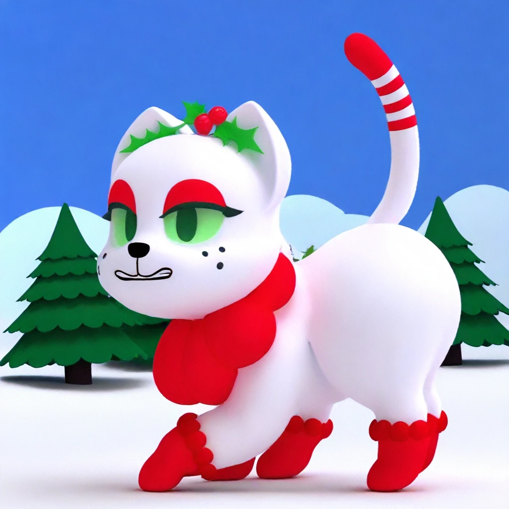 Junipurr, 1girl, solo, furry, white anthropomorphic cat, large light green eyes, red eyelids, thin black eyebrows, small black nose, three black freckles on each cheek, white ears, holly accessory with green leaves and two red berries on the head, large red scarf, red gloves on paws, white tail with red stripes