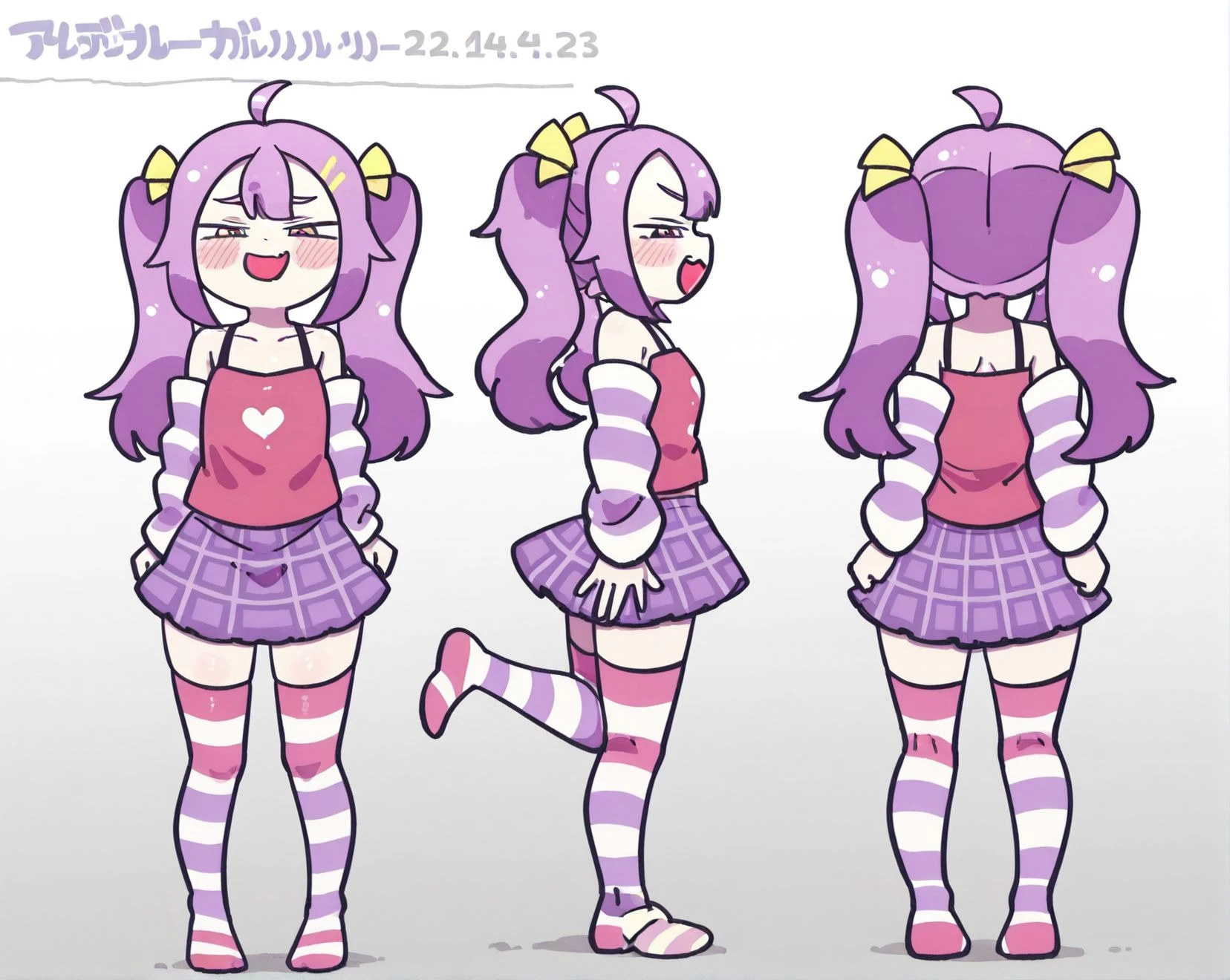 1girl, twintails, purple hair, yellow hairbow,ahoge,yaeba,