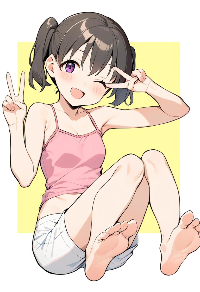 kuraue hinata, black hair, twintails, short twintails, purple eyes, short hair, eyebrows visible through hair, hair between eyes, pink camisole, pink shirt, spaghetti strap, white shorts, short shorts, socks, grey legwear, sneakers, red footwear