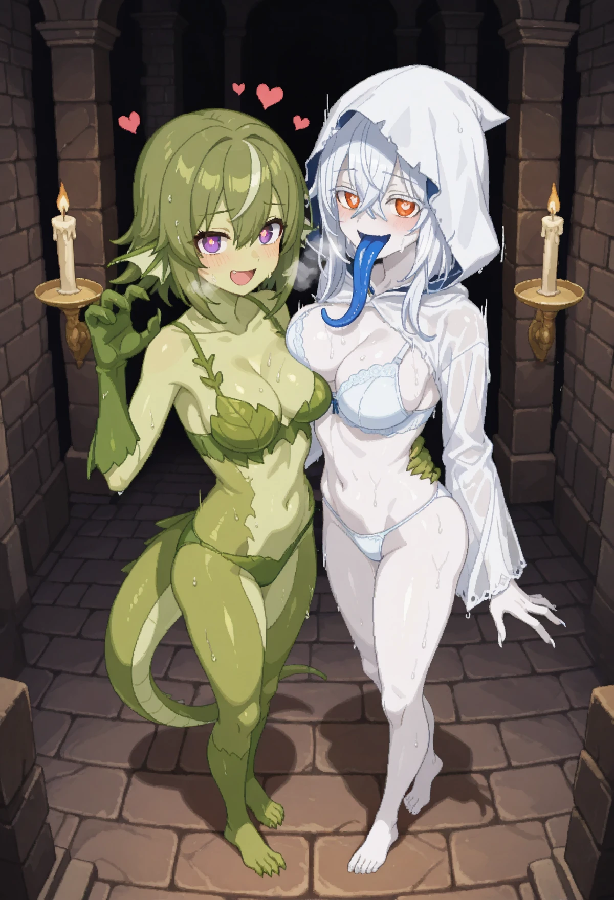 main trigger:spectre_nk,1girl, colored skin, orange eyes, white hair, hair between eyes,swimsuit, barefoot, breasts, monster girl, ghost girl, white skin, claws, bra,  long sleeves, tail, white hood, see-through clothes, see-through sleeves, white thong,very long tongue, blue tongue,pixel art