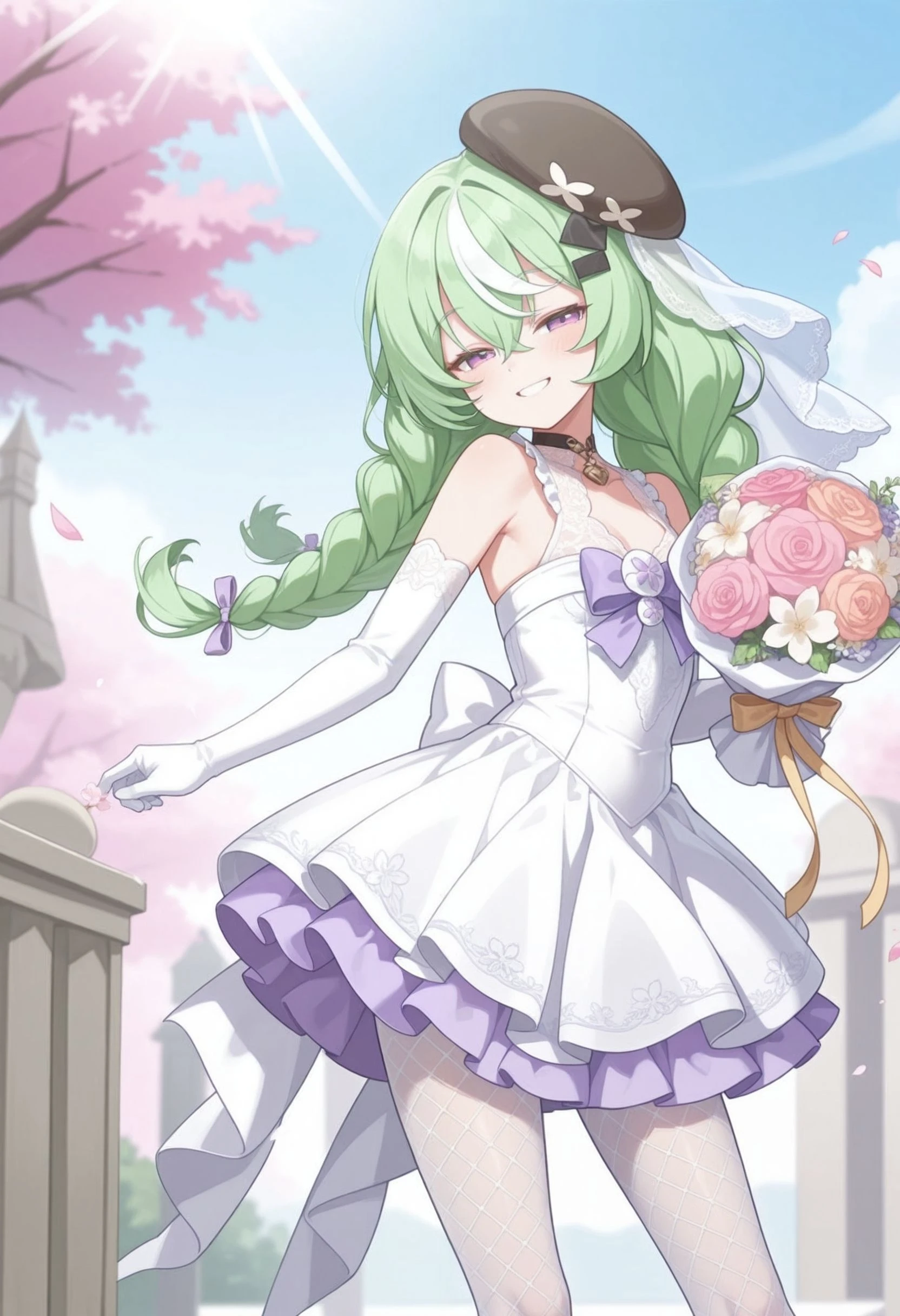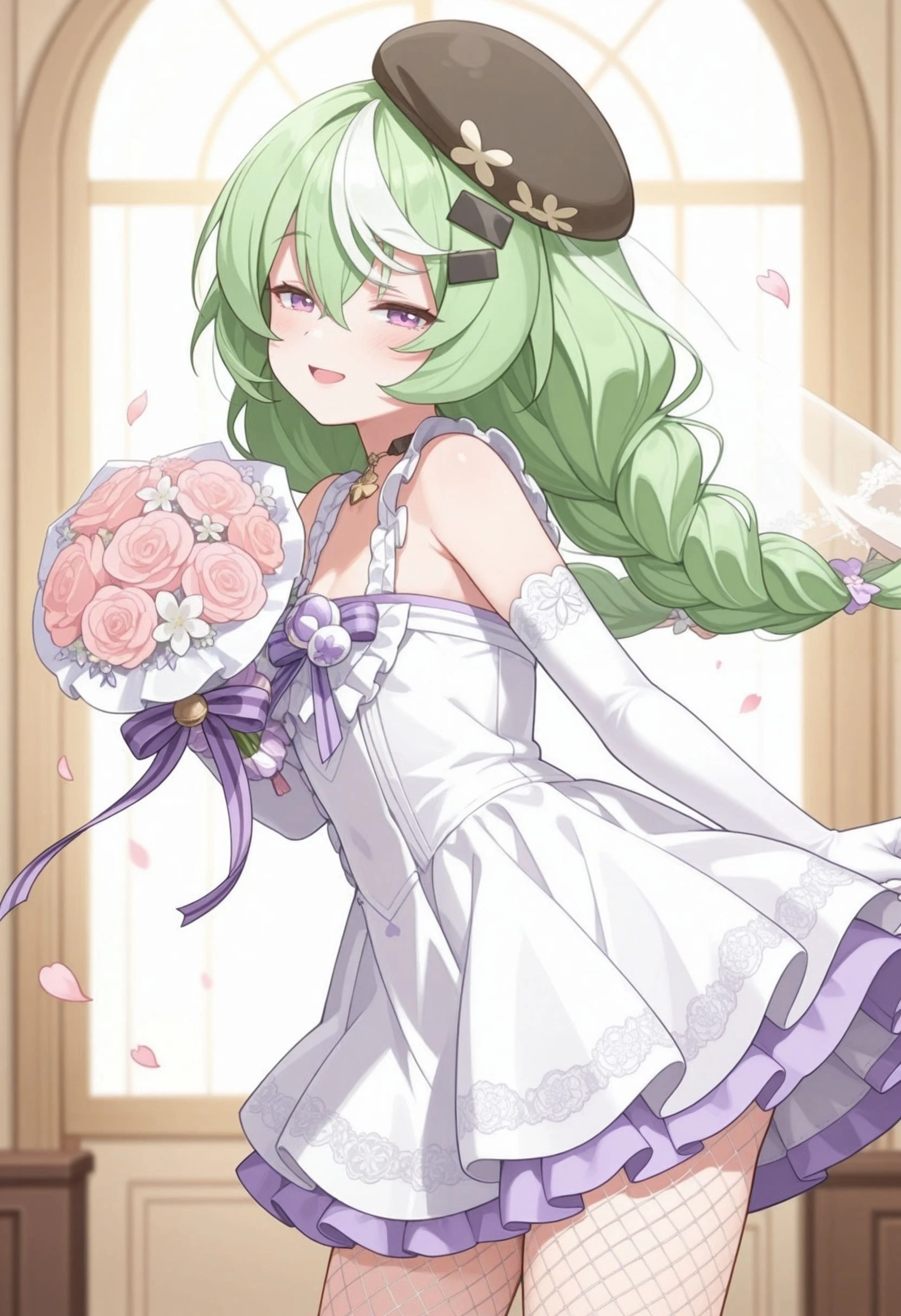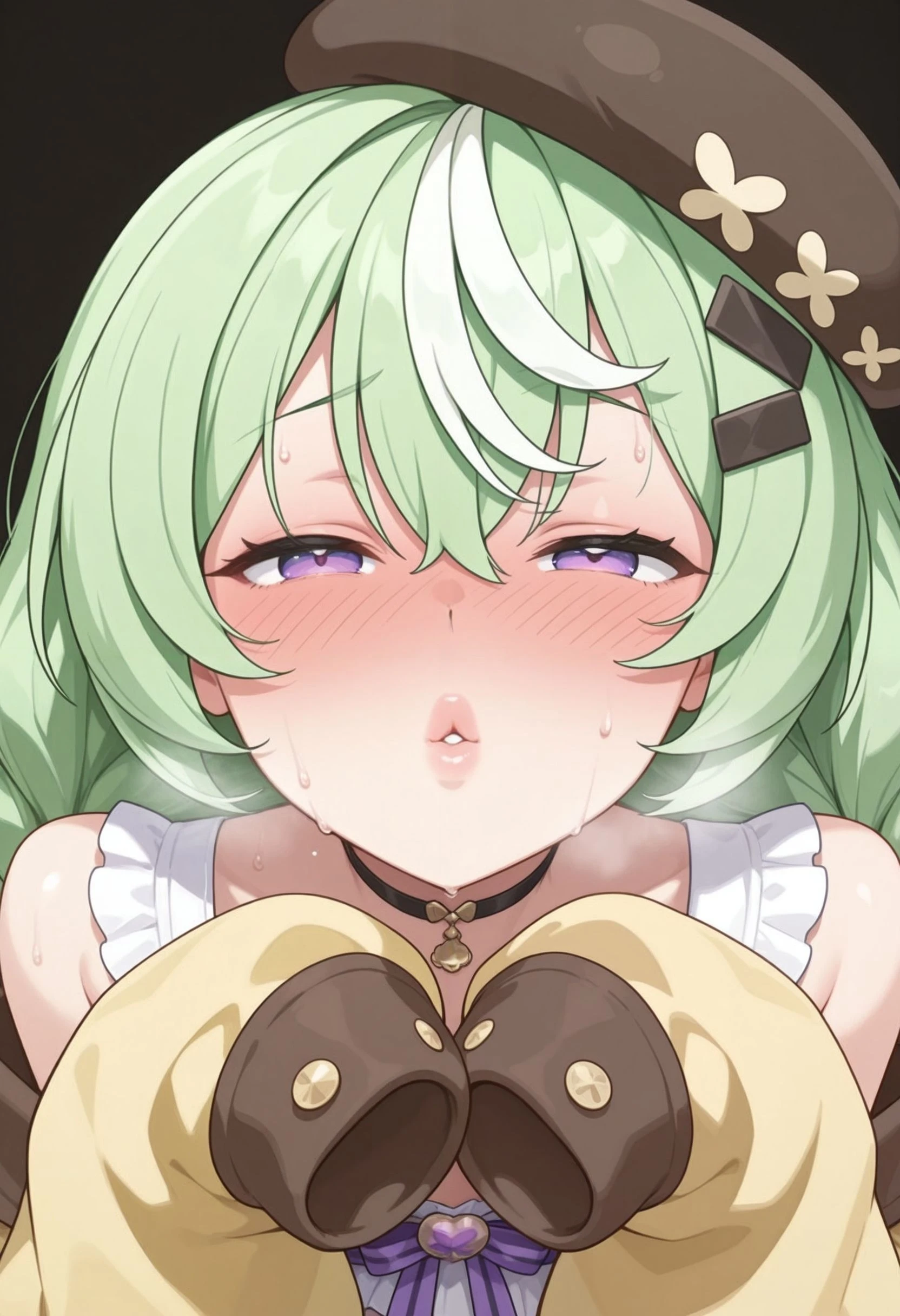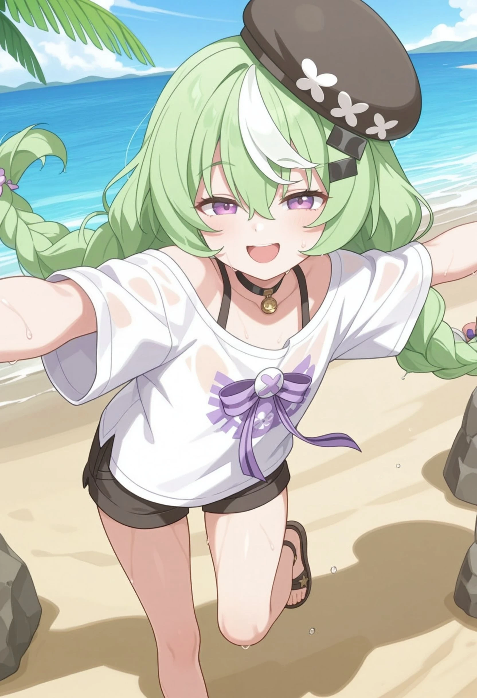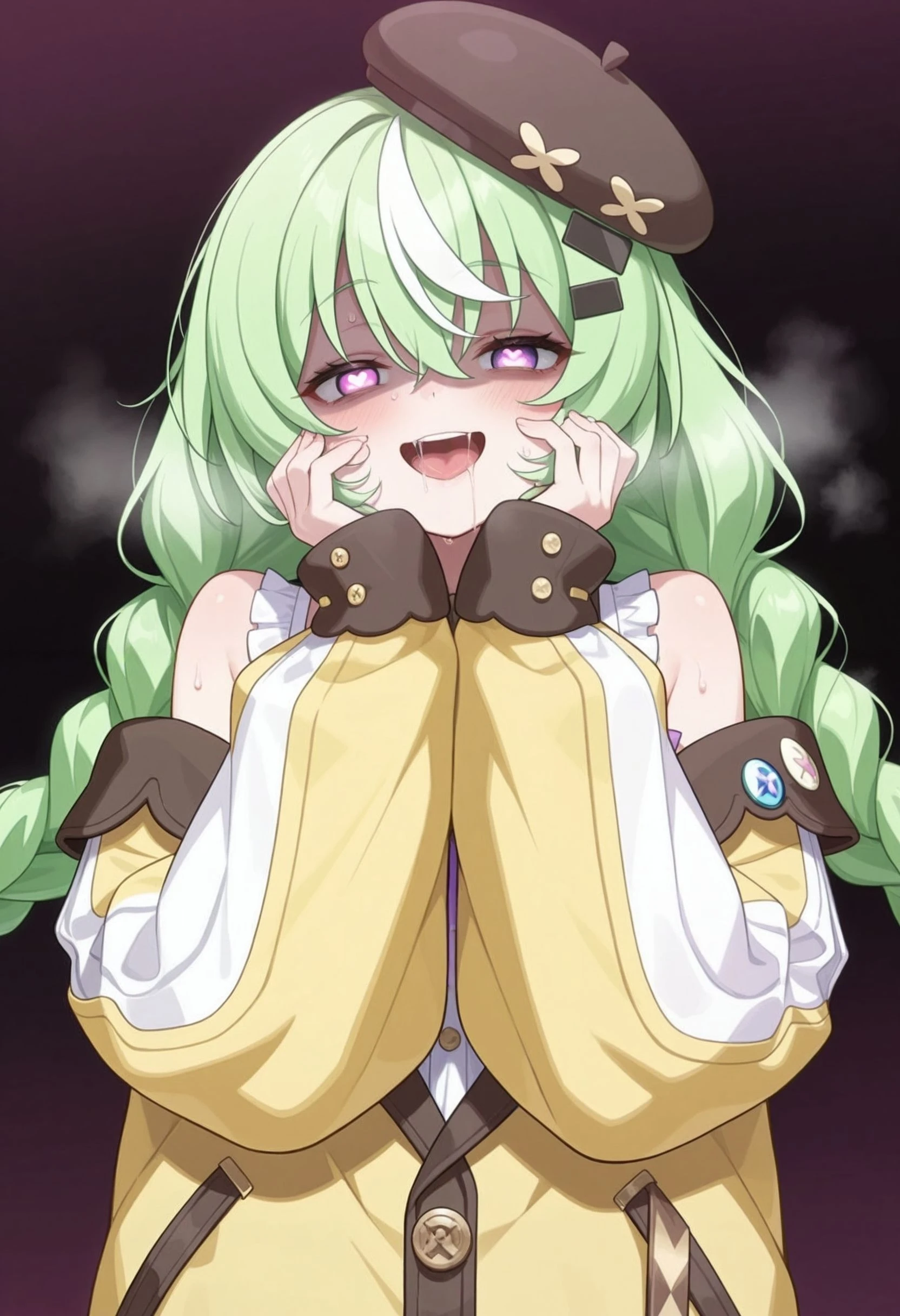 nazuna_\(stella_sora\), stllsrnzn, beret, black hat, braid, crossed bangs, green hair, purple eyes, hair between eyes, hat, long hair, low twin braids, multicolored hair, streaked hair, <lora:stella_sora_nazuna_illustrious:0.8>