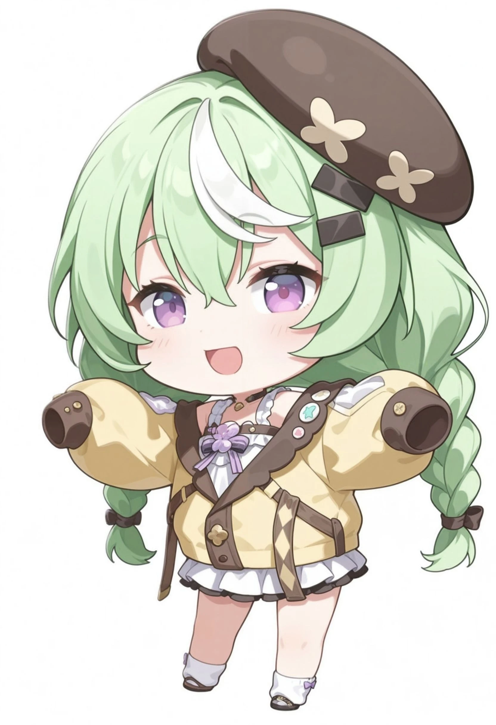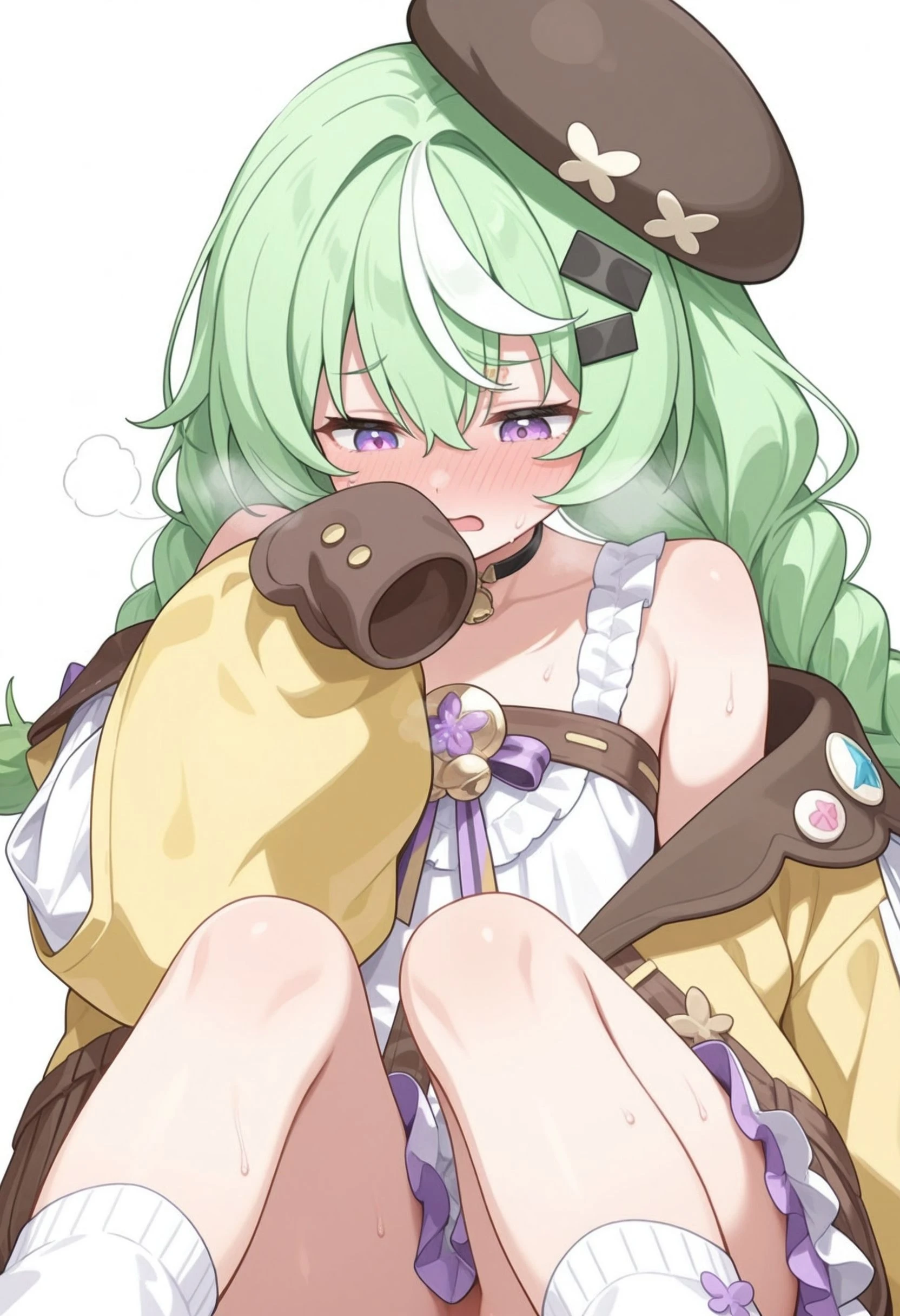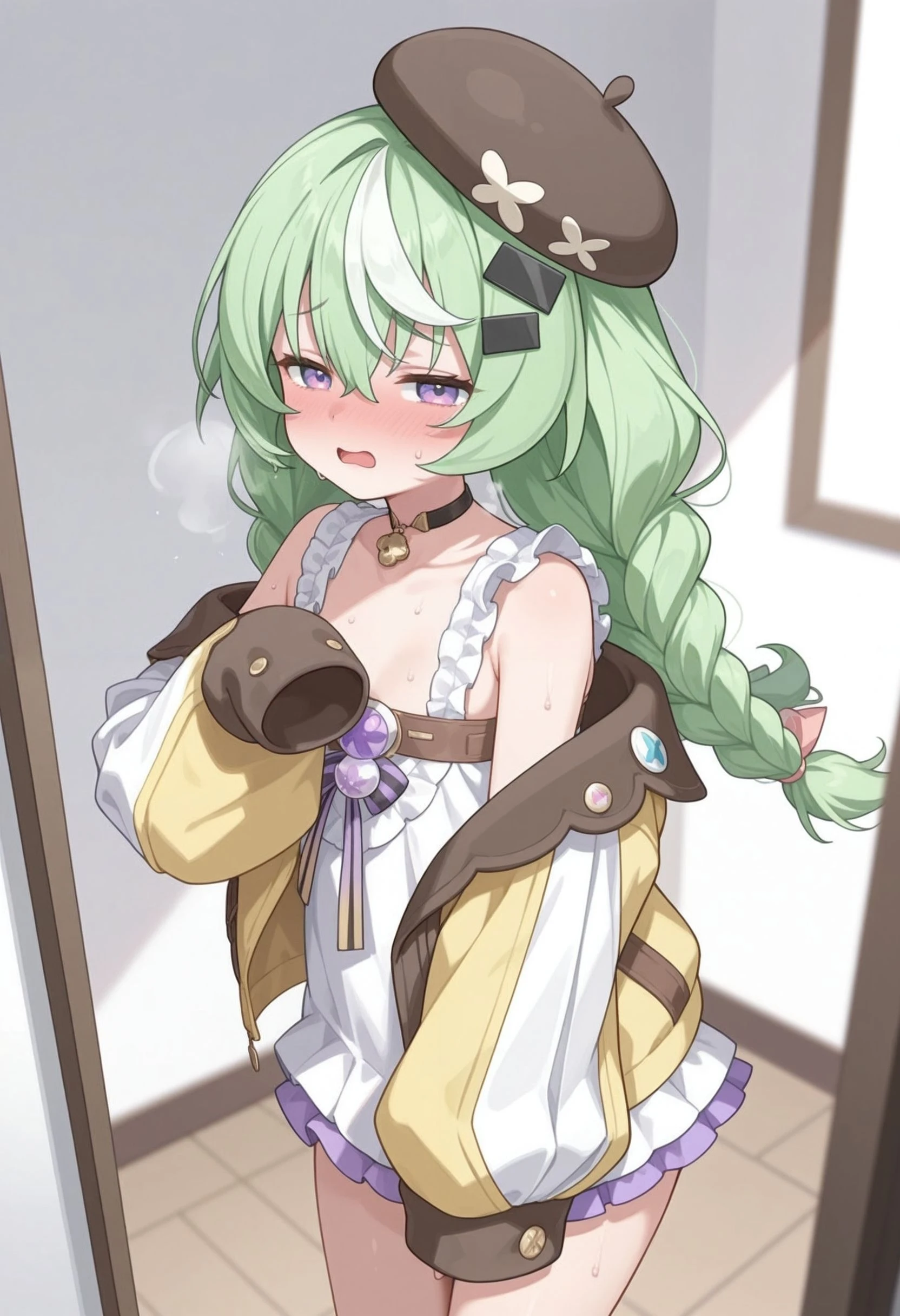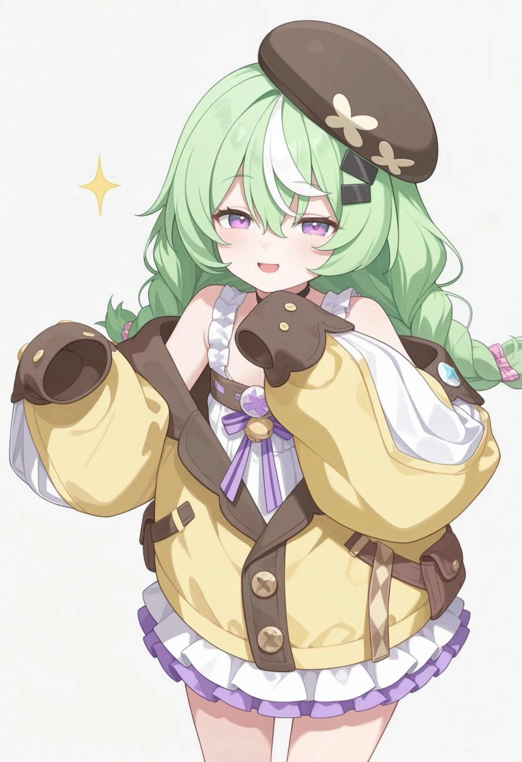 nazuna_\(stella_sora\), stllsrnzn, ???? shoulders, beret, black hat, braid, crossed bangs, dress, frilled dress, frills, green hair, purple eyes, hair between eyes, hat, jacket, long hair, long sleeves, loose socks, low twin braids, multicolored hair, streaked hair, off shoulder, puffy long sleeves, puffy sleeves, short dress, sleeveless, sleeveless dress, sleeves past fingers, sleeves past wrists, <lora:stella_sora_nazuna_illustrious:0.8>Without Clothes