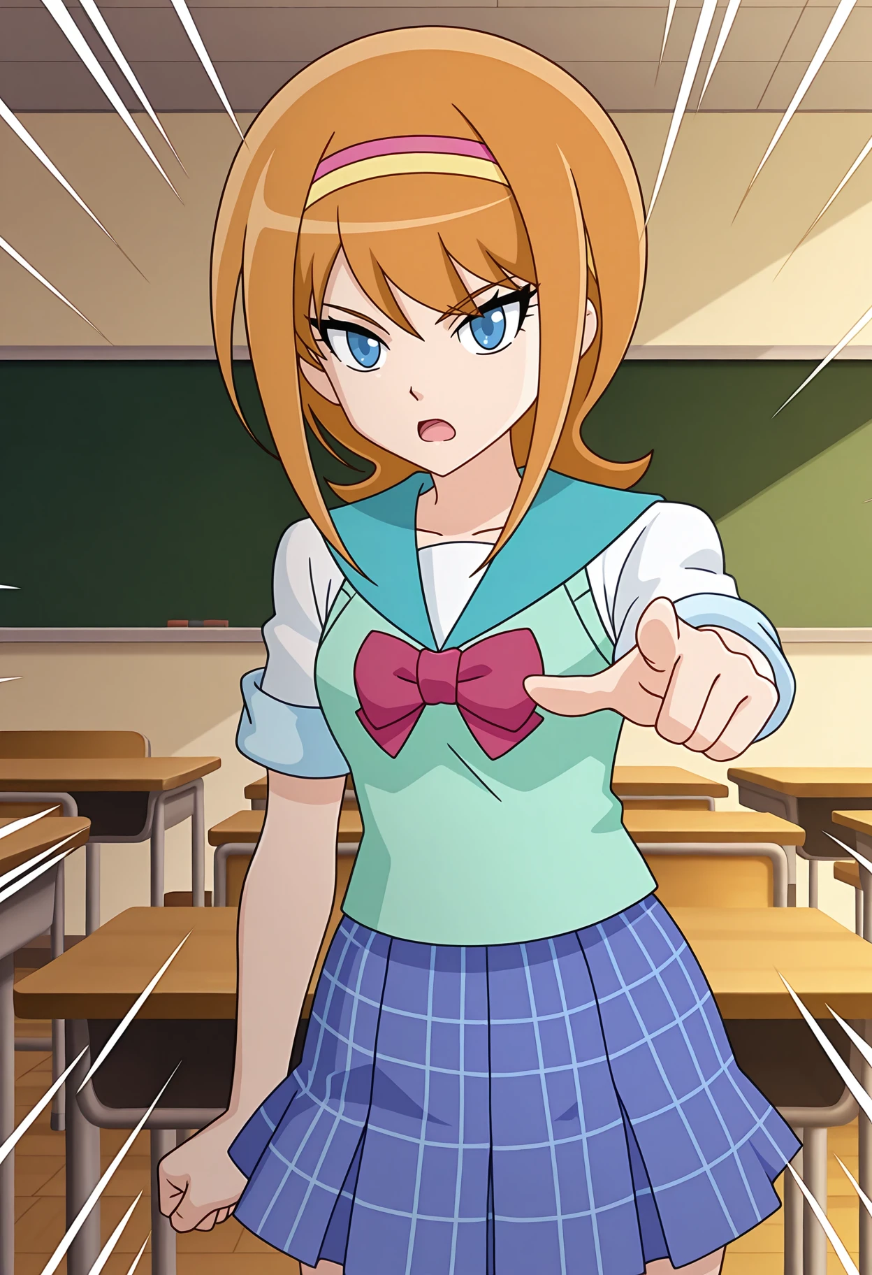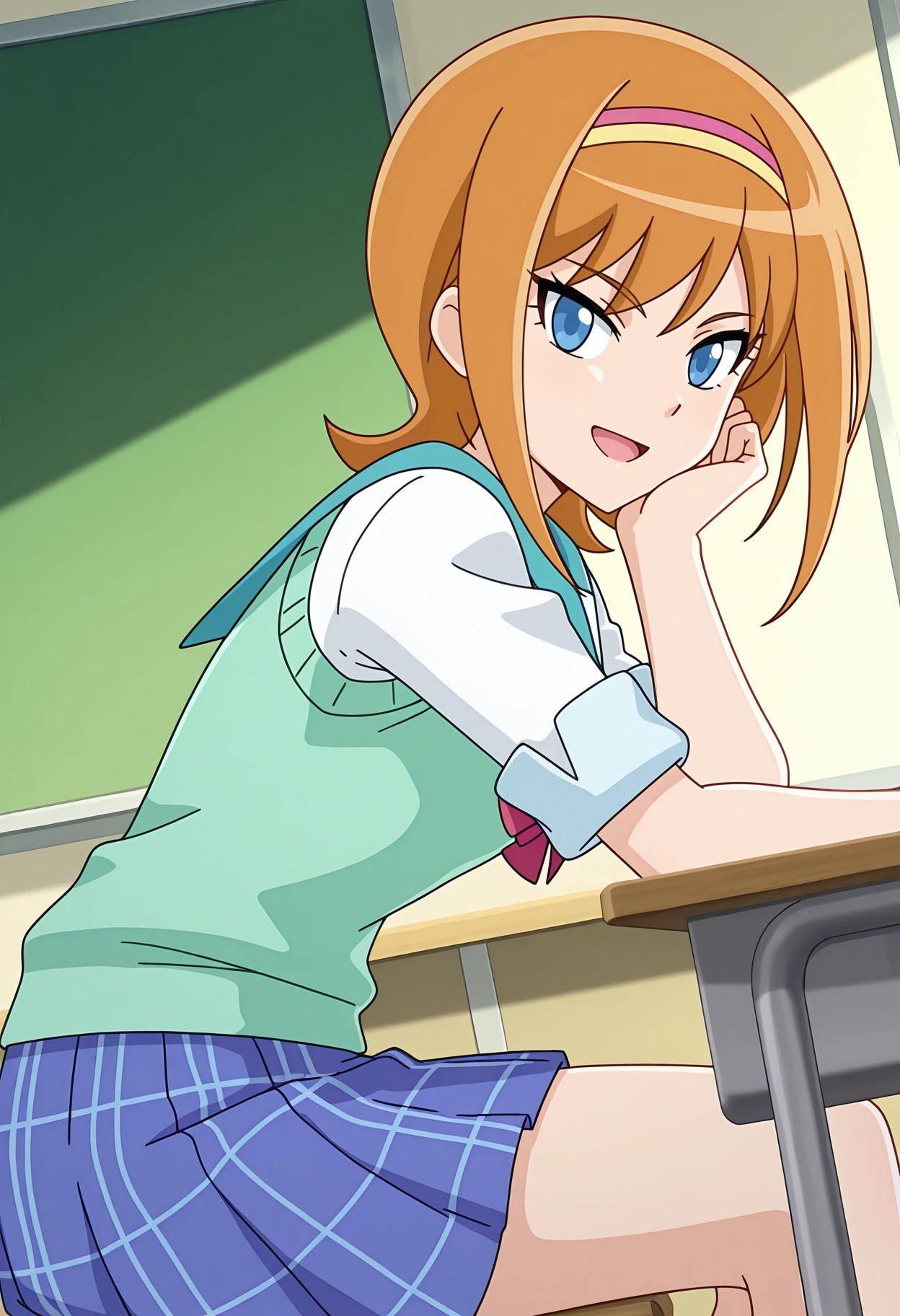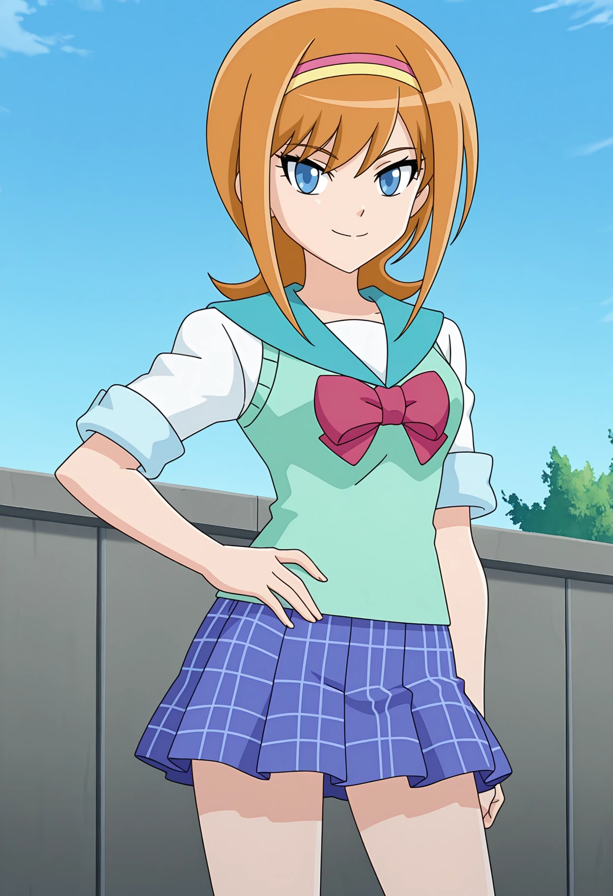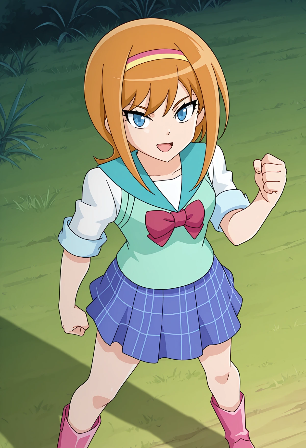 school uniform, pink hairband, yellow hairband, white shirt, short sleeves, sleeves rolled up, green sweater vest, aqua sailor collar, plaid skirt, blue skirt, pleated skirt, pink footwear, boots,