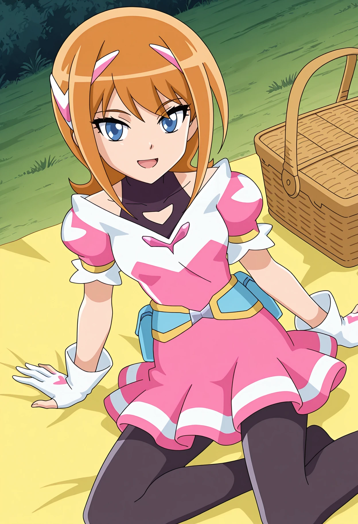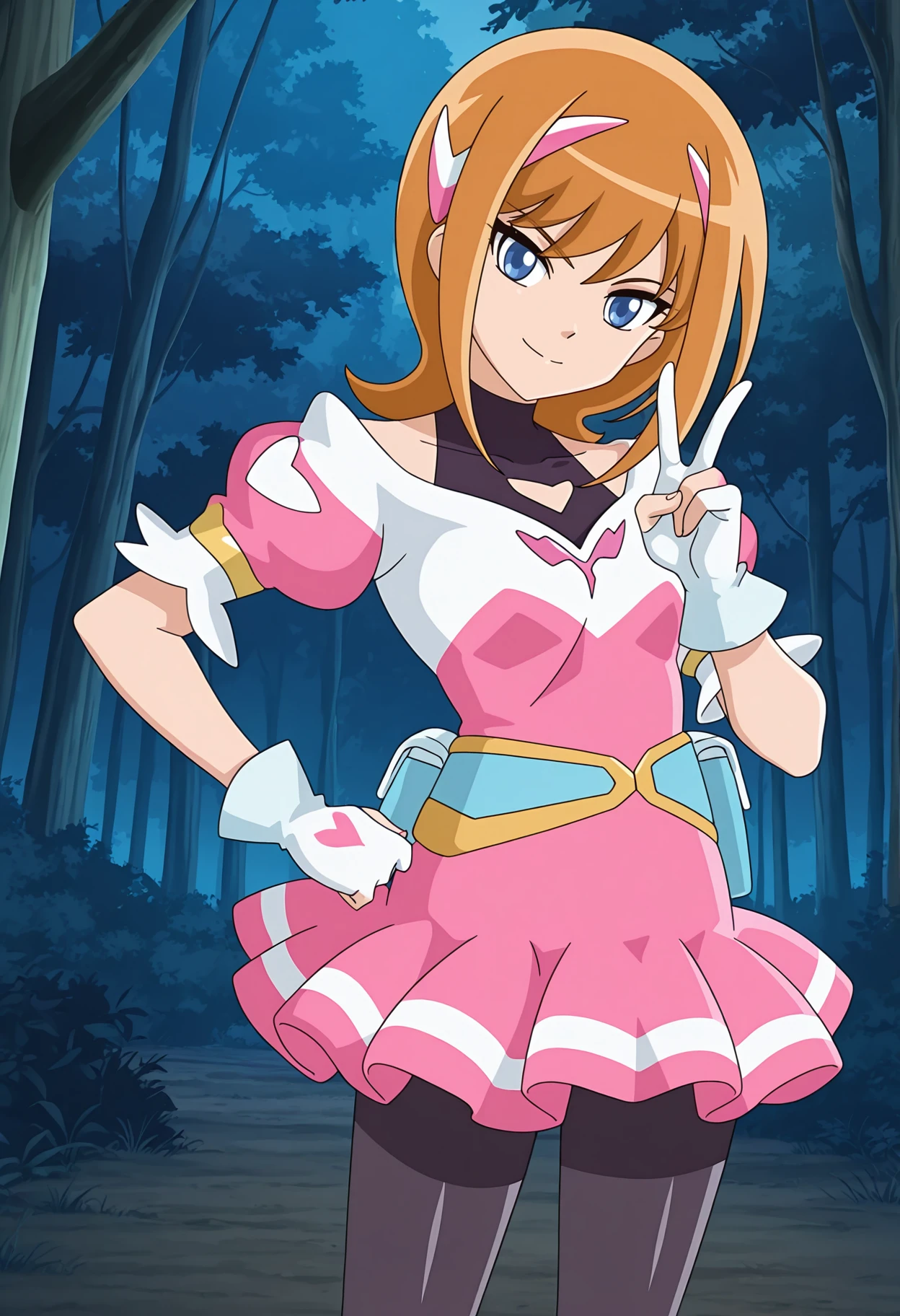magical girl, headgear, clothing cutout, black shirt, covered collarbone, halterneck, puffy short sleeves, pink dress, short dress, belt, belt pouch, black pantyhose, white gloves, partially fingerless gloves,