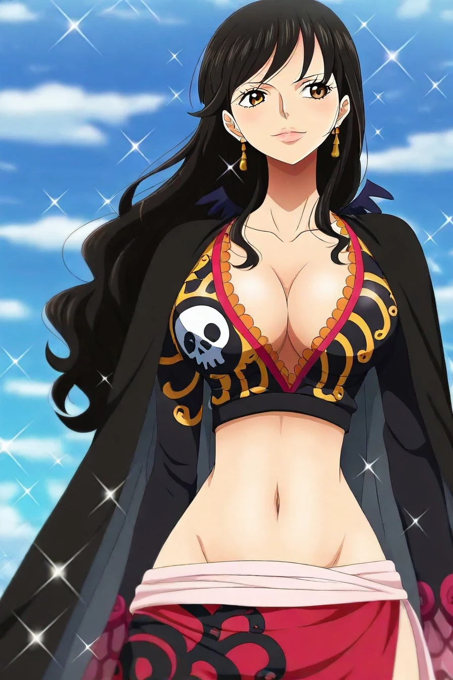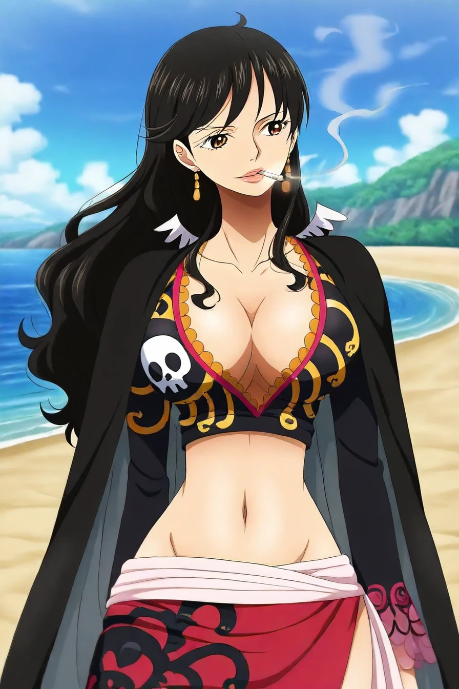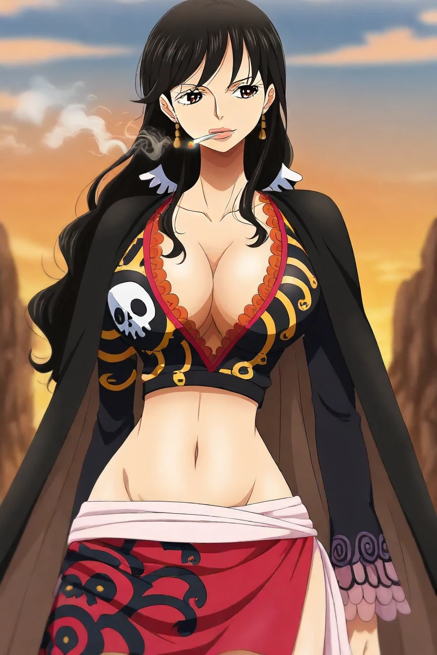 outfit : black crop top, black cape, navel, sash, red skirt, skull print, cigarette, smoking,