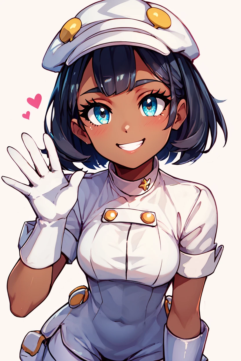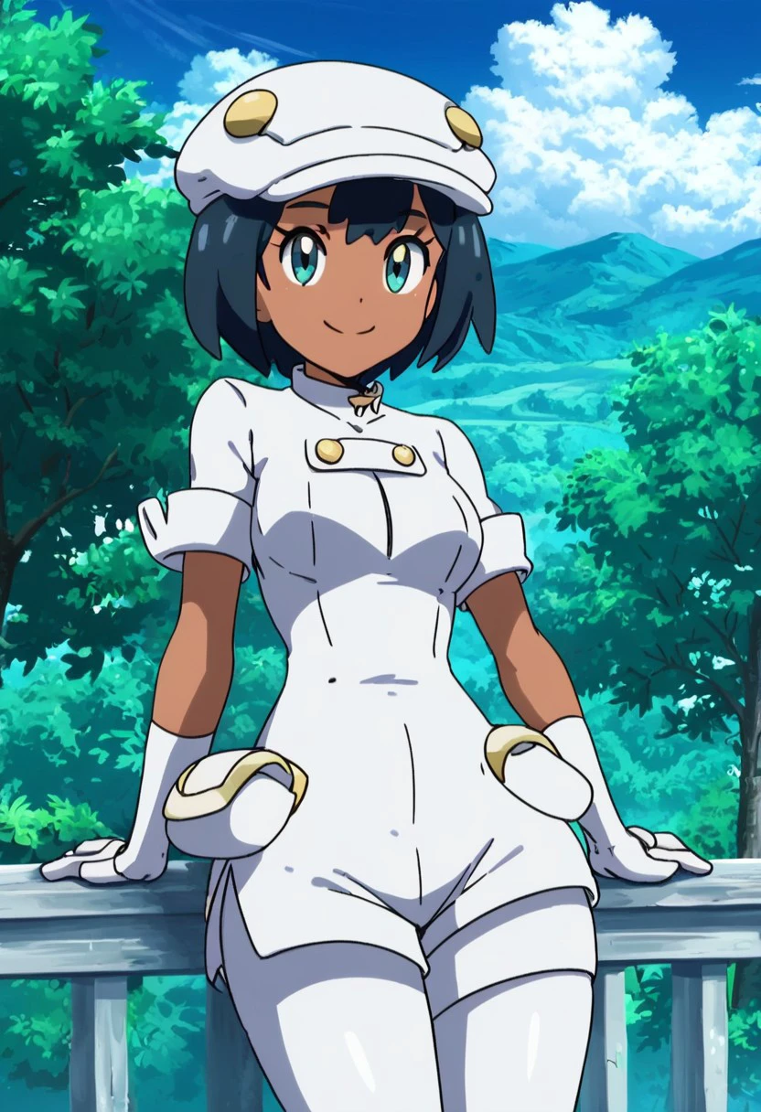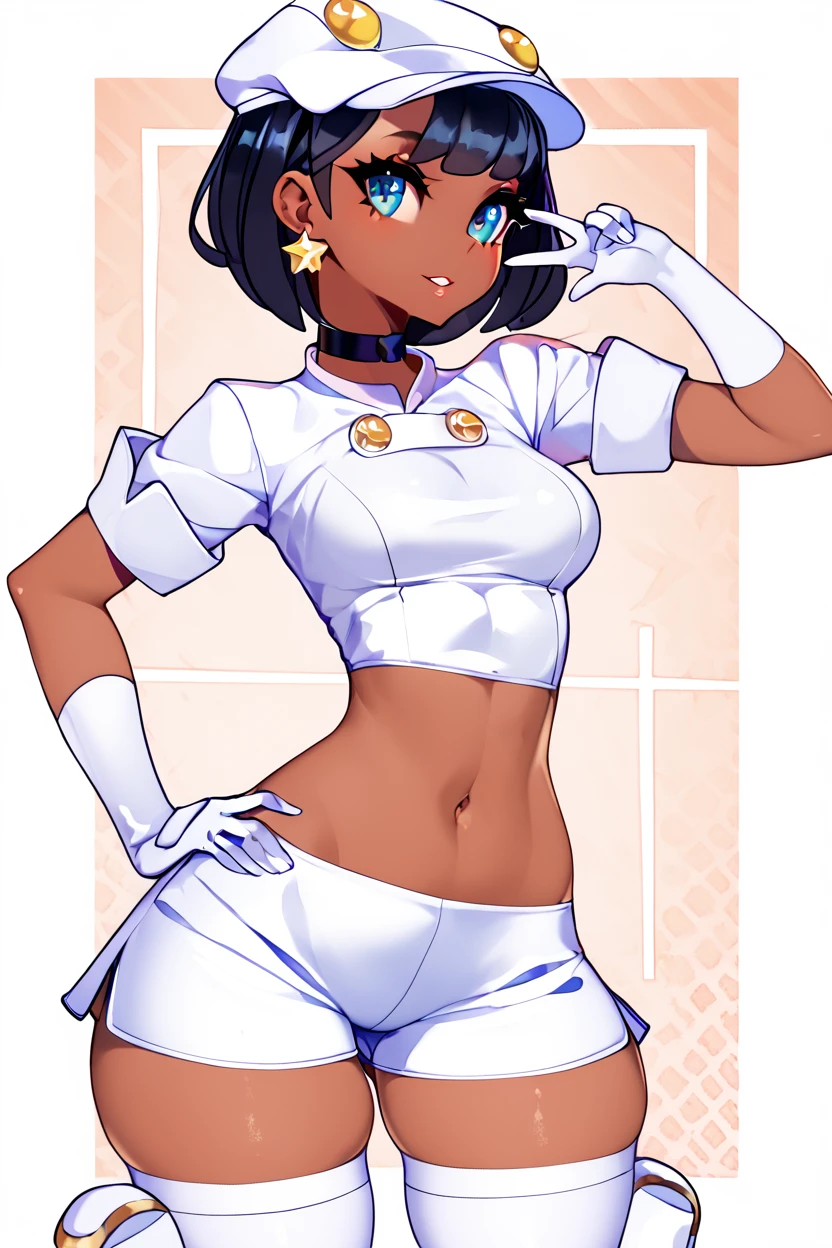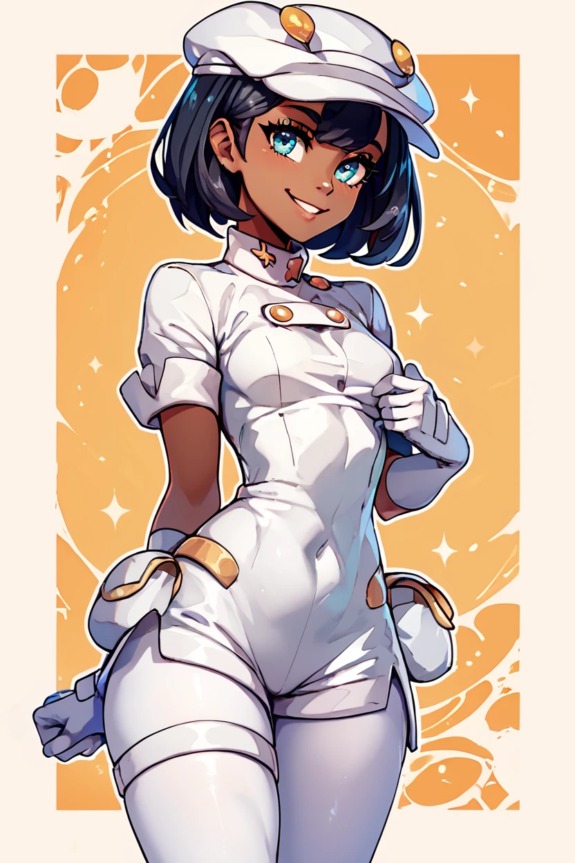 zzAether, dark skin, white cabbie hat, black hair, white uniform, white pantyhose, white gloves,