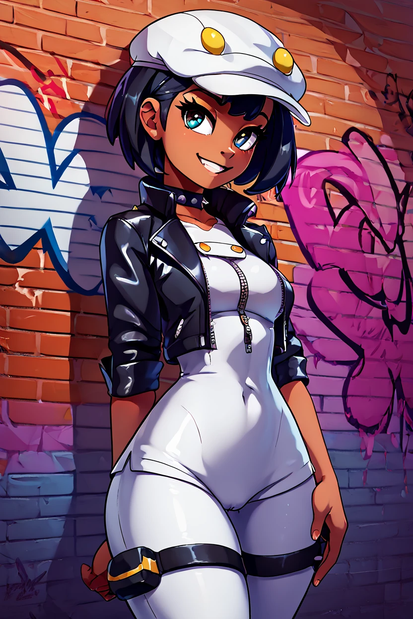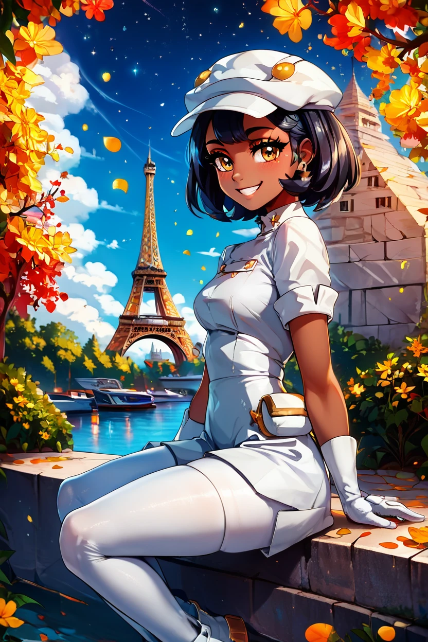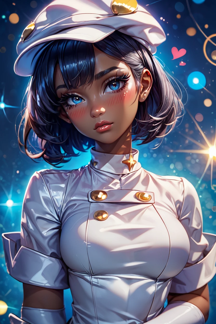 zzAether, dark skin, white cabbie hat, black hair, white uniform, white pantyhose, white gloves,
