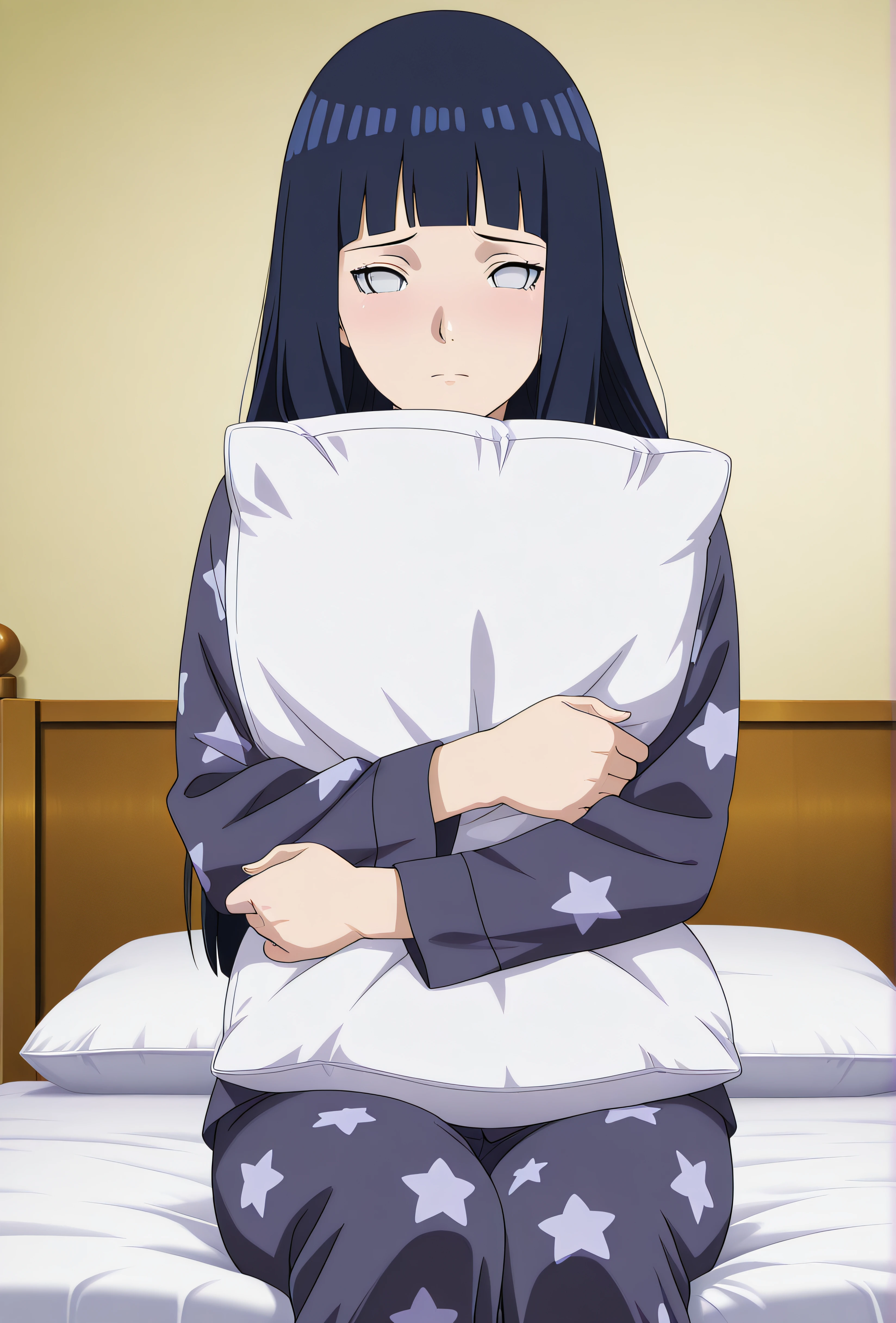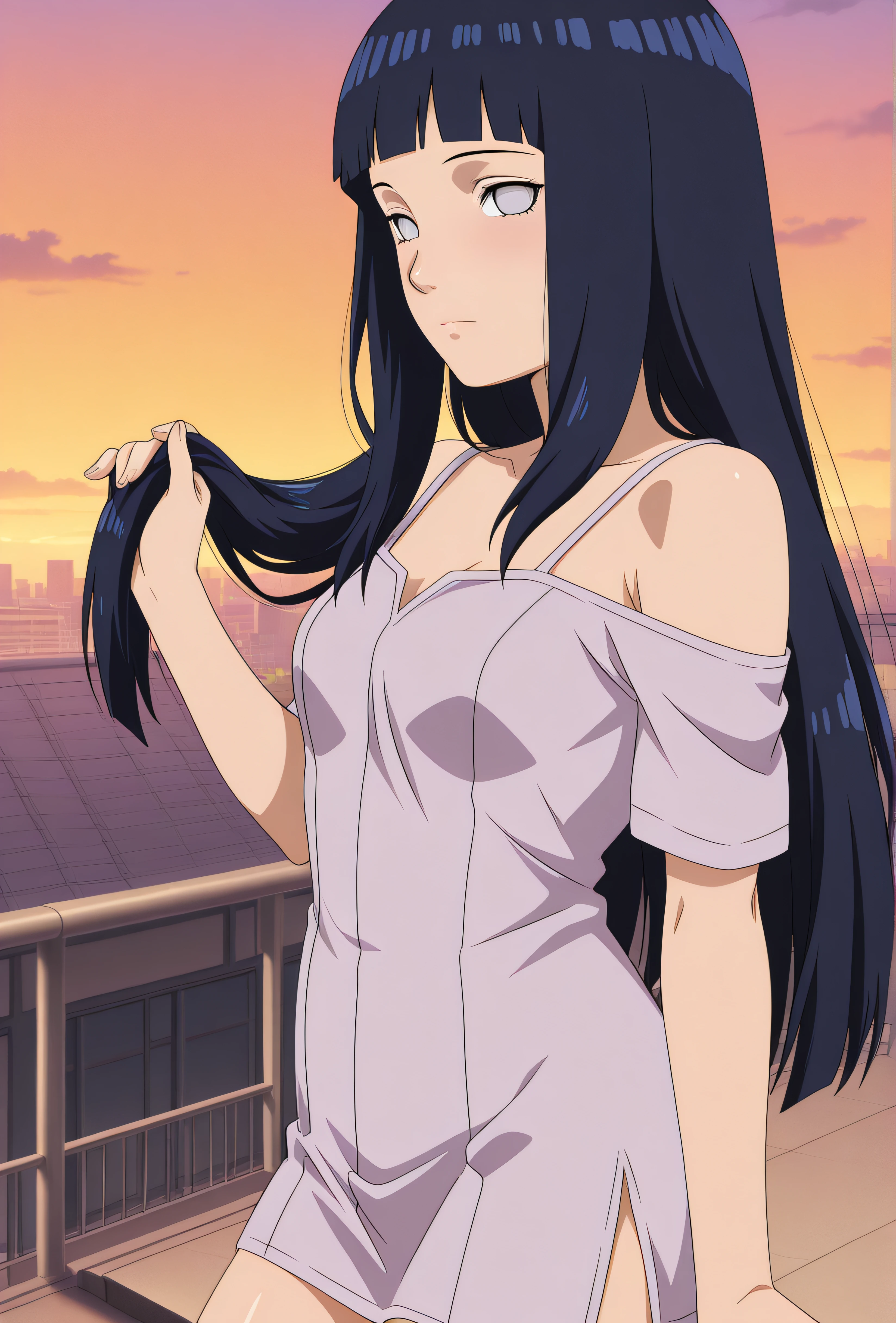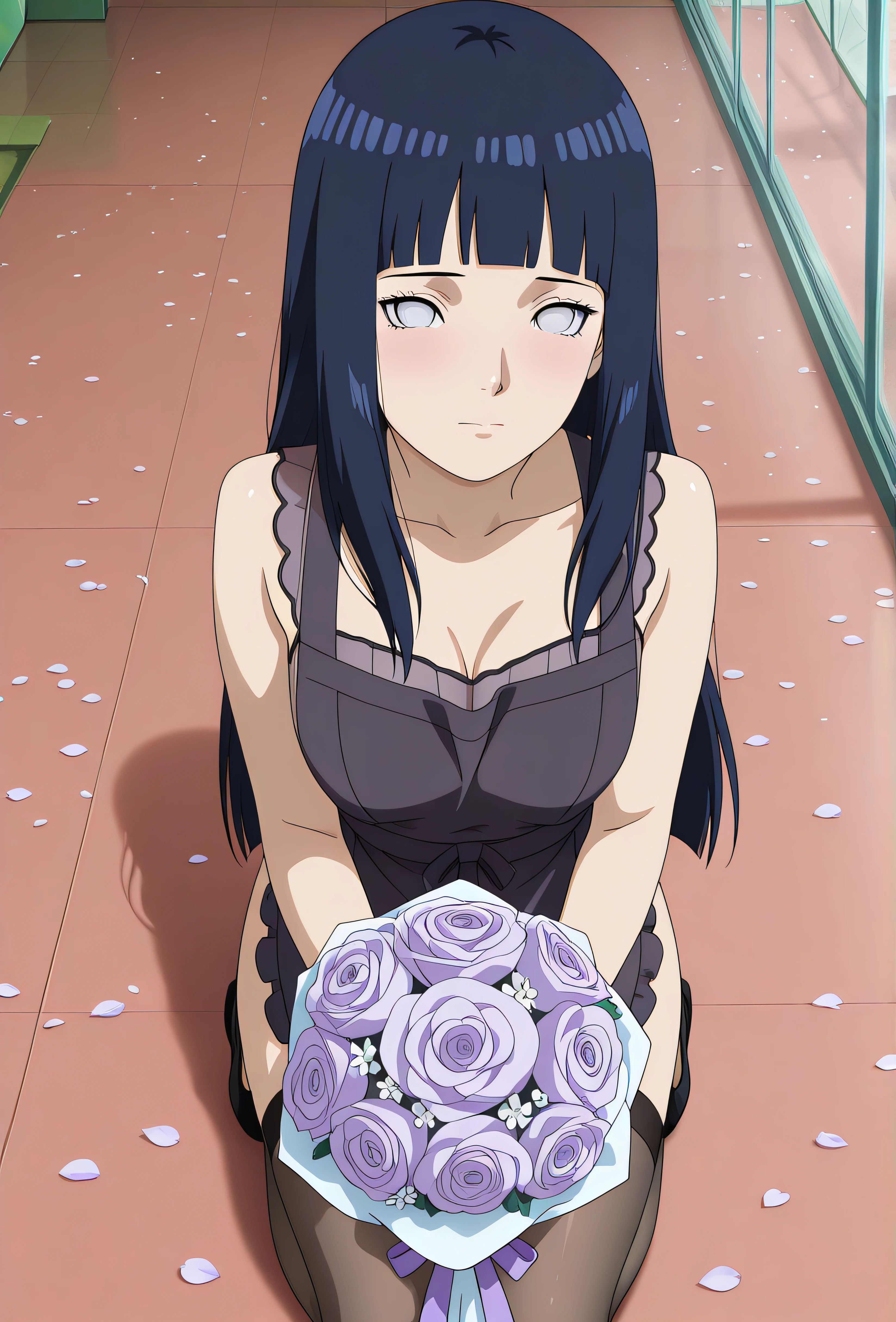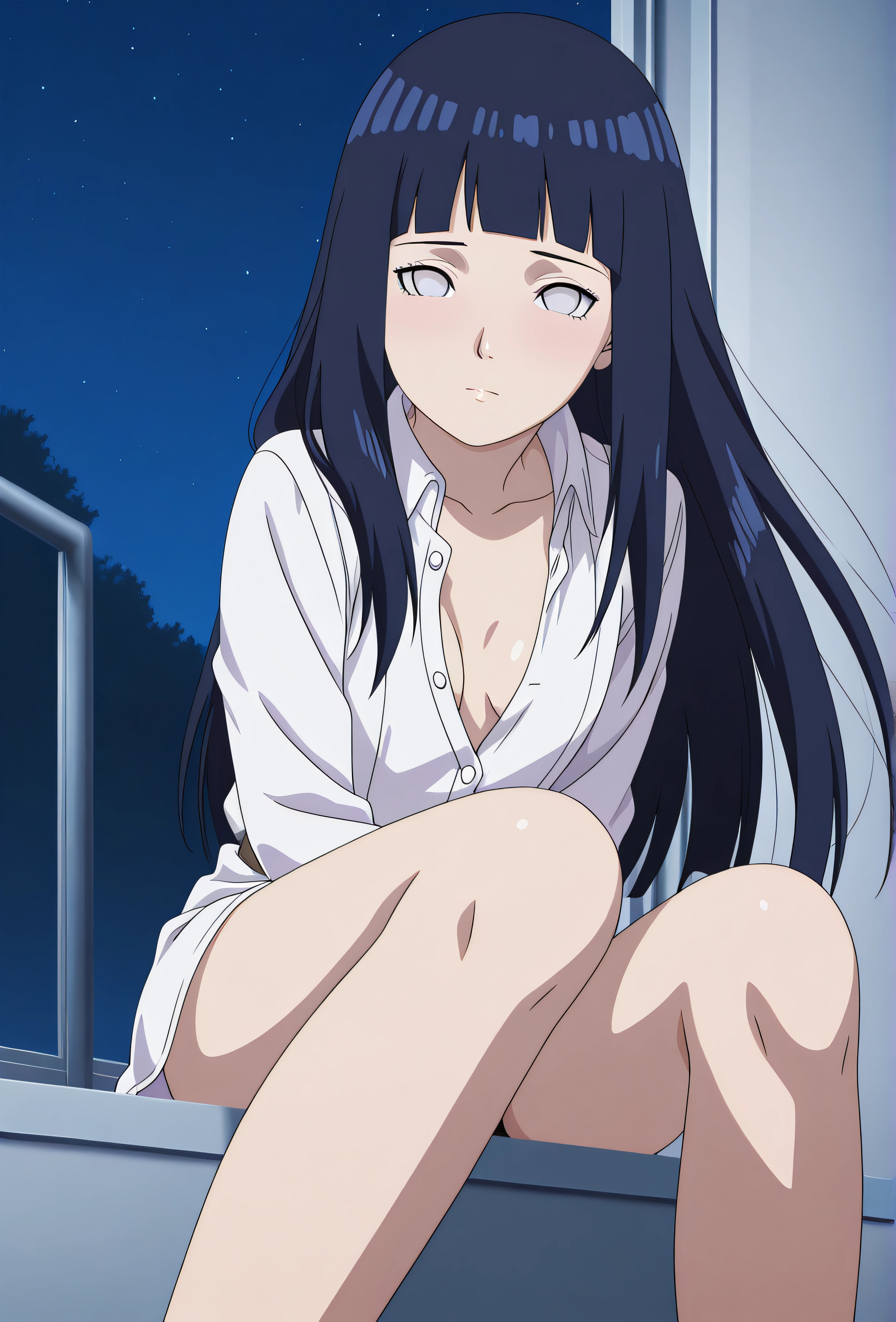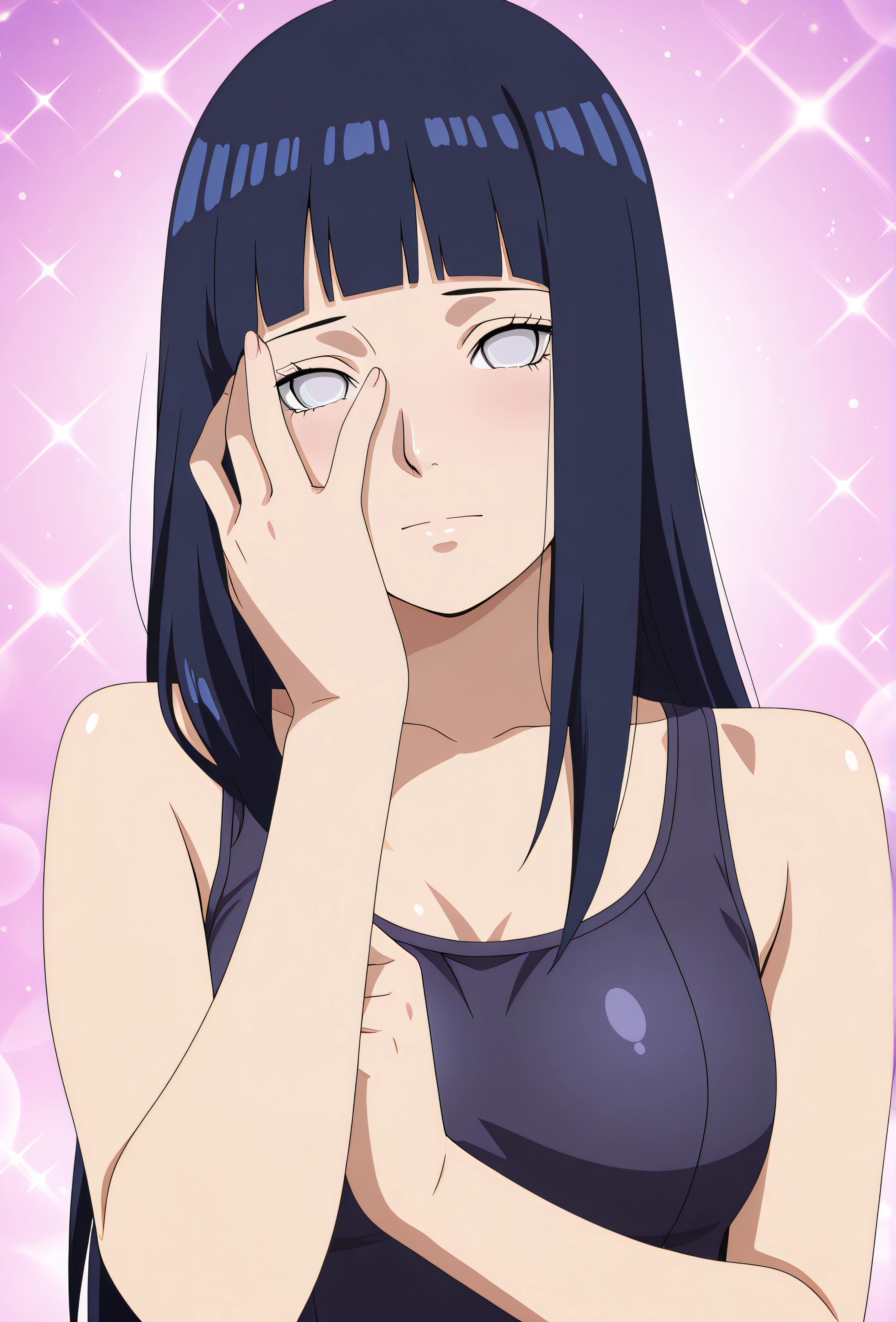 hina, long hair, dark blue hair, straight hair, blunt bangs, pale lavender eyes, white eyes, pupil-less eyes, anime style, anime coloring, anime screencap