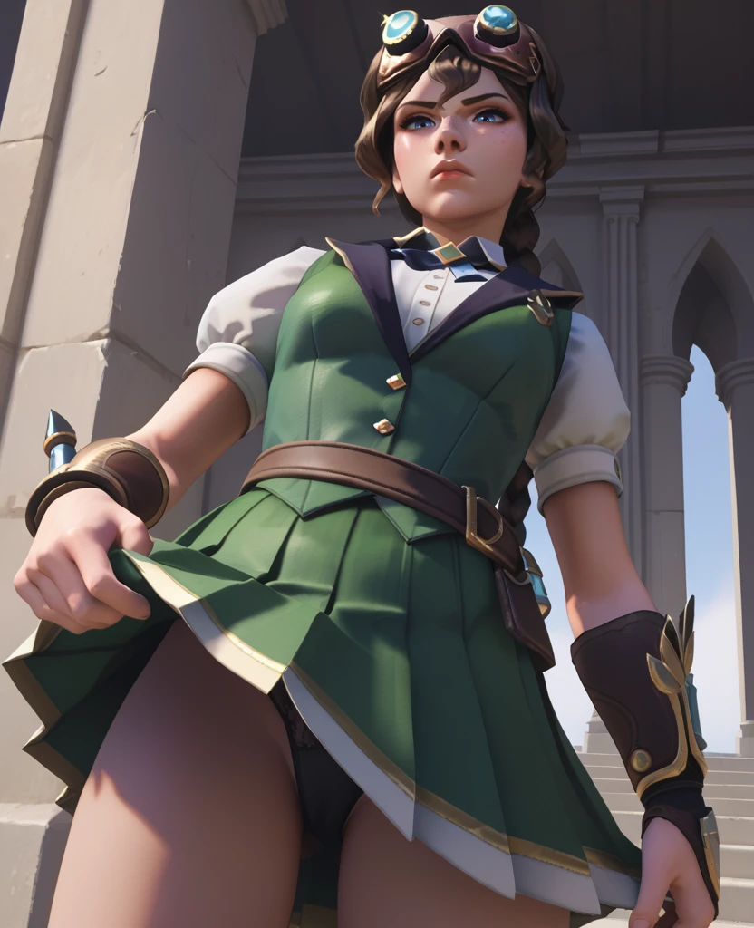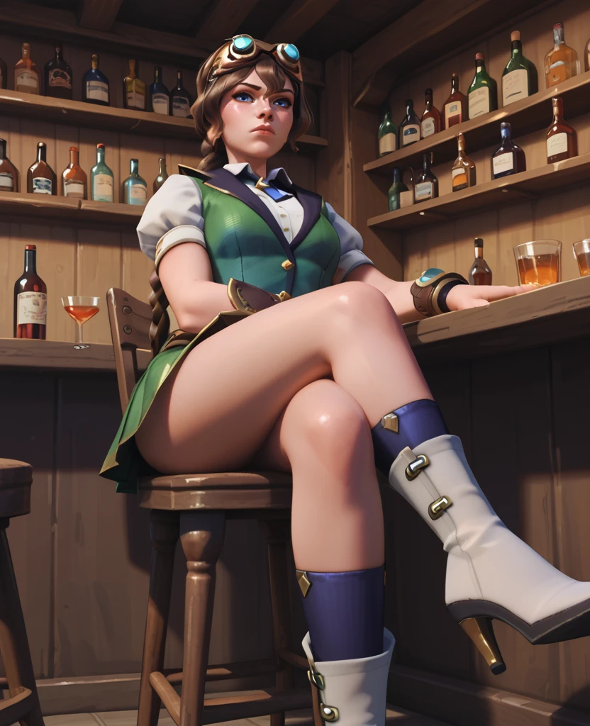 goggles, goggles on head, skirt, shirt, short sleeves, pleated skirt, puffy sleeves, belt, vest, bracer, boots, socks, knee boots, high heel boots, kneehighs white footwear,