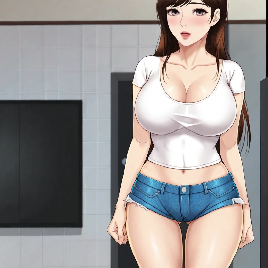 Trigger with short pants outfit: YeonSu, large breasts, 1girl, short shorts, white shirt, brown hair, midriff, navel, cleavage, crop top, denim shorts, thigh gap, long hair, brown eyes, short sleeves, collarbone, swept bangs, thighs, taut shirt, cowboy shot
