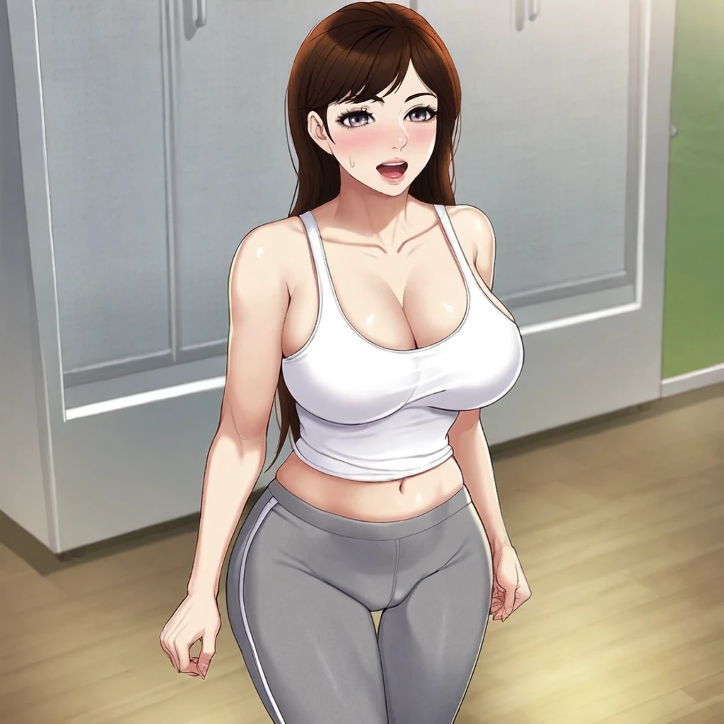 Trigger with yoga clothes: YeonSu, large breasts, 1girl, solo, cleavage, white tank top, yoga pants, brown hair, long hair, bare shoulders, midriff, bangs, collarbone, sweatpants, cowboy shot
