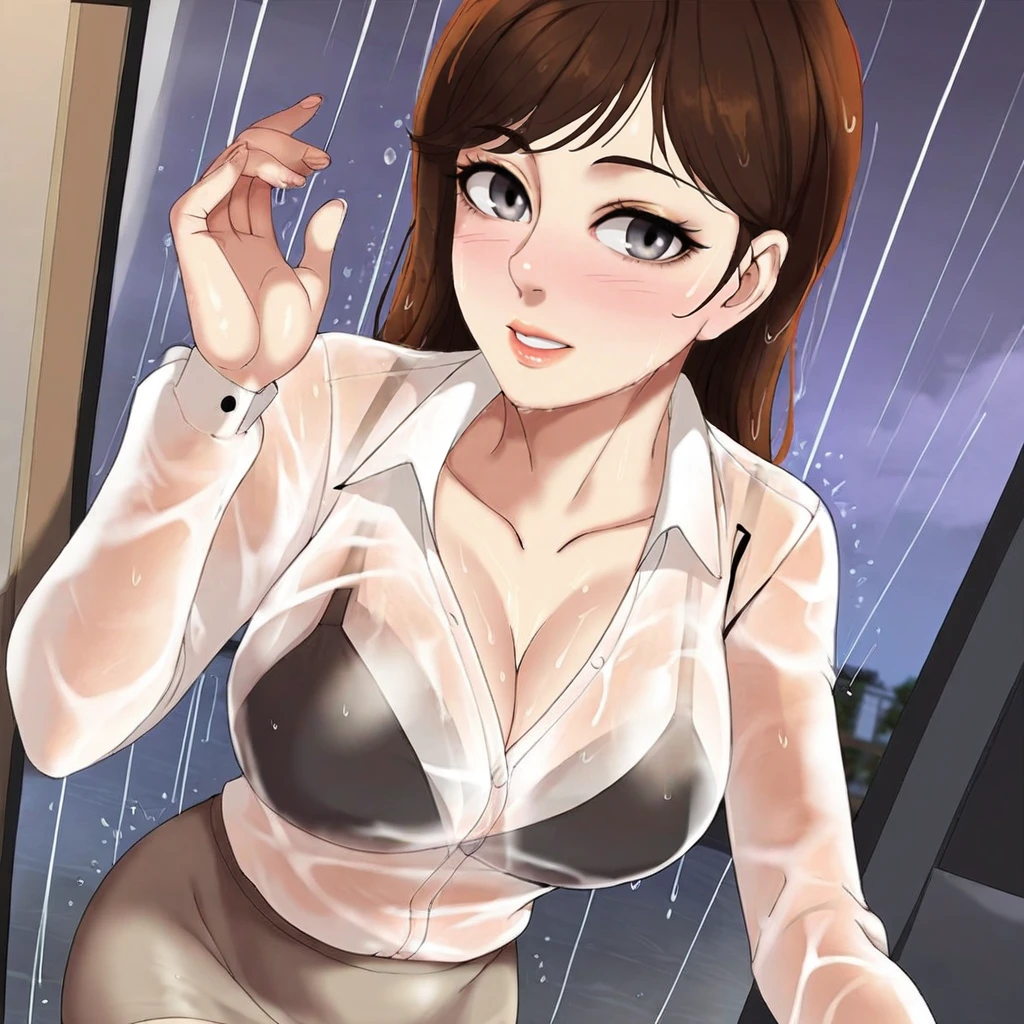 Trigger with see-through clothes: YeonSu, 1girl, solo, large breasts, black pantyhose, pencil skirt, wet clothes, brown hair, white shirt, underwear, see-through, bra visible through clothes, cleavage, office lady, black bra, wet shirt, long hair, collared shirt, grey eyes, bangs, collarbone, long sleeves, cowboy shot