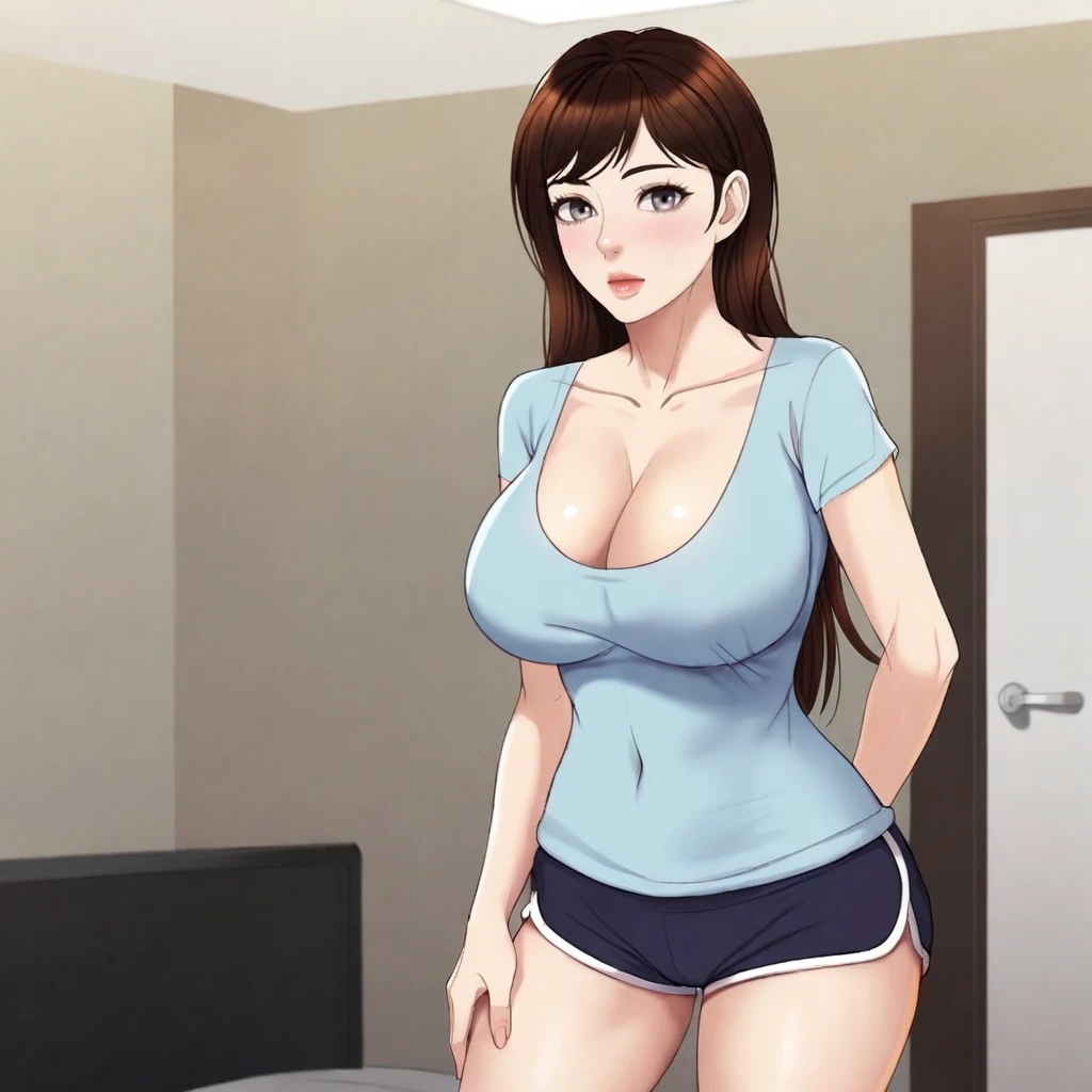 Trigger with short pants and t-shirt: YeonSu, large breasts, 1girl, cleavage, short shorts, long hair, brown hair, blue shirt, covered navel, collarbone, dolphin shorts, black shorts, bangs, short sleeves, grey eyes, t-shirt, lips, cowboy shot