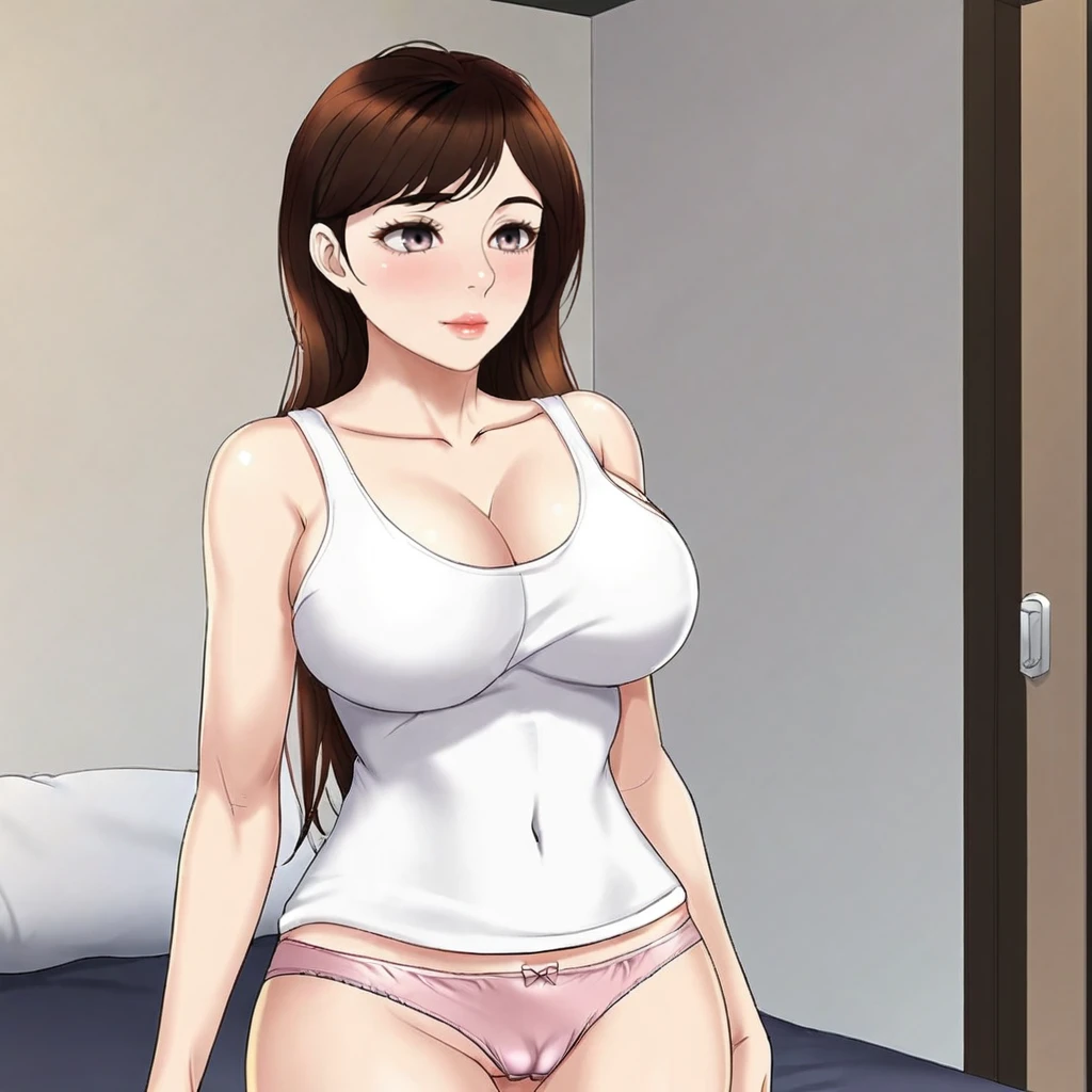 Trigger with pink panties: YeonSu, 1girl, large breasts, underwear, pink panties, cameltoe, long hair, brown hair, cleavage, white tank top, collarbone, lips, thighs, bow panties, bangs, brown eyes, thigh gap, bare shoulders, covered navel, curvy, shirt, cowboy shot