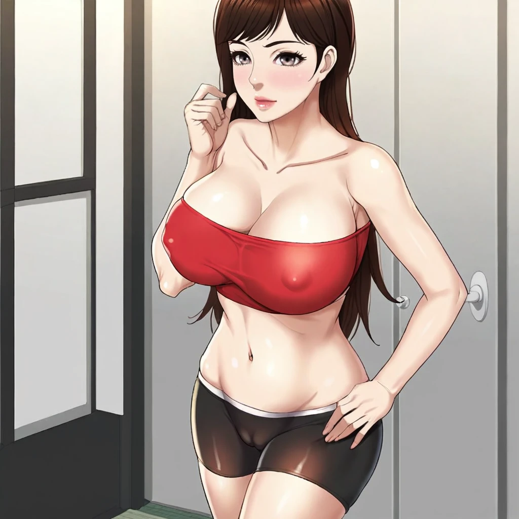 Trigger with tube top: YeonSu, 1girl, large breasts, long hair, brown hair, cleavage, navel, covered ???????, strapless, midriff, bike shorts, bare shoulders, tube top, lips, collarbone, brown eyes, bangs, black shorts, cowboy shot