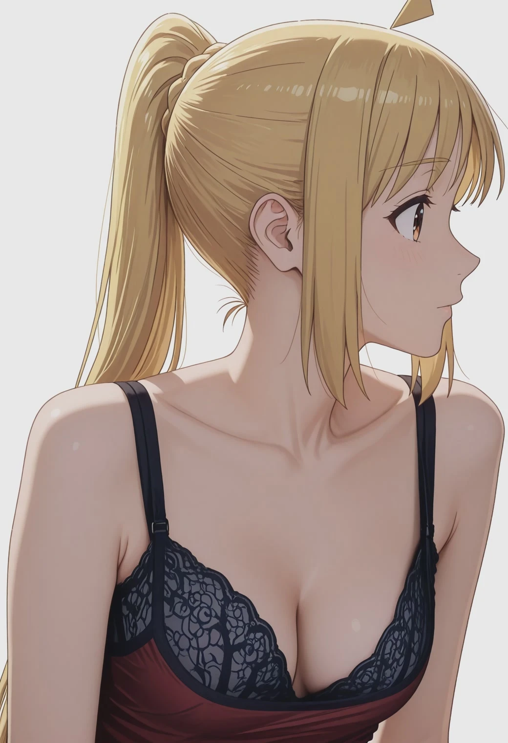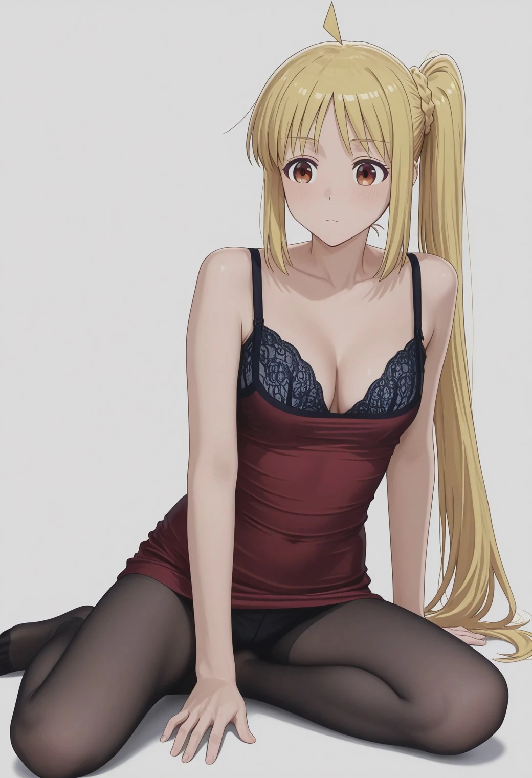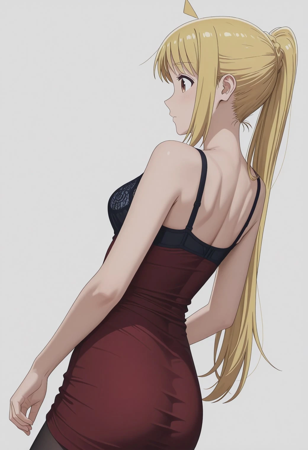 bjreddressvisiblebra, red dress, breasts, cleavage, collarbone, pantyhose, bare shoulders, black bra,
